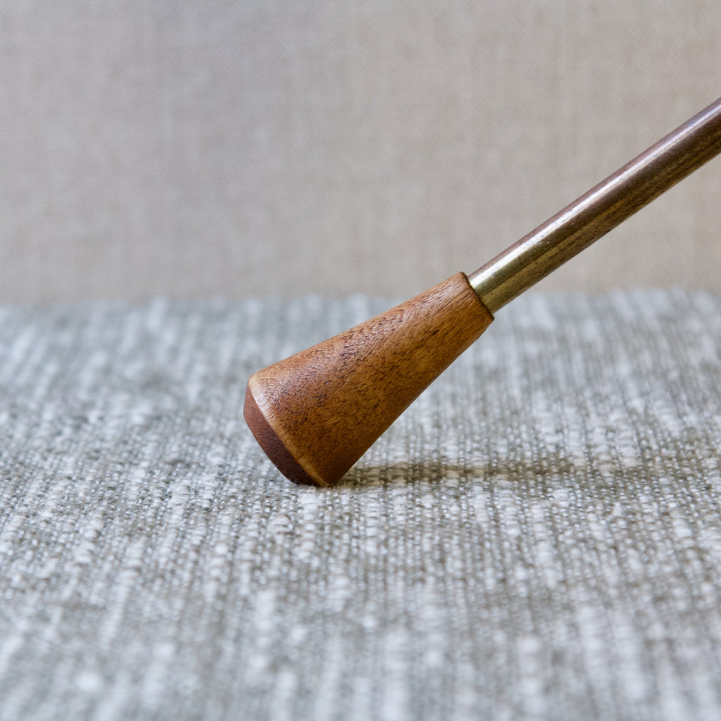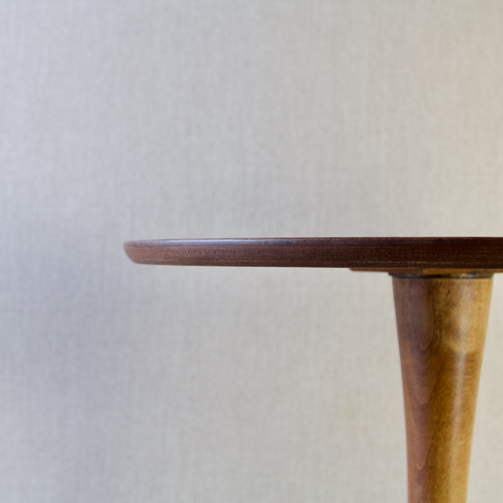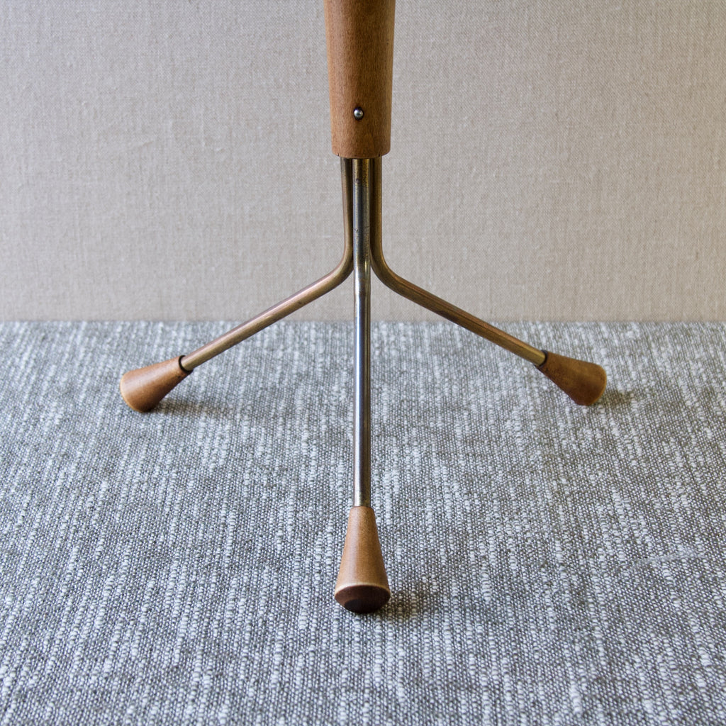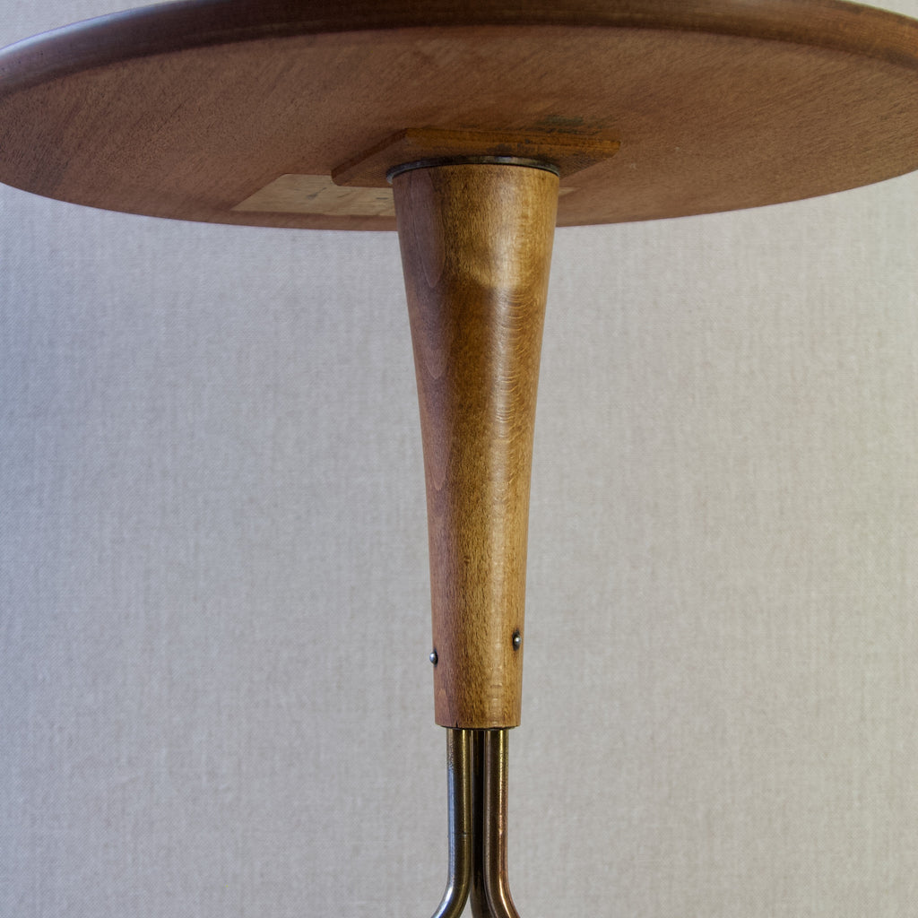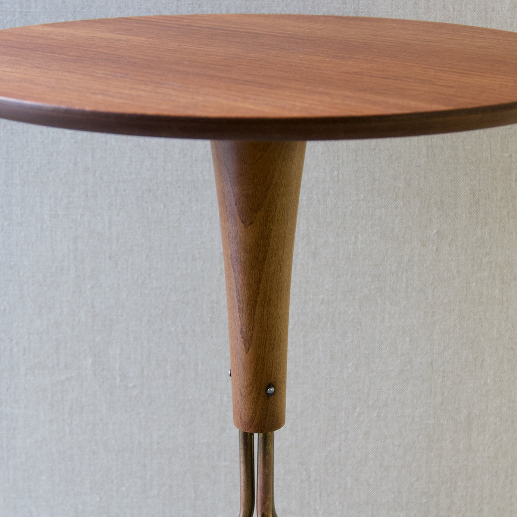 The tabletop is cross grain laminated plywood with a teak veneer. Beneath this is a section of tapered wood from which extends three brass-plated metal legs. Capping the end of each of the metal legs are solid wood shoes, which mimic the tapered shaped of the central shaft.