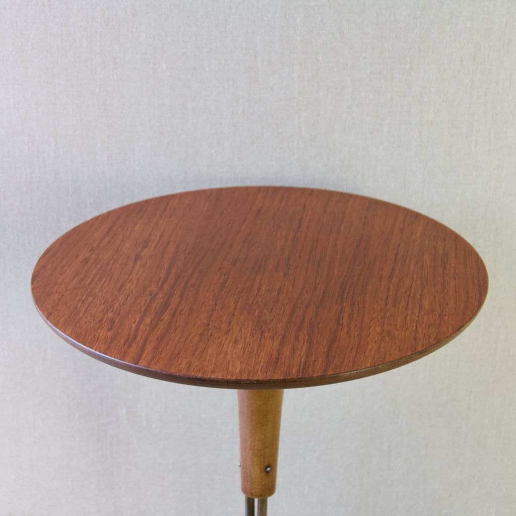 A petite tripod table in teak and metal designed by Albert Larsson, 1959. A carpenter and furniture maker, Larsson established his own business specializing in functional furniture in Tibro, Sweden, 1938.