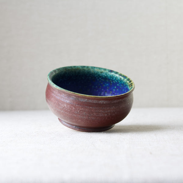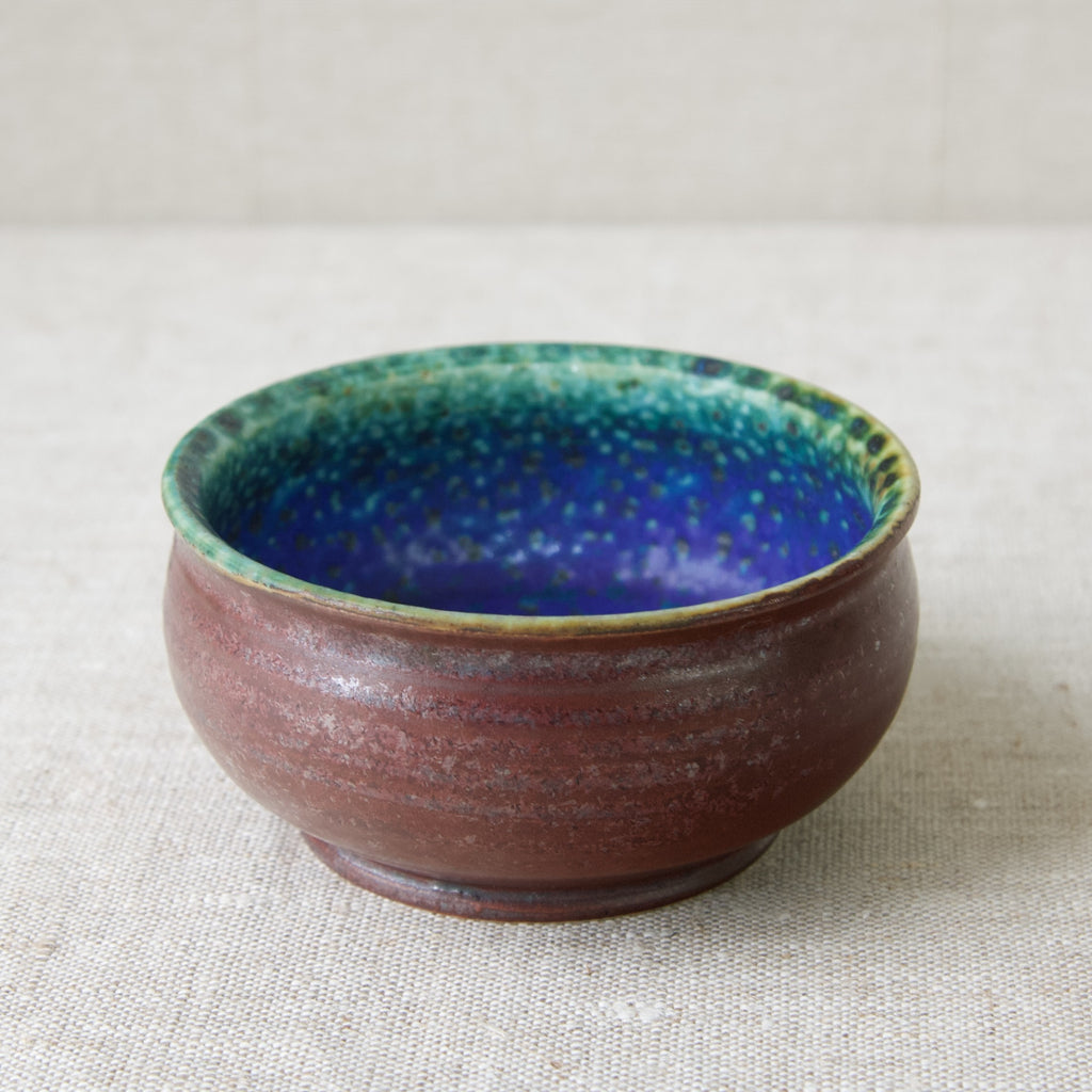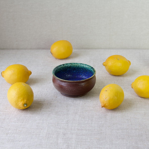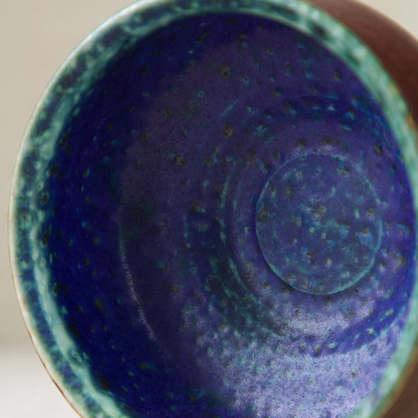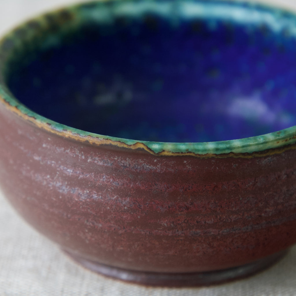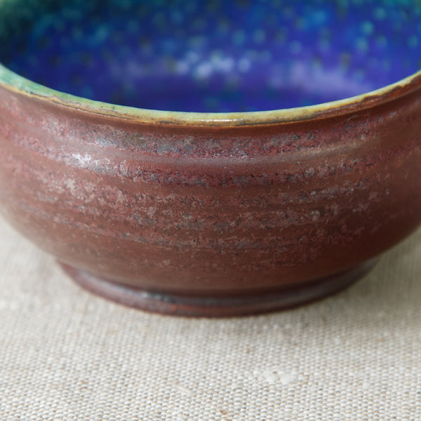 The interior of this tactile piece features a richly textured cobalt glaze. The pitted glaze is vibrant blue with delicate shades of aqua, green & ochre. The bright interior is contrasted with a copper-brown lustre applied to the bowl's outside; this rich reddish-brown glaze contains oxides, lending a subtle sheen.