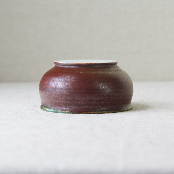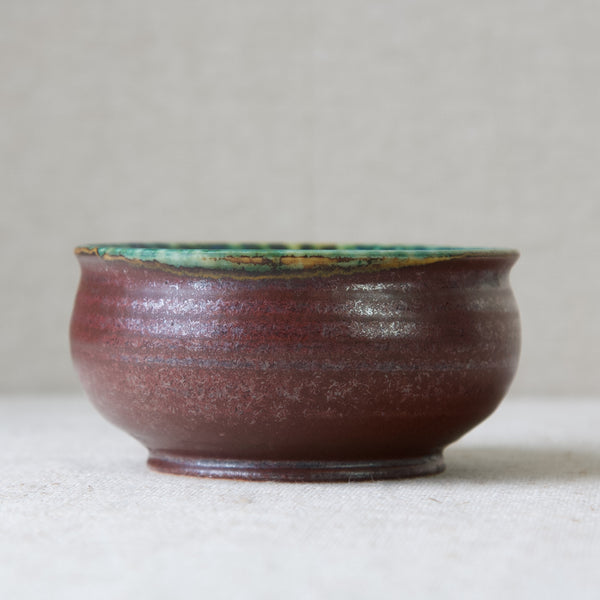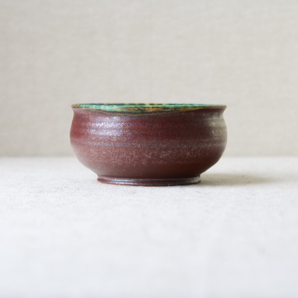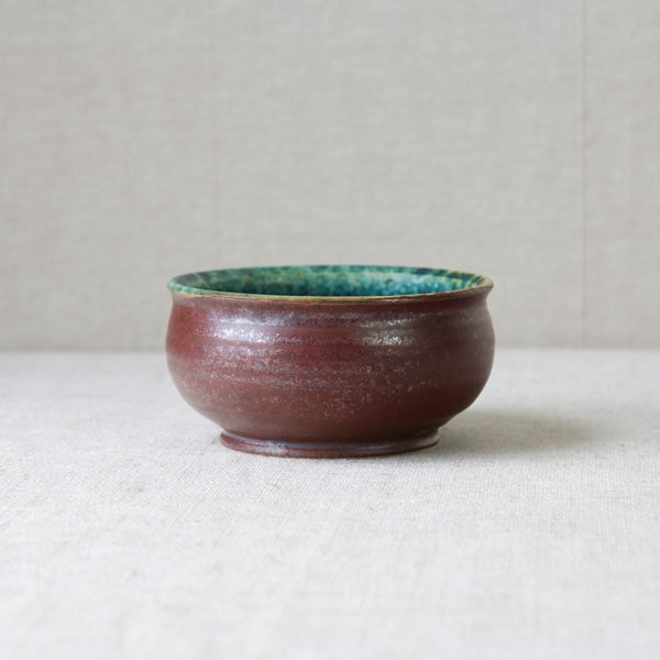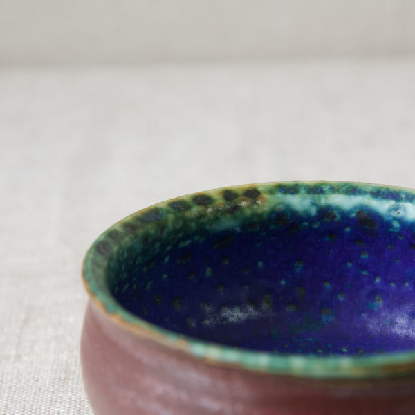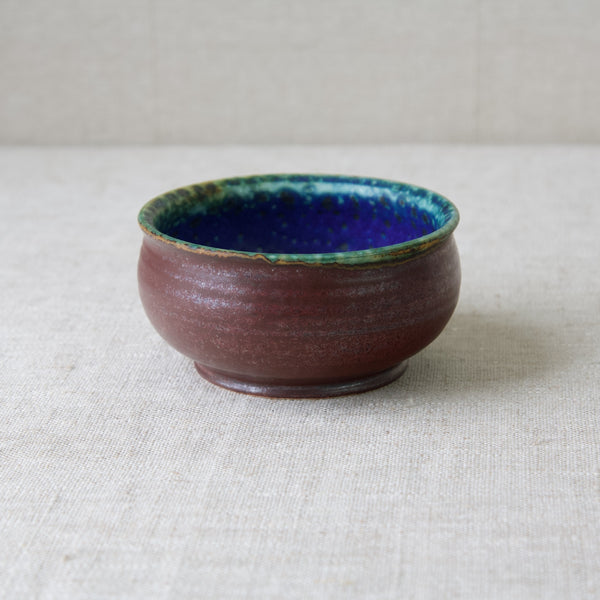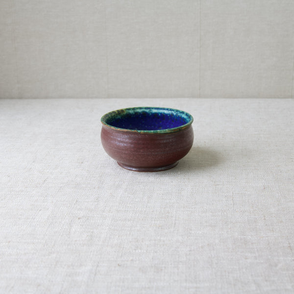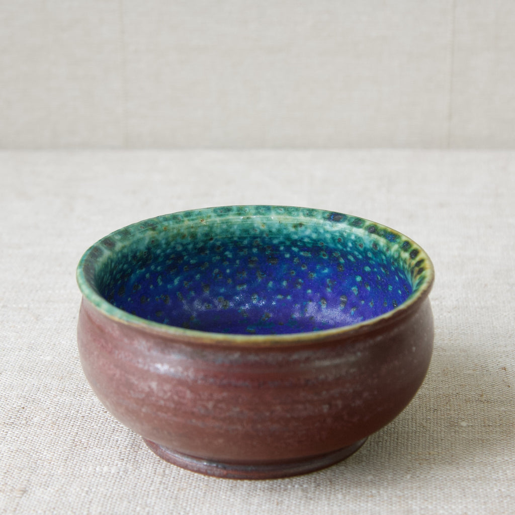 The interior of this tactile piece features a richly textured cobalt glaze. The pitted glaze is vibrant blue with delicate shades of aqua, green & ochre. The bright interior is contrasted with a copper-brown lustre applied to the bowl's outside; this rich reddish-brown glaze contains oxides, lending a subtle sheen.