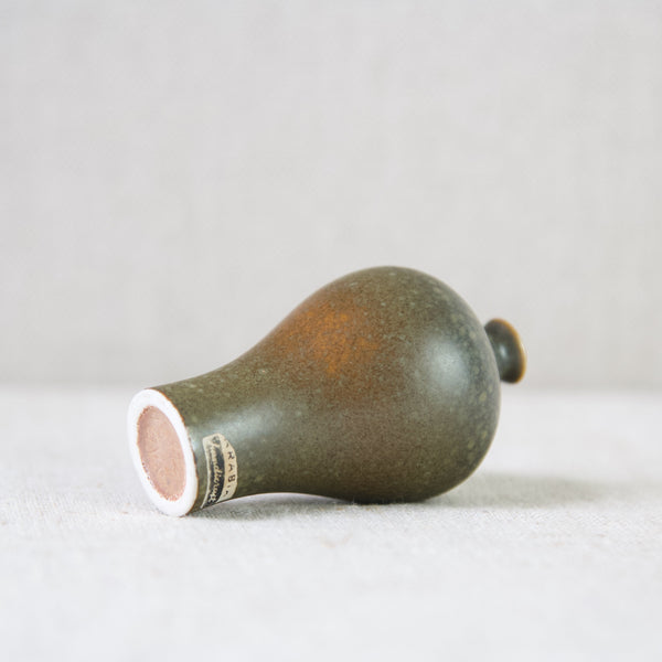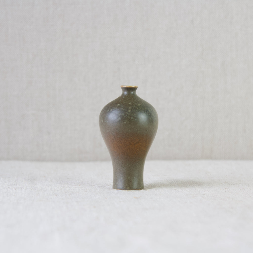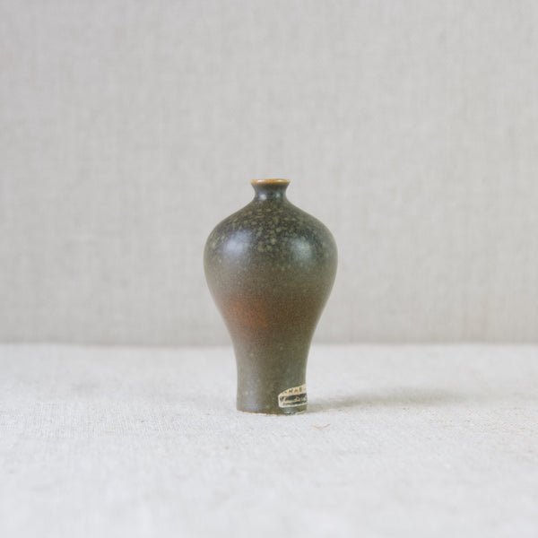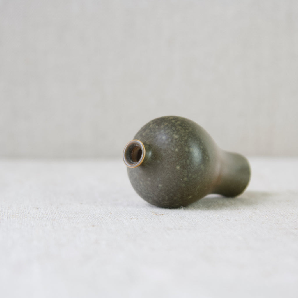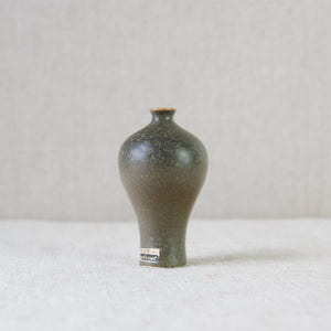 This vase is part of this series, and features an earthy & intricate glaze of dark, mossy green with dappled browns & red ochre. The attractive shape takes inspiration from ancient Chinese ceramics; Hovisaari gently exaggerates the form of an ancient 'Meiping' (plum) vase, resulting in a delightful & collectable example of Modernist Nordic design.