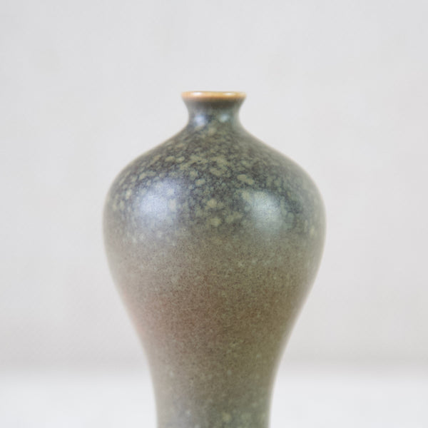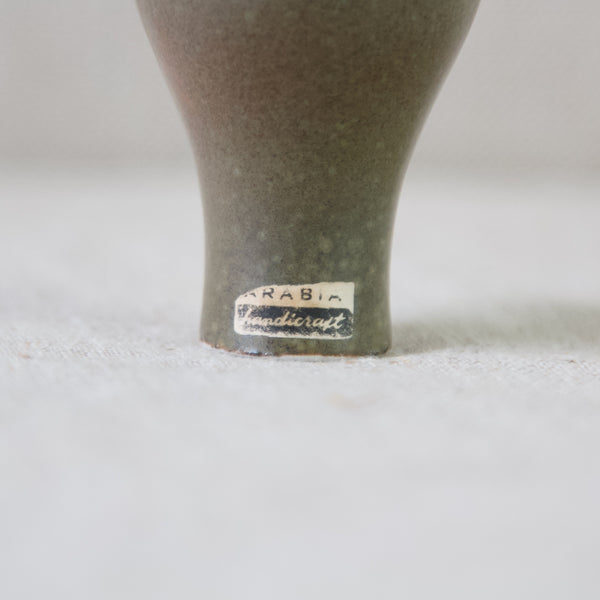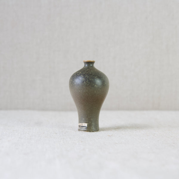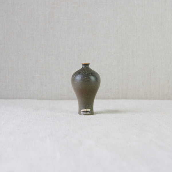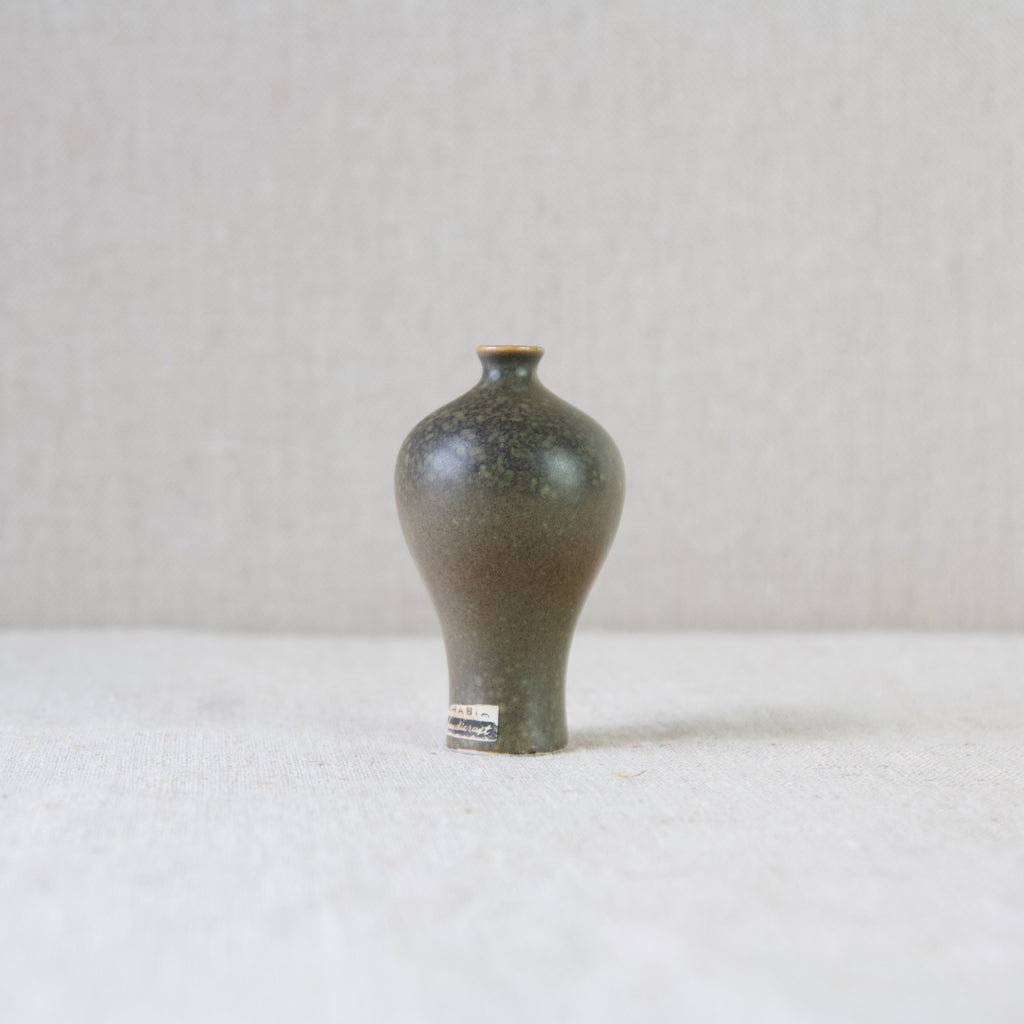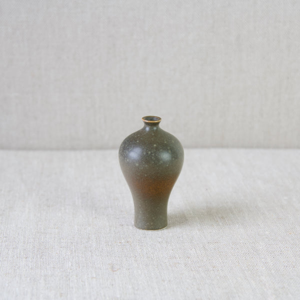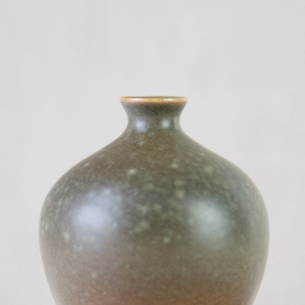 This vase is part of this series, and features an earthy & intricate glaze of dark, mossy green with dappled browns & red ochre. The attractive shape takes inspiration from ancient Chinese ceramics; Hovisaari gently exaggerates the form of an ancient 'Meiping' (plum) vase, resulting in a delightful & collectable example of Modernist Nordic design.