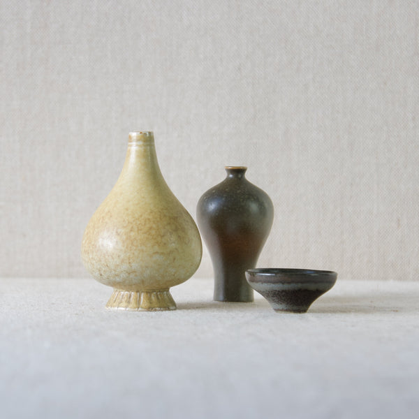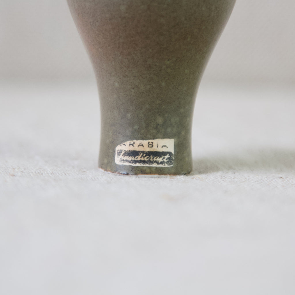 Annikki Hovisaari began her career in Arabia’s department of industrial art in 1949, where she predominantly designed decorative items for large scale production. She designed a small amount of handmade items too, including a series of delightful miniature vases with undulating forms.