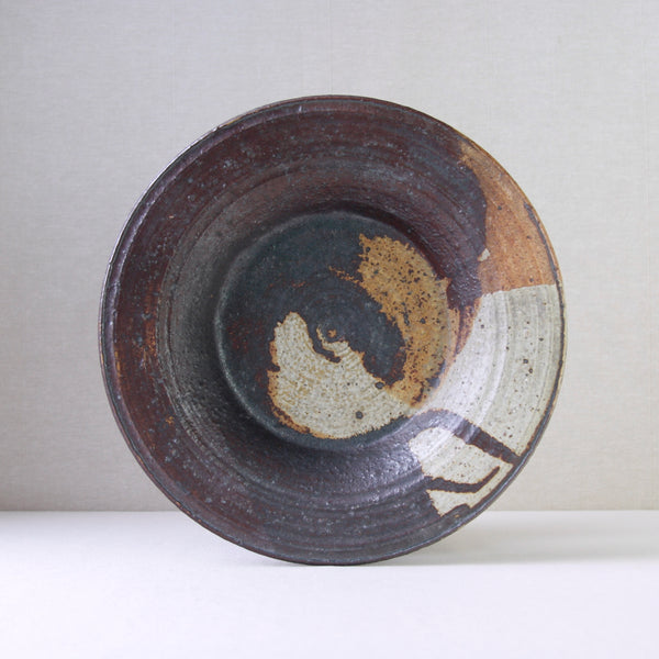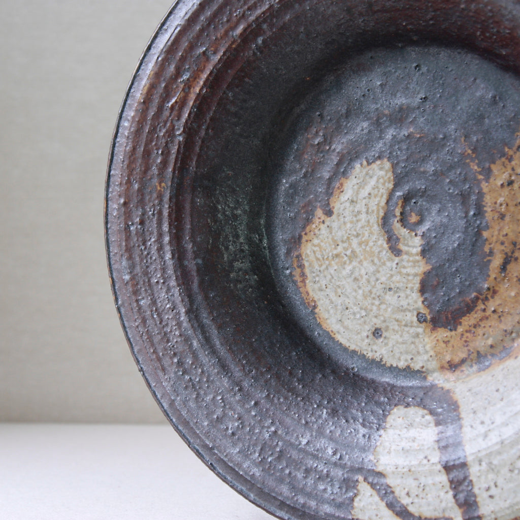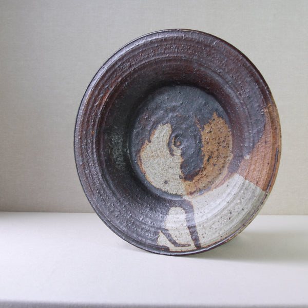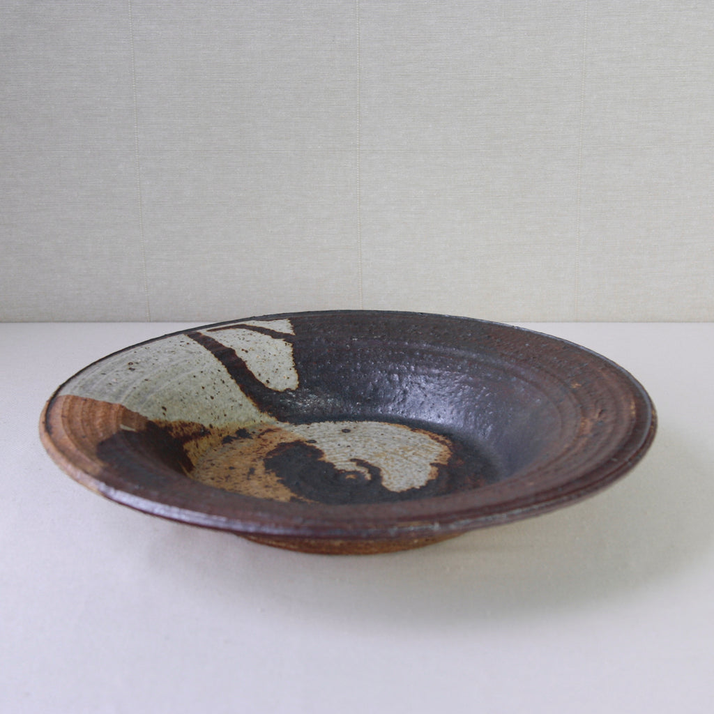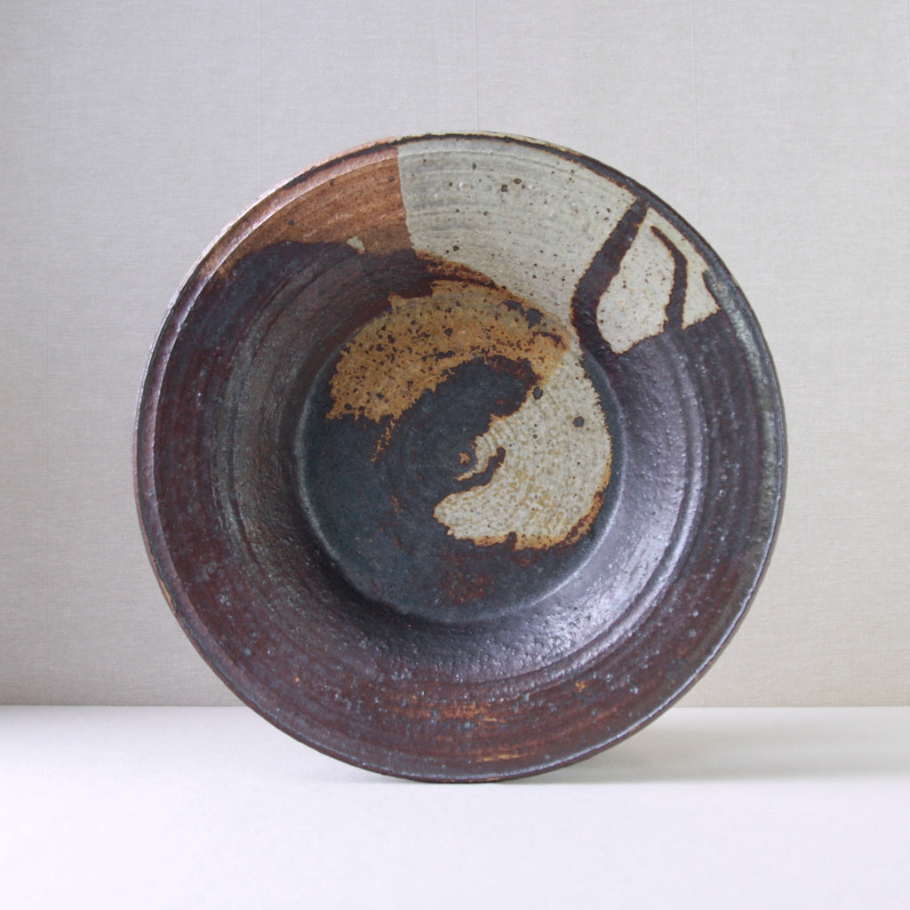 This sizeable flat-out bowl features a radiant iron-rich glaze with hues of amber, orange, brown & white. To modern eyes, the finish isn’t obviously colourful, although, the 1970's audience it was made for would have deemed this art piece incredibly dynamic, chic & audacious. Design inspired by antiquity, nature, and muted earthy tones were extremely popular by the mid-1970s, linked to the international surge in environmentalism.