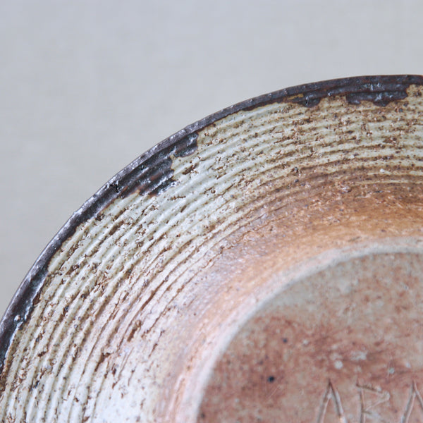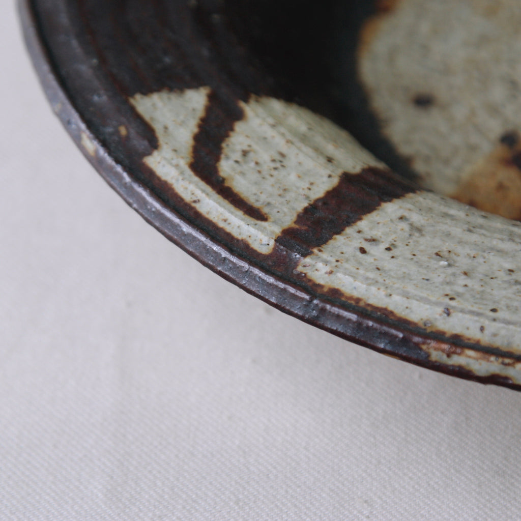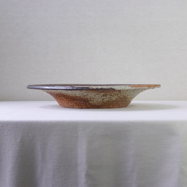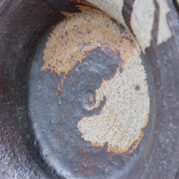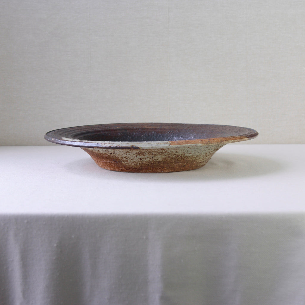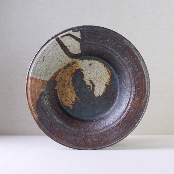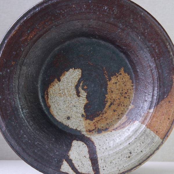 This sizeable flat-out bowl features a radiant iron-rich glaze with hues of amber, orange, brown & white. To modern eyes, the finish isn’t obviously colourful, although, the 1970's audience it was made for would have deemed this art piece incredibly dynamic, chic & audacious. Design inspired by antiquity, nature, and muted earthy tones were extremely popular by the mid-1970s, linked to the international surge in environmentalism.
