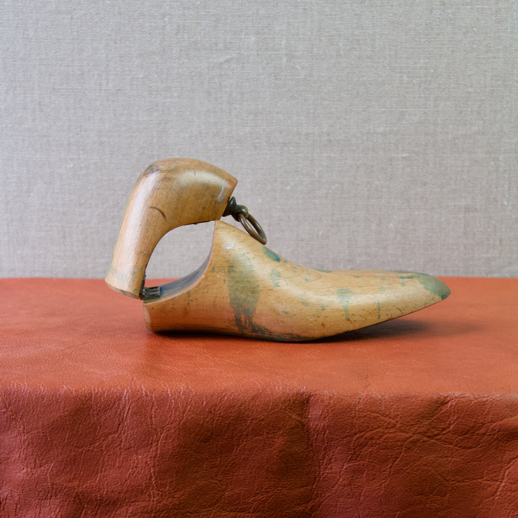 An antique solid wood shoe tree splattered with turquoise paint. Sometimes called a shoe 'last' or 'stretcher', this item was made bespoke for an individual by the English luxury department store Fortnum & Mason, Piccadilly, circa 1910.
