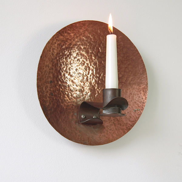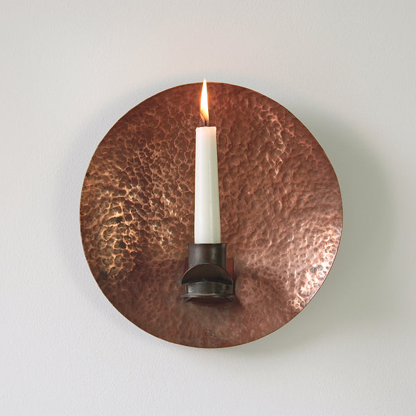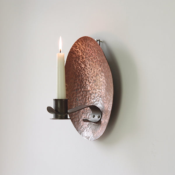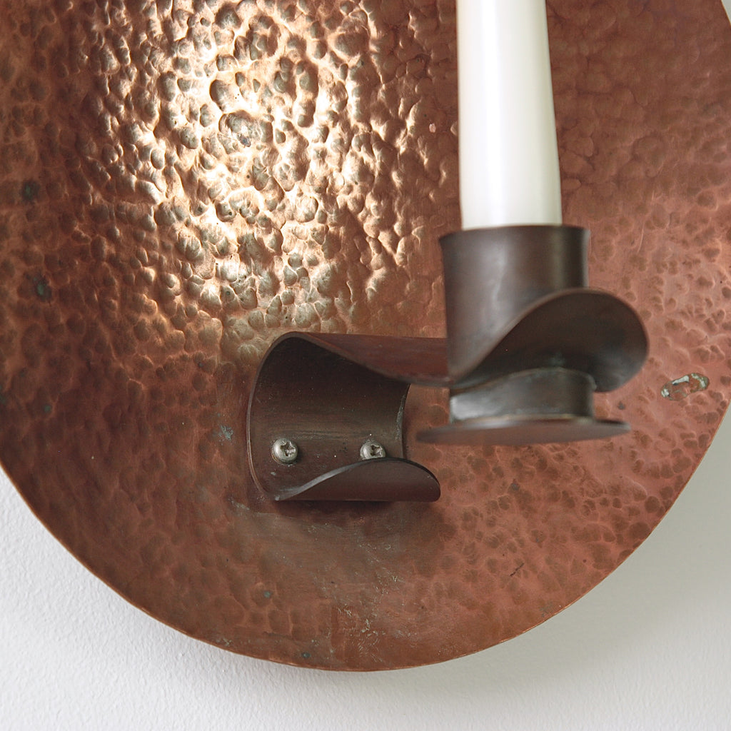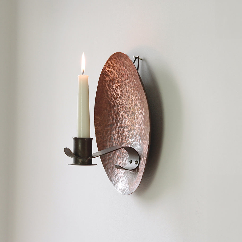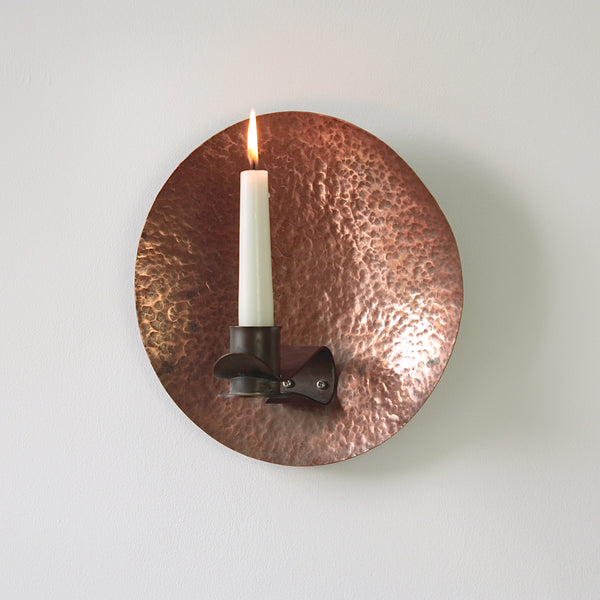 The shape of the main body of this sconce is a circle, and the form is concave. The entirety of the disk shaped backplate is hammered copper. Under candlelight, this creates a stunning light effect; a mesmerising interplay of shadows and radiance.