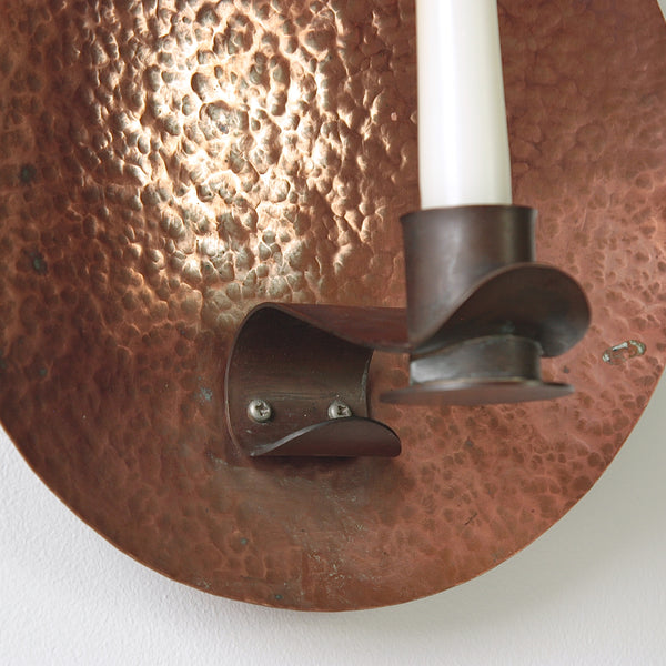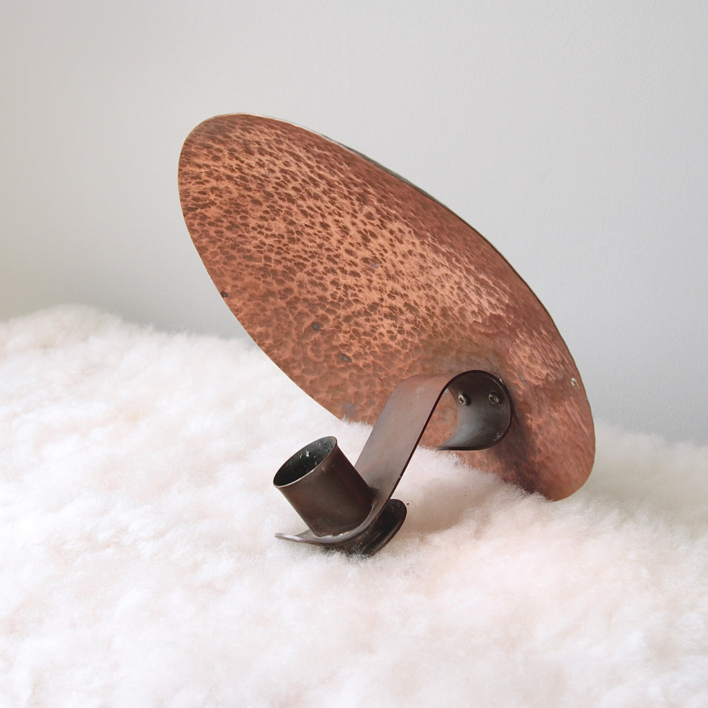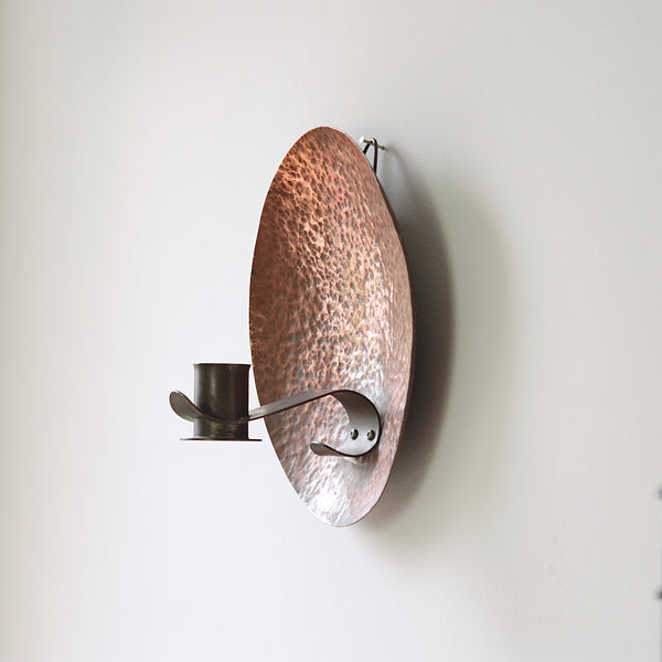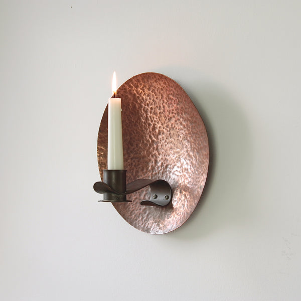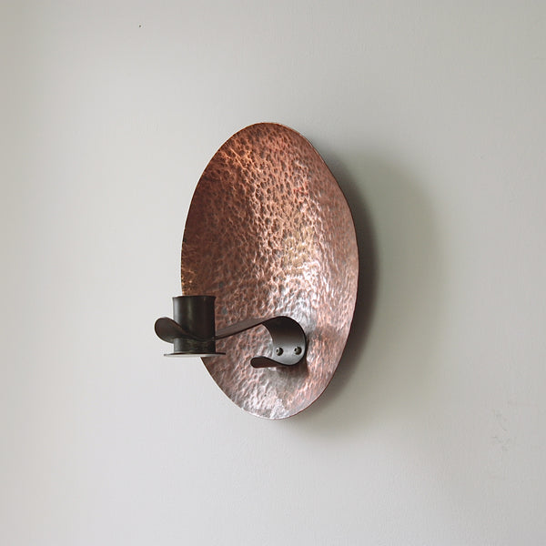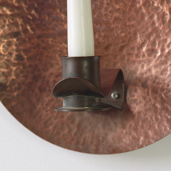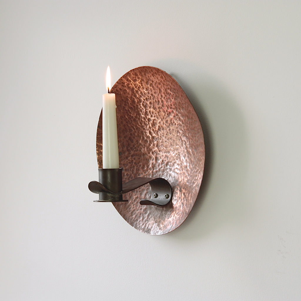 The shape of the main body of this sconce is a circle, and the form is concave. The entirety of the disk shaped backplate is hammered copper. Under candlelight, this creates a stunning light effect; a mesmerising interplay of shadows and radiance.