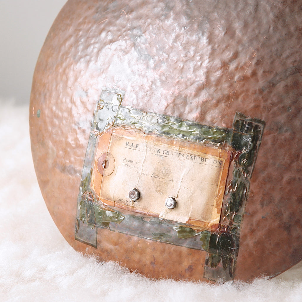 Verso of a hammered arts and crafts copper wall sconce,  that was shown in an Arts & Crafts Exhibition Society exhibition,.