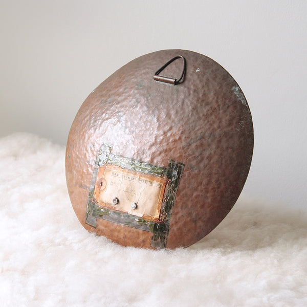 Circular copper wall sconce from 1910, showcasing early 20th-century British arts & crafts design.