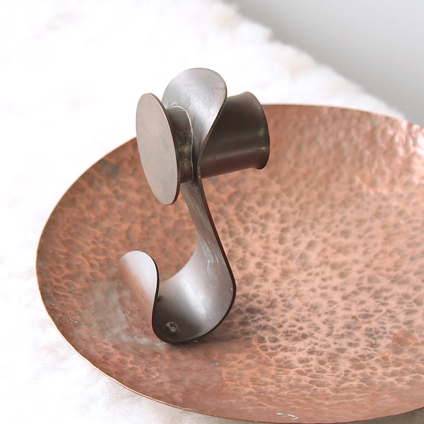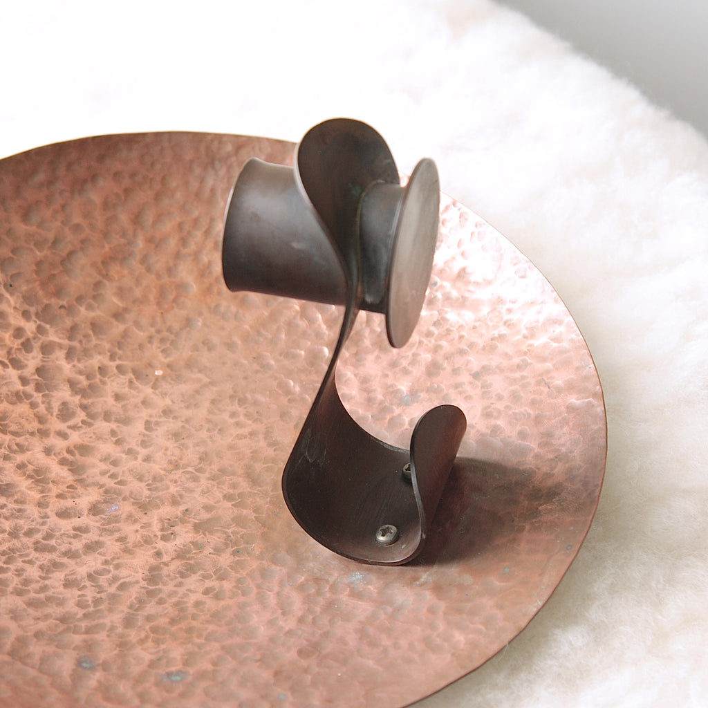 Reverse side of a hand beaten hammered copper wall sconce for a canlde, designed and made in early 20th-century Britain during the arts & crafts movement.