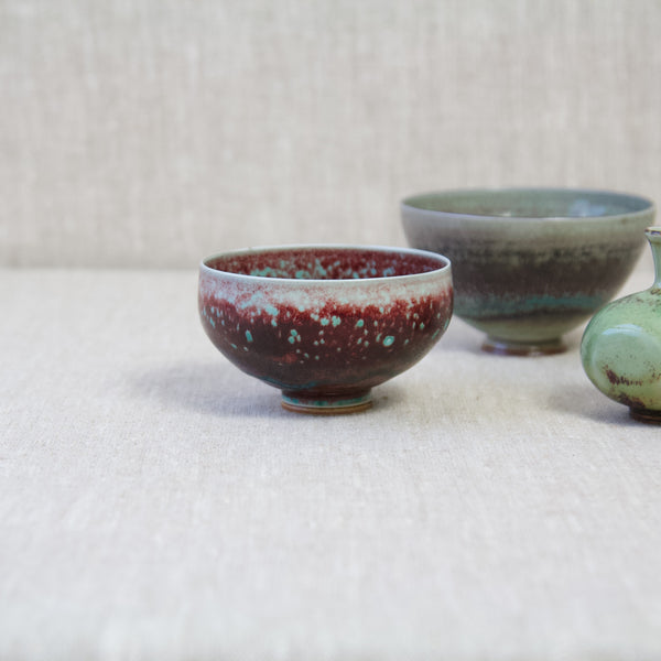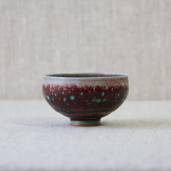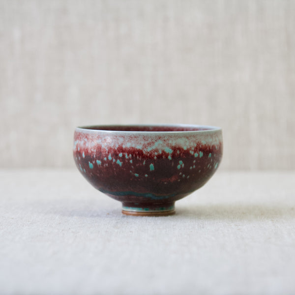 This decorative bowl was handmade by Friberg in 1964. The footed form is both delicate and tactile, and features a strikingly varied red 'Oxblood' glaze.