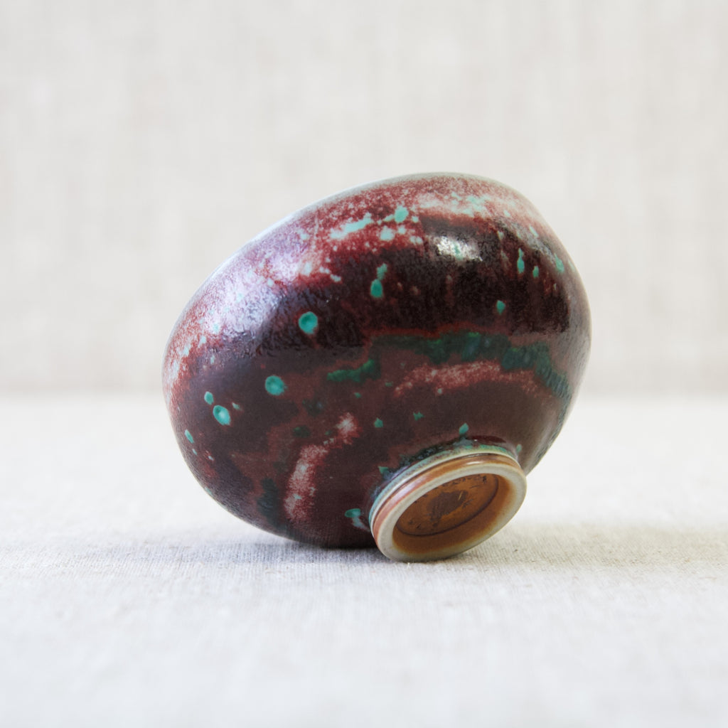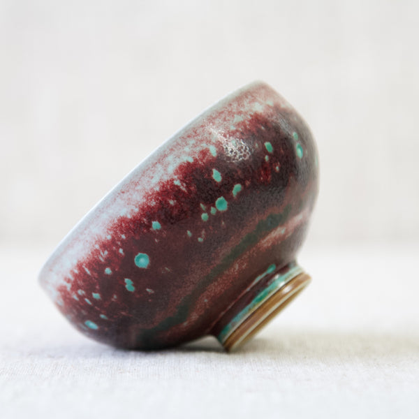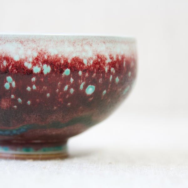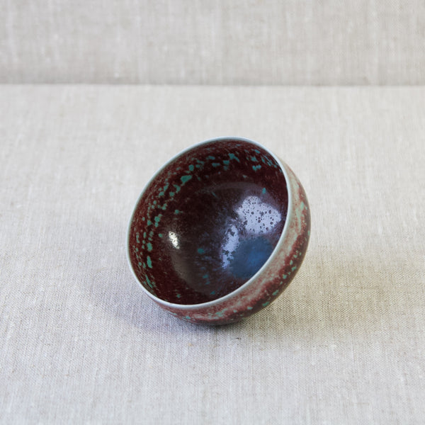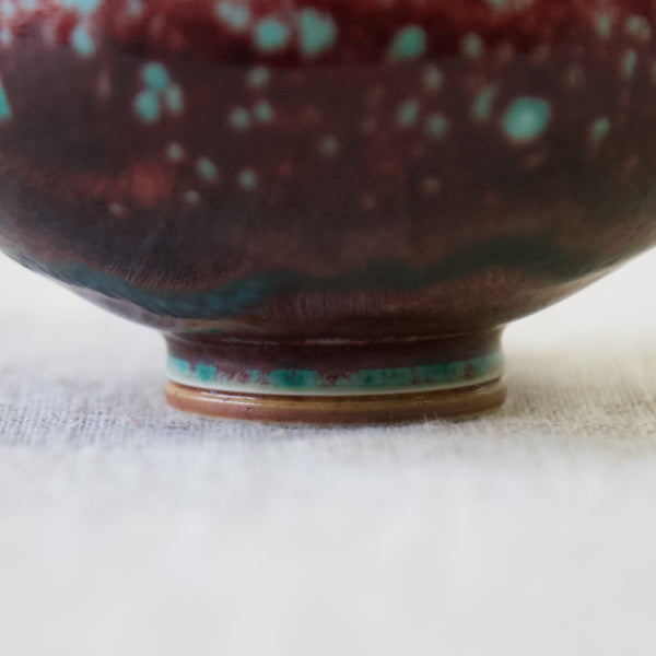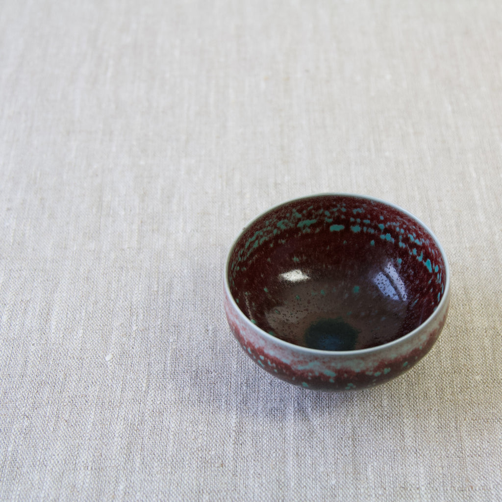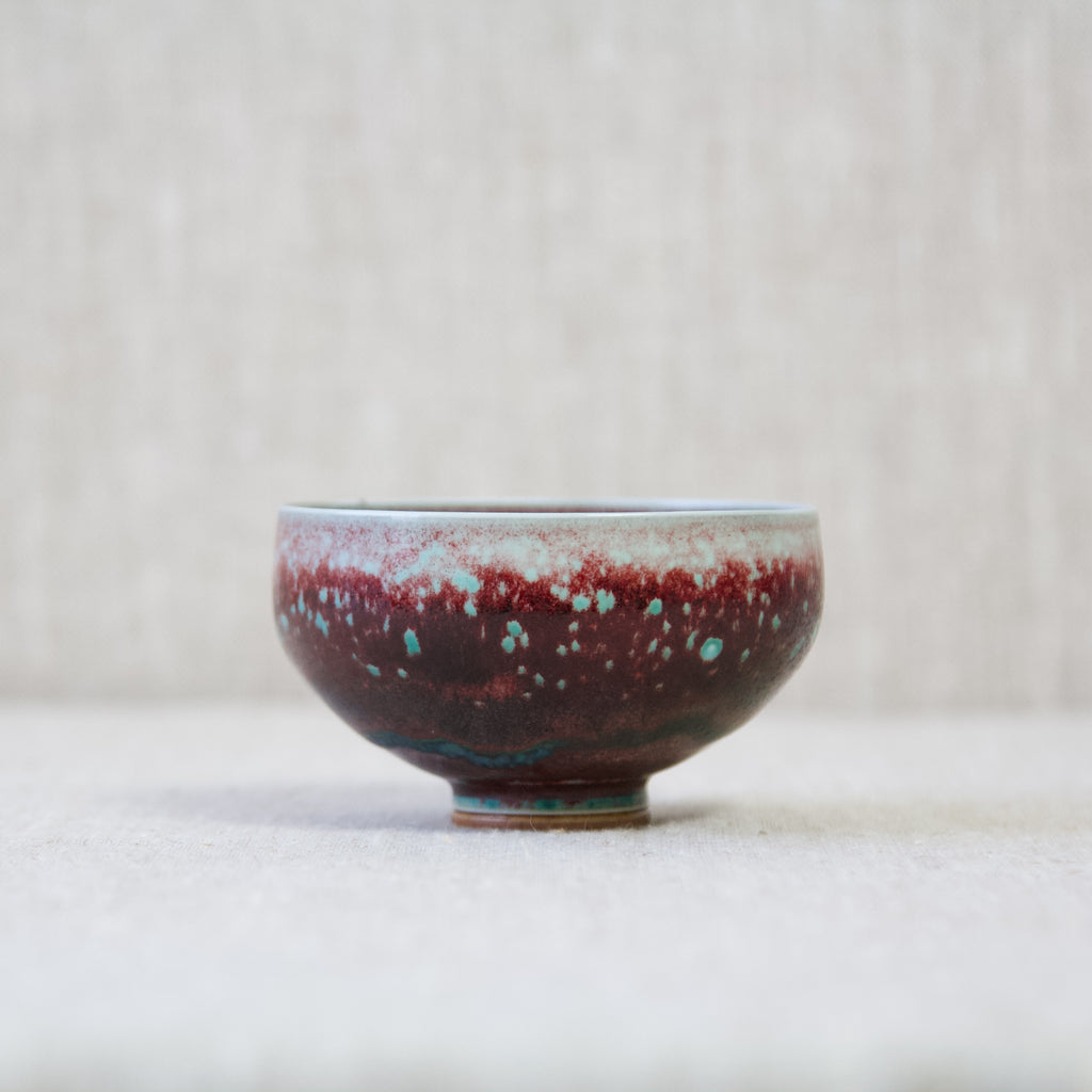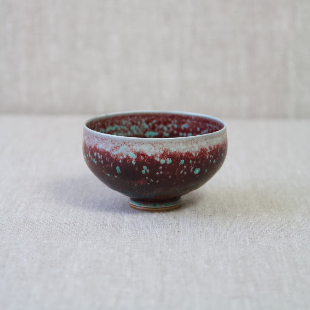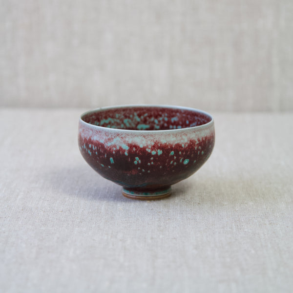 Friberg's vibrant, dappled version of 'Sang de Boeuf' features unconventional colourful flecks of bright turquoise blue. The deep red and bright blue colours work harmoniously together to create a highly attractive effect. Further to the visual beauty of the object and the technical ability of the potter, the bowl features a delicate degradé towards the rim where the deep red colour fades to pale grey.
