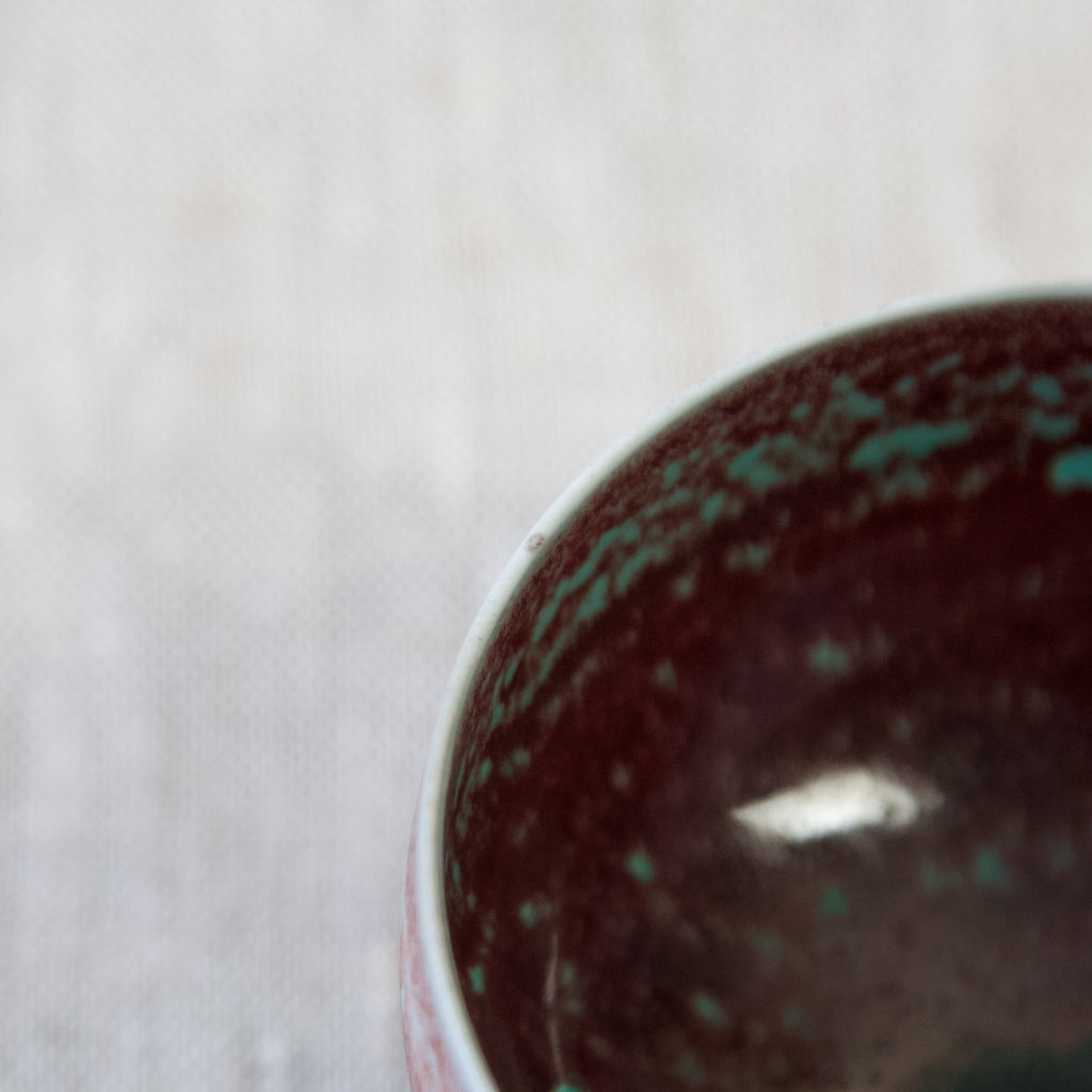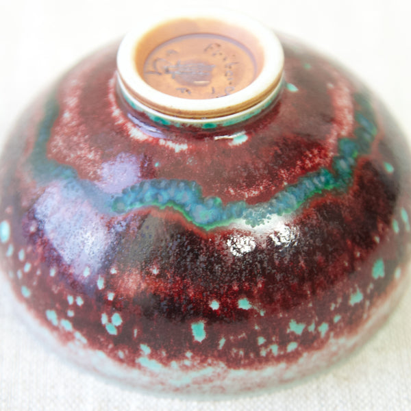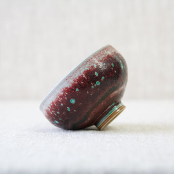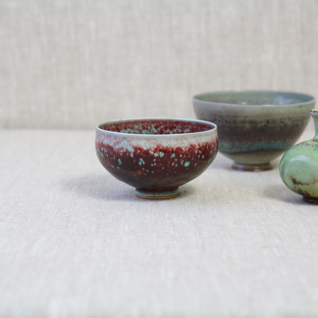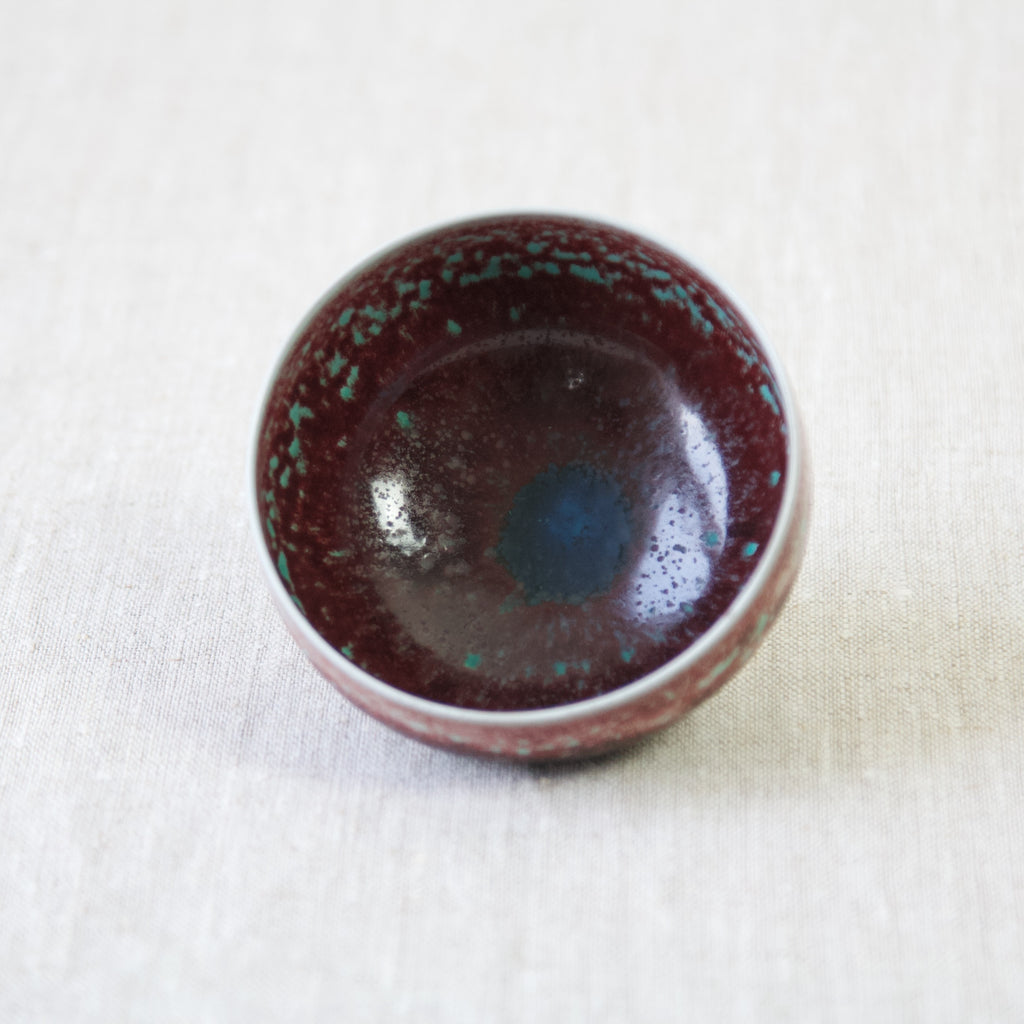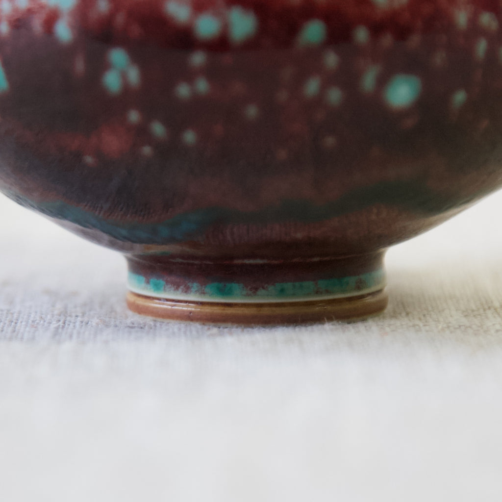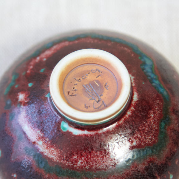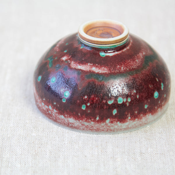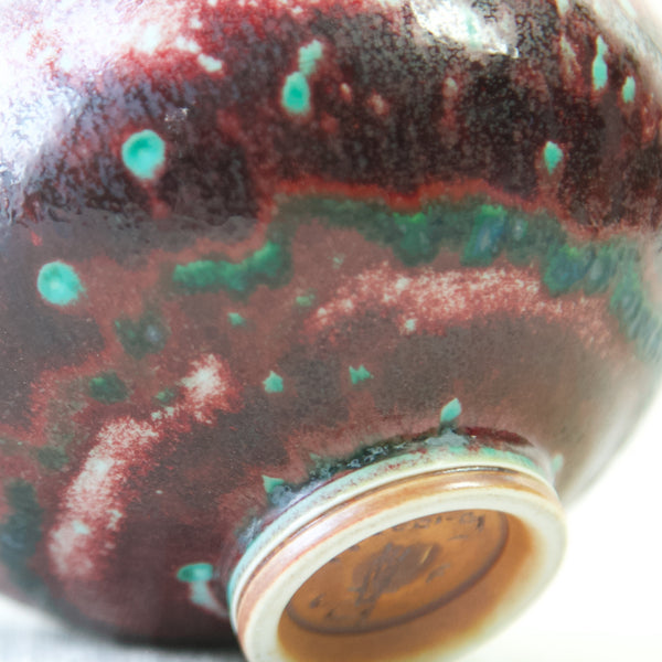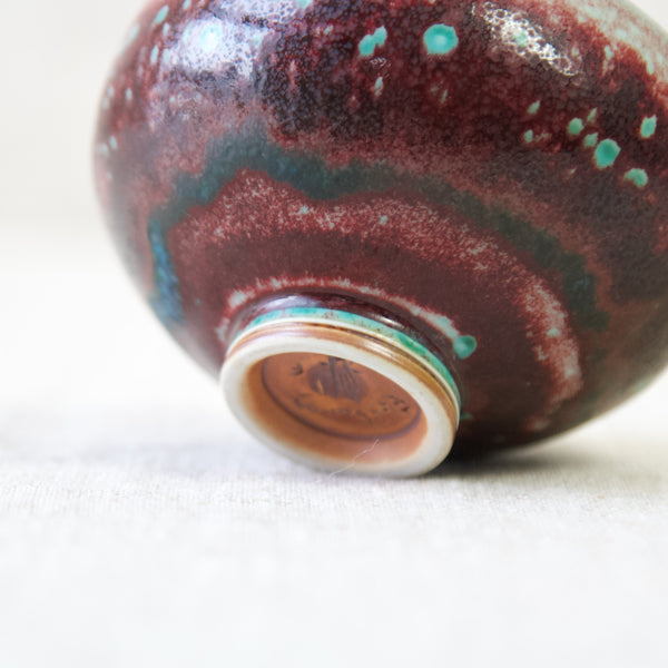 Friberg's vibrant, dappled version of 'Sang de Boeuf' features unconventional colourful flecks of bright turquoise blue. The deep red and bright blue colours work harmoniously together to create a highly attractive effect. Further to the visual beauty of the object and the technical ability of the potter, the bowl features a delicate degradé towards the rim where the deep red colour fades to pale grey.