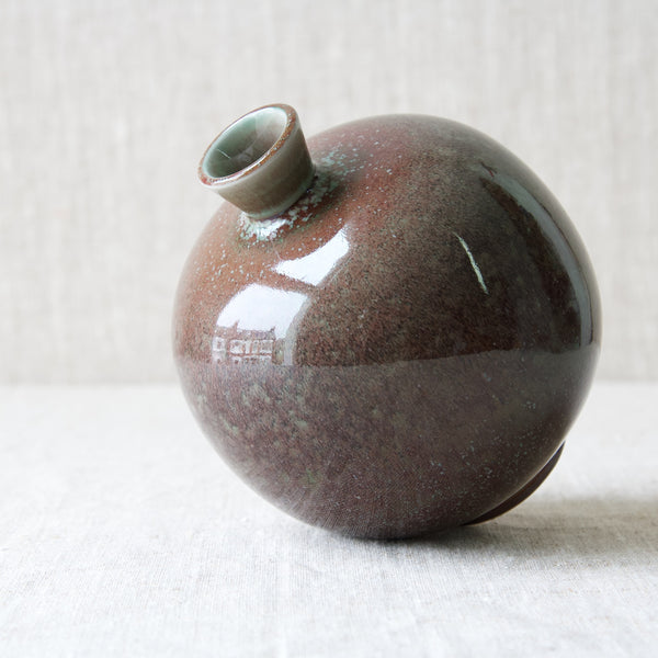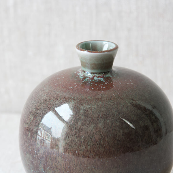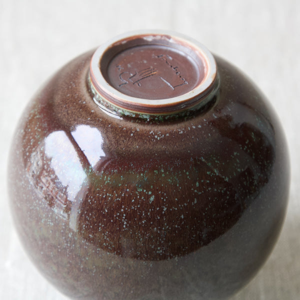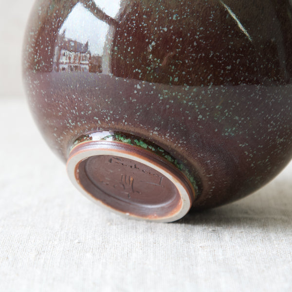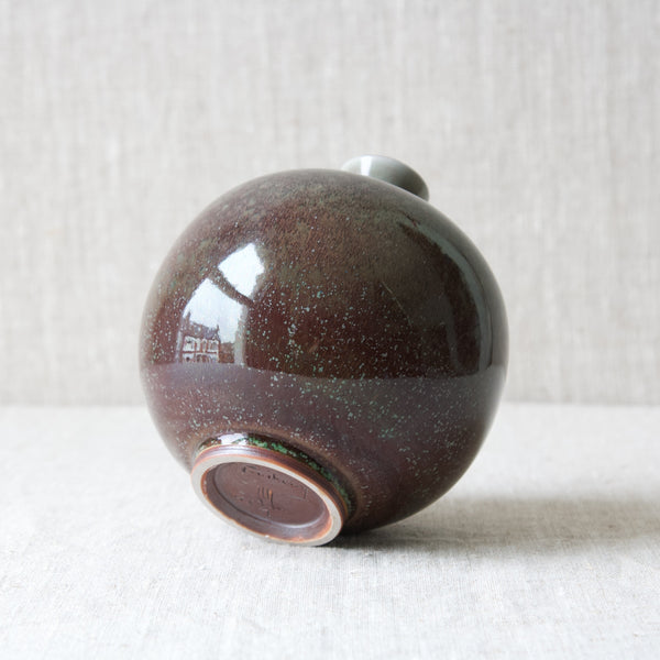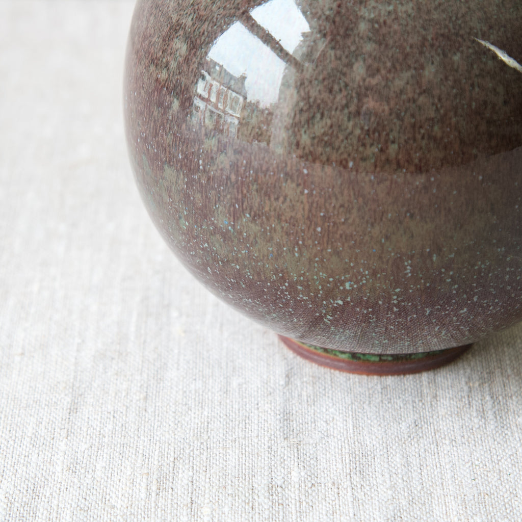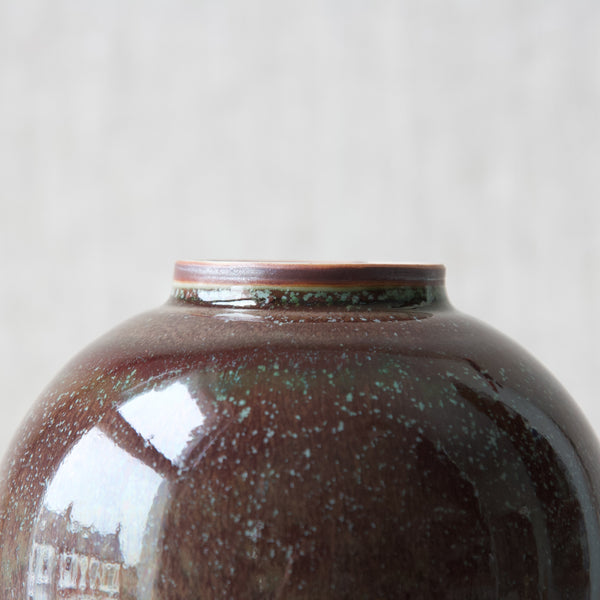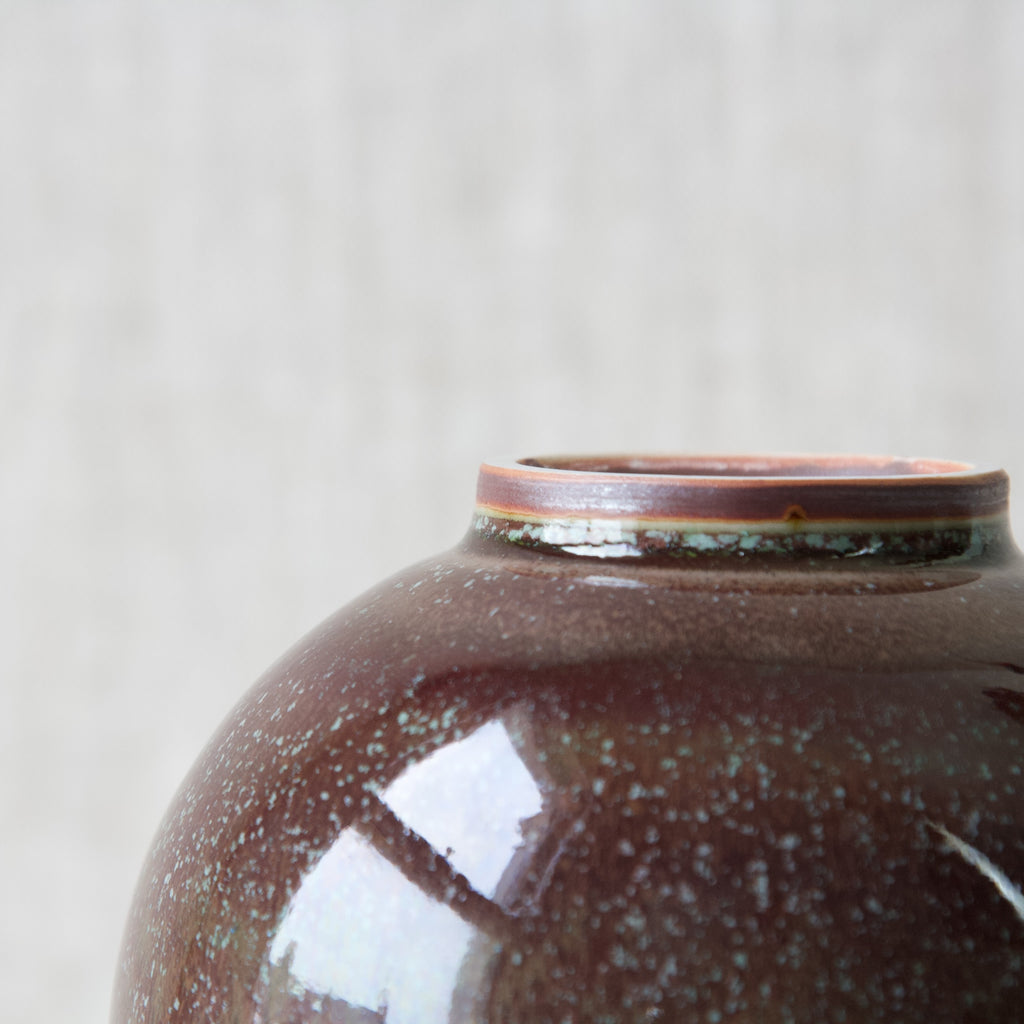 This substantial vase was handmade by Friberg in 1969, and features a delicate brown-green gloss glaze which blankets the vase in a softly dappled pattern reminiscent of fur. The earthy glaze is gently varied with areas of red, rust-orange and black, alongside speckled areas of pale grey-green.