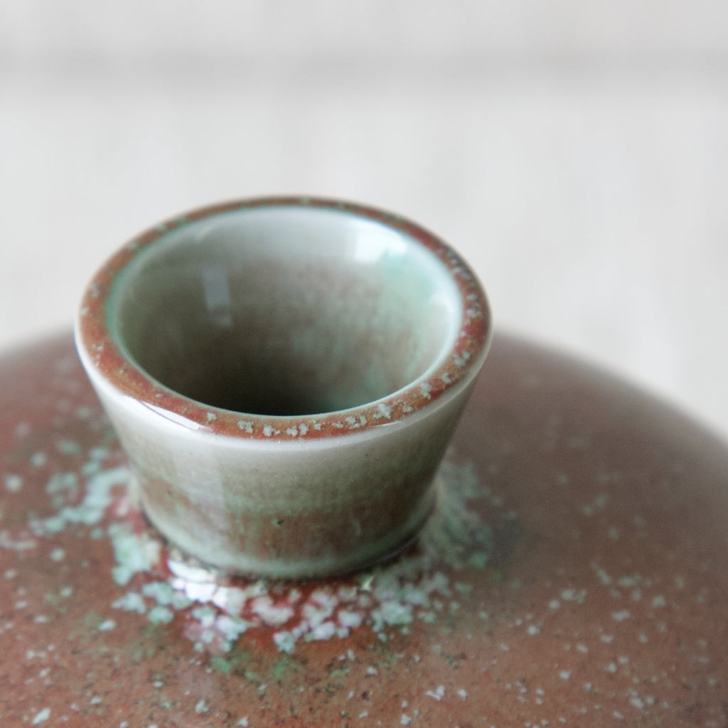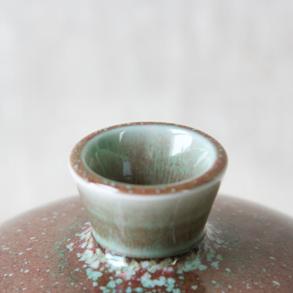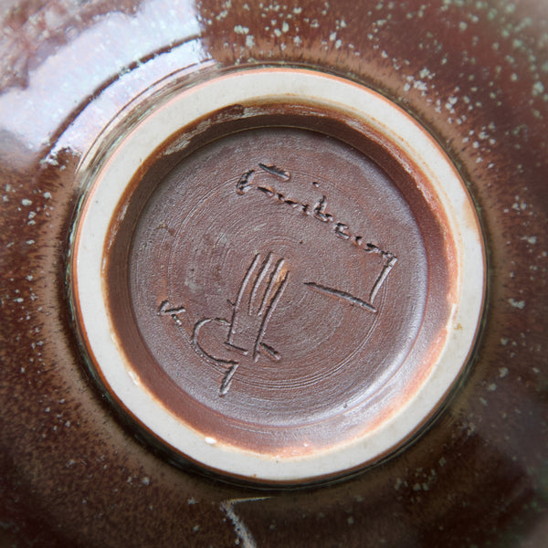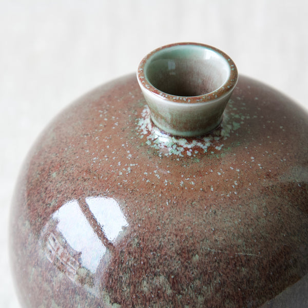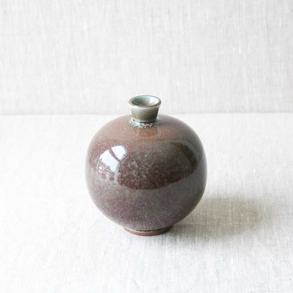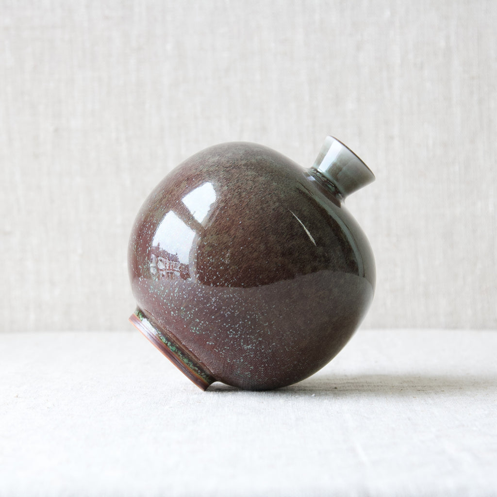 This substantial vase was handmade by Friberg in 1969, and features a delicate brown-green gloss glaze which blankets the vase in a softly dappled pattern reminiscent of fur. The earthy glaze is gently varied with areas of red, rust-orange and black, alongside speckled areas of pale grey-green.