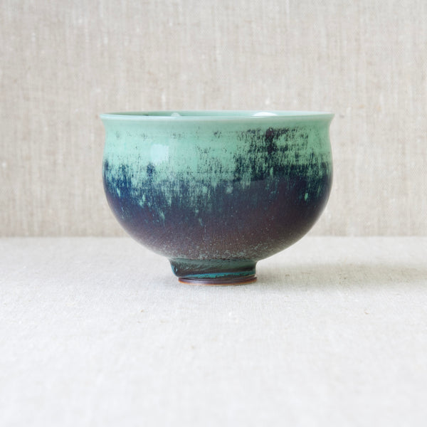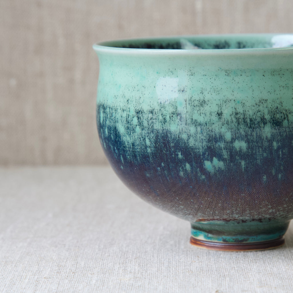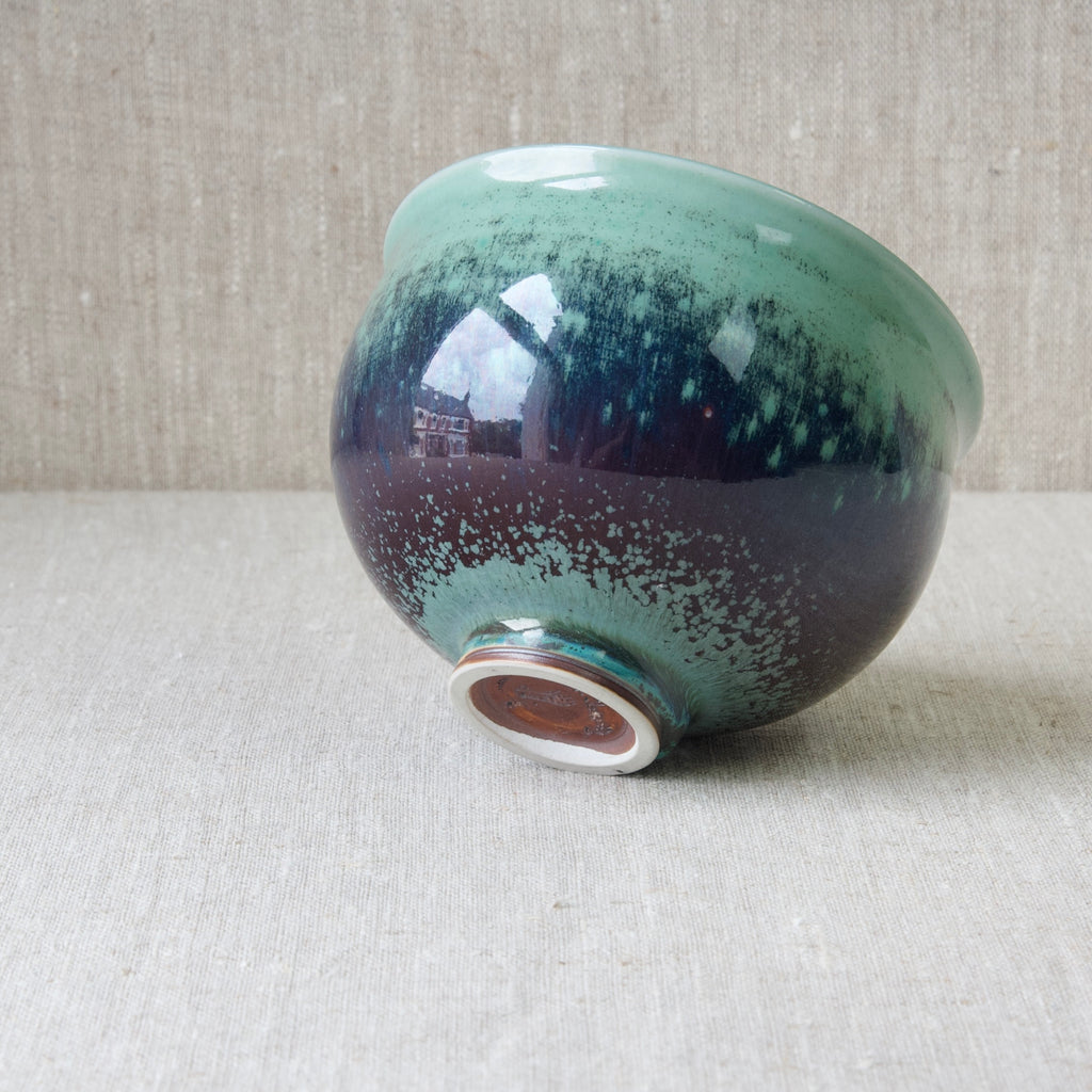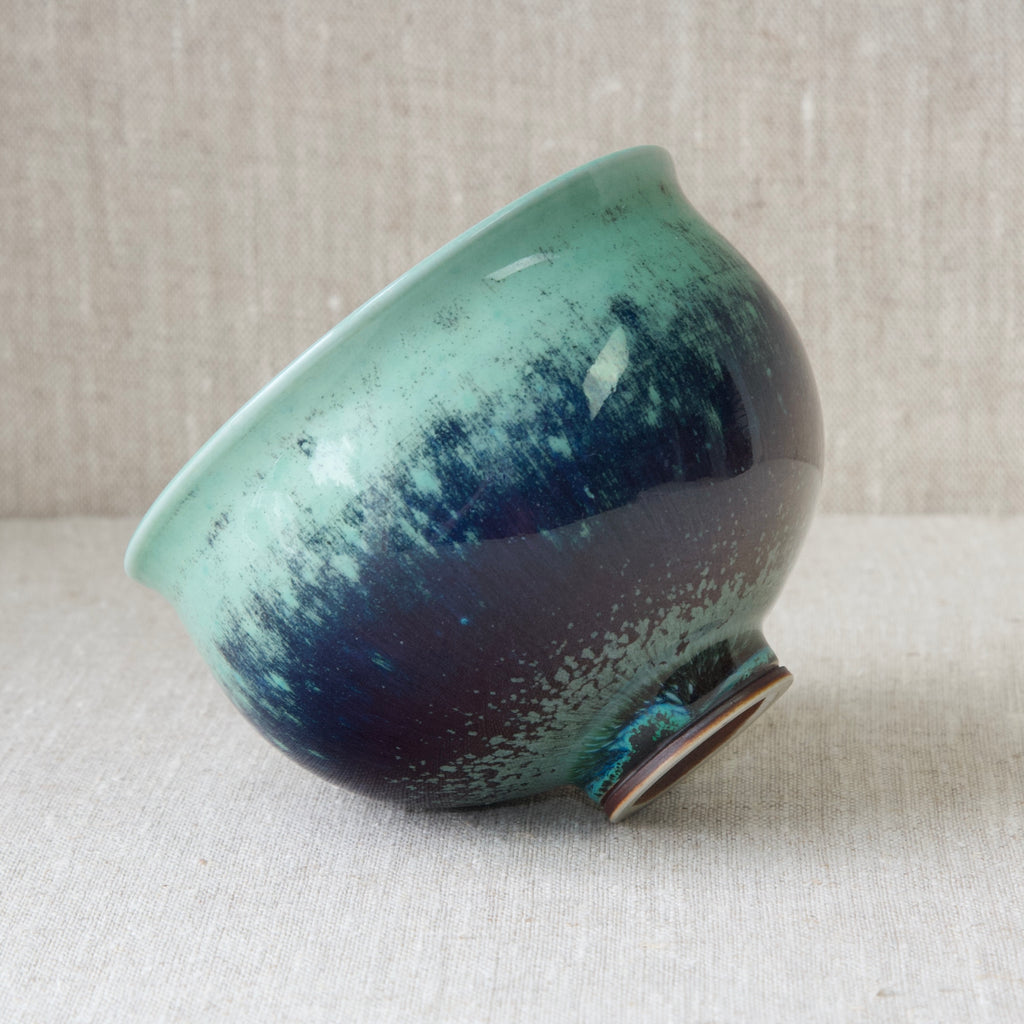 The upper section of this piece is dominated by the bright turquoise glaze, which gradually merges into navy blue. The complimentary glazes blend at the bowl's waist, creating delicately feathered areas of depth & high contrast. The nuanced navy glaze is rich & inky with subtle areas of cobalt blue, and covers two thirds of the bowls exterior. The lower part returns gently to a light turquoise glaze, but here the colours gently merge with delicate organic speckles.