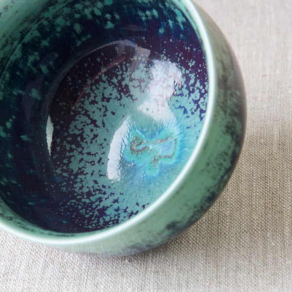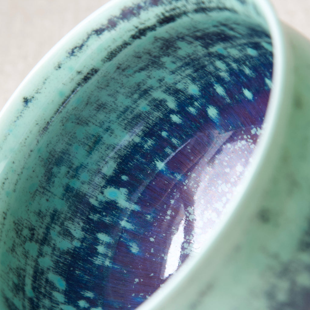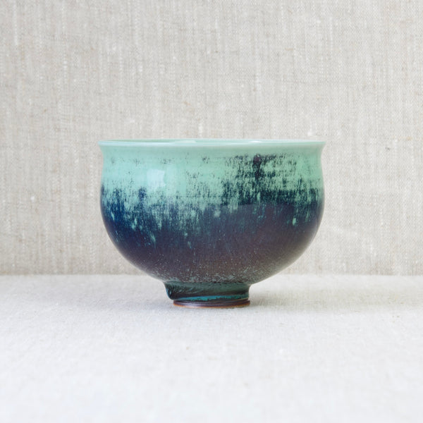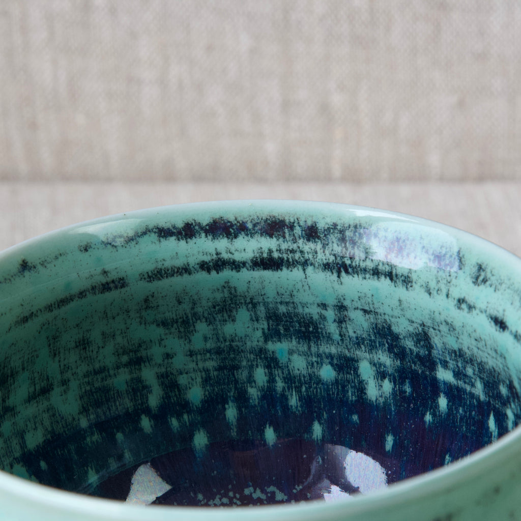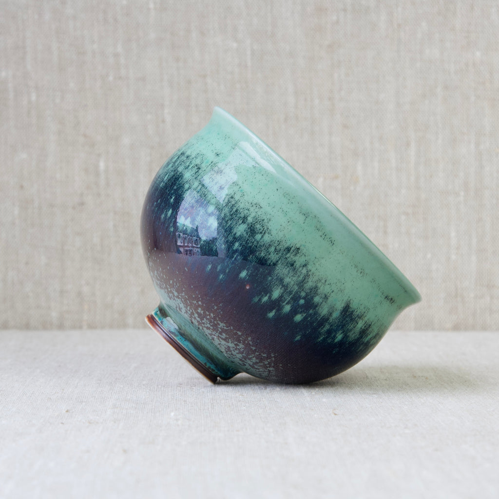 The upper section of this piece is dominated by the bright turquoise glaze, which gradually merges into navy blue. The complimentary glazes blend at the bowl's waist, creating delicately feathered areas of depth & high contrast. The nuanced navy glaze is rich & inky with subtle areas of cobalt blue, and covers two thirds of the bowls exterior. The lower part returns gently to a light turquoise glaze, but here the colours gently merge with delicate organic speckles.