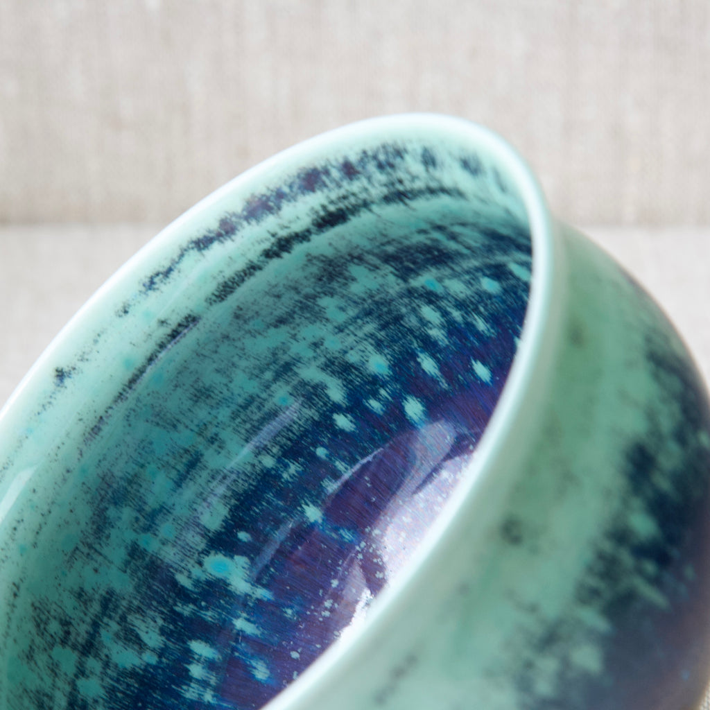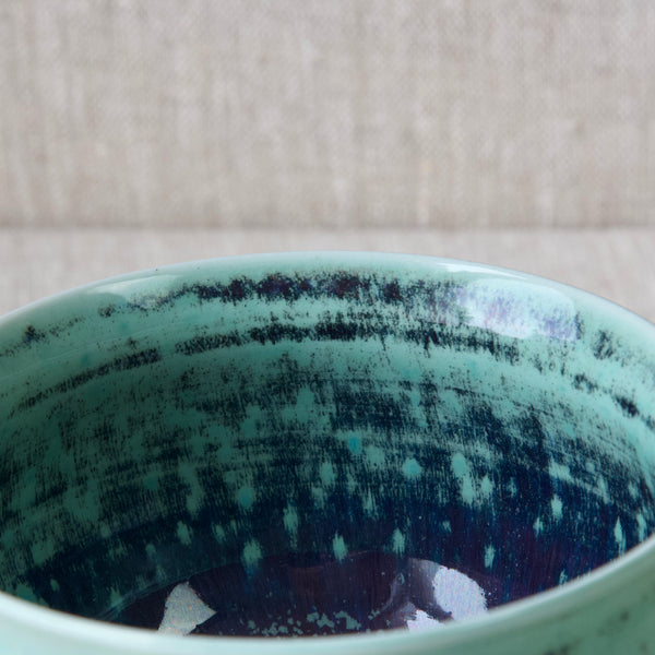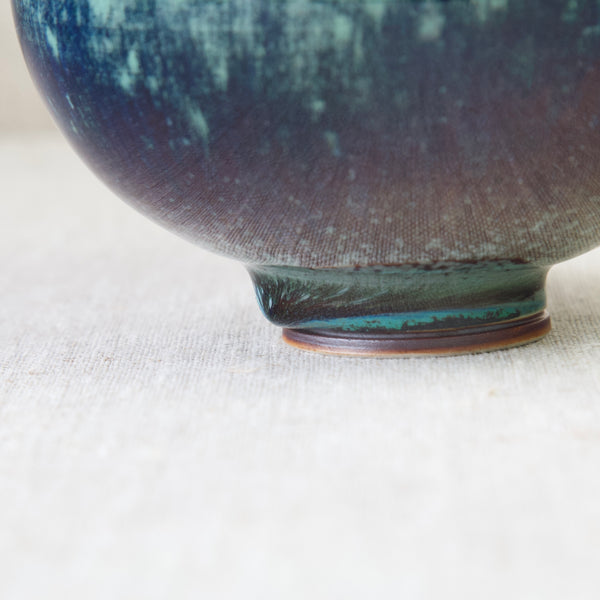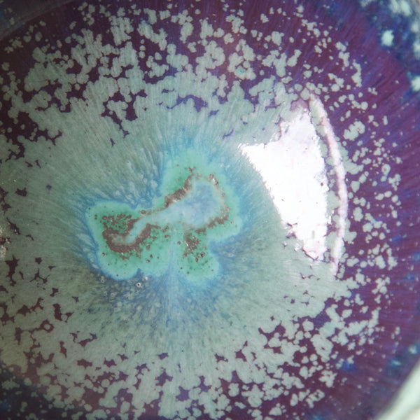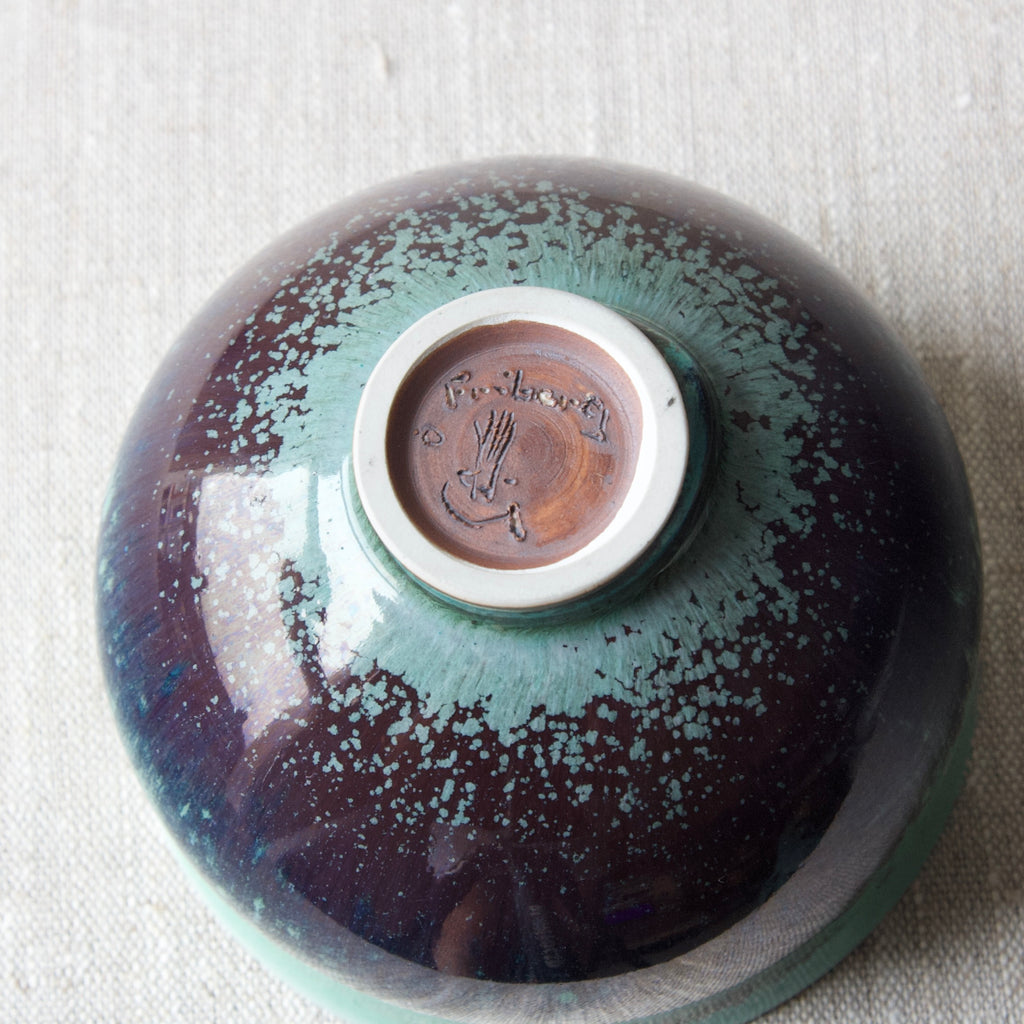 The bowl's interior reflects the glorious exterior and perfectly illustrates the complexity of Friberg's choice of intricate glaze. Predominantly navy, the captivating interior features dappled & feathered areas of aqua-blue with a large freckled pool at the bottom.