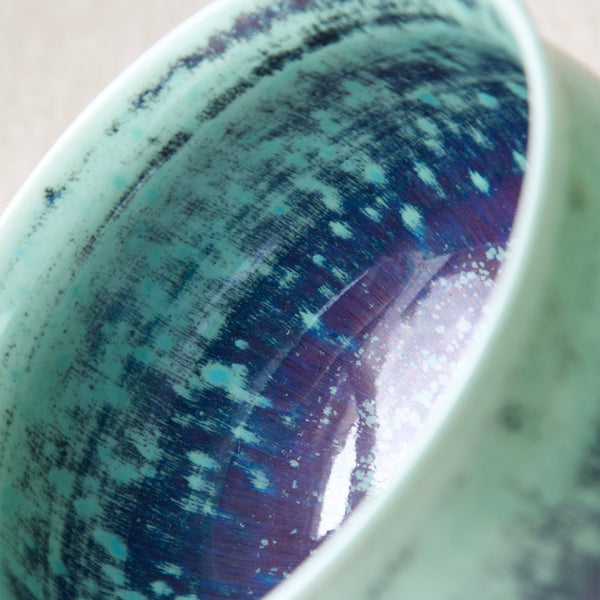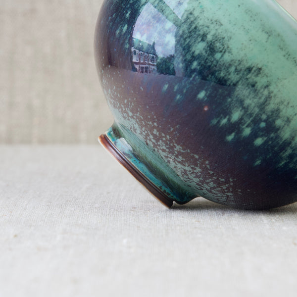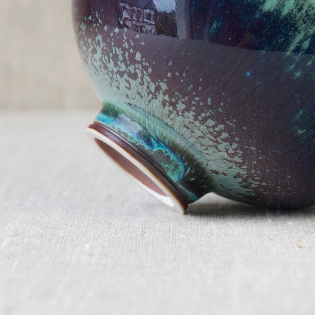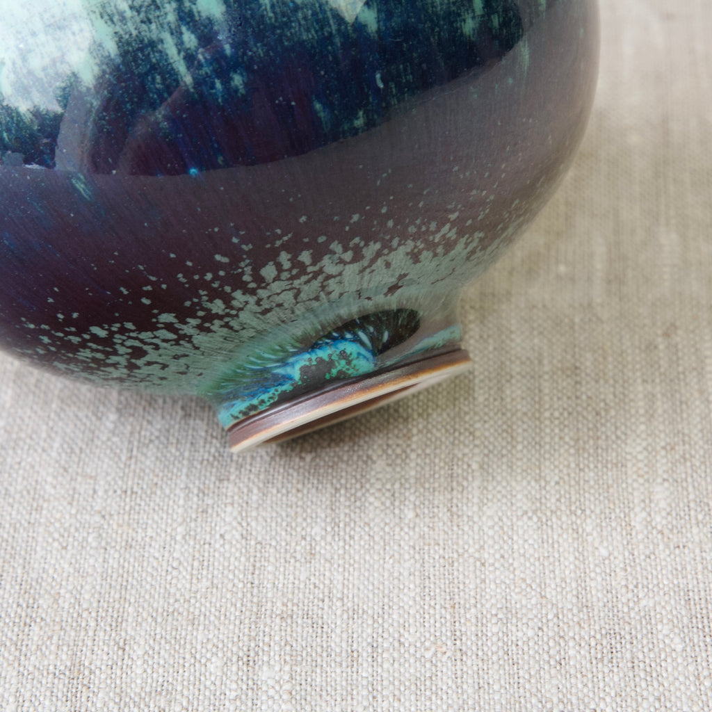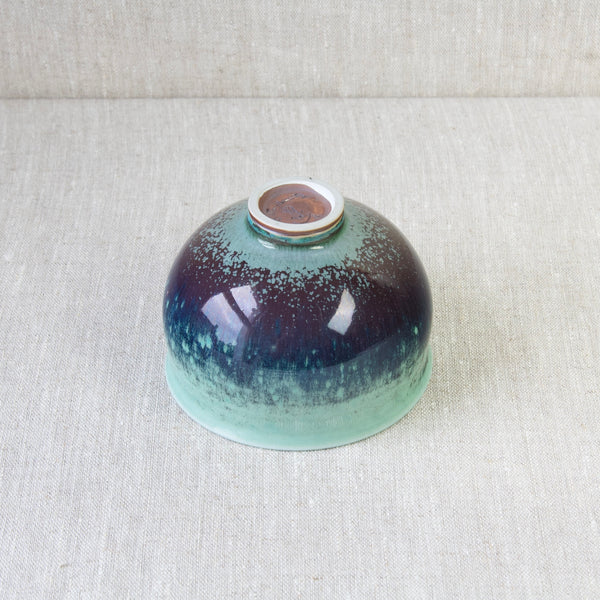 The bowl's interior reflects the glorious exterior and perfectly illustrates the complexity of Friberg's choice of intricate glaze. Predominantly navy, the captivating interior features dappled & feathered areas of aqua-blue with a large freckled pool at the bottom.