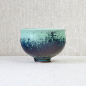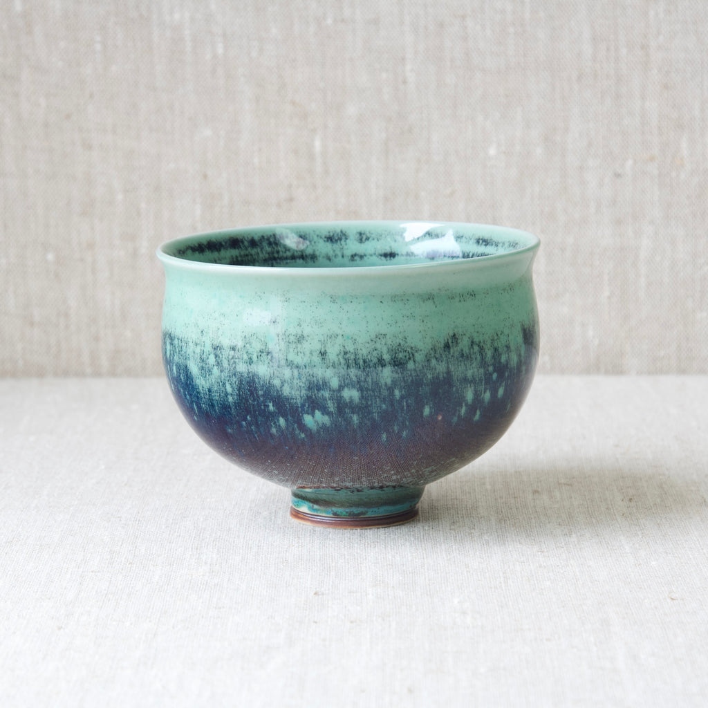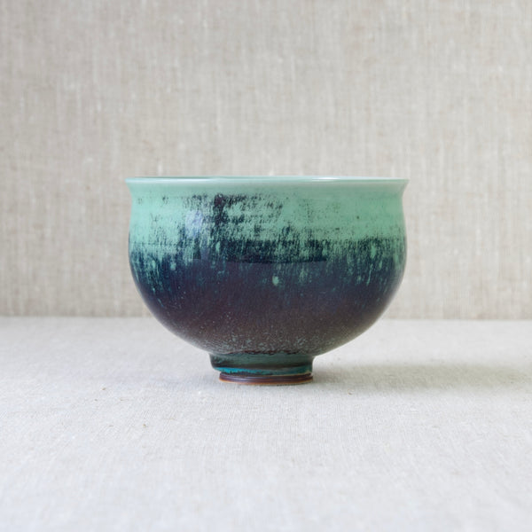 This vibrant footed bowl was handmade by Friberg in 1962, and features a beautifully dappled glaze of turquoise, cobalt & navy.