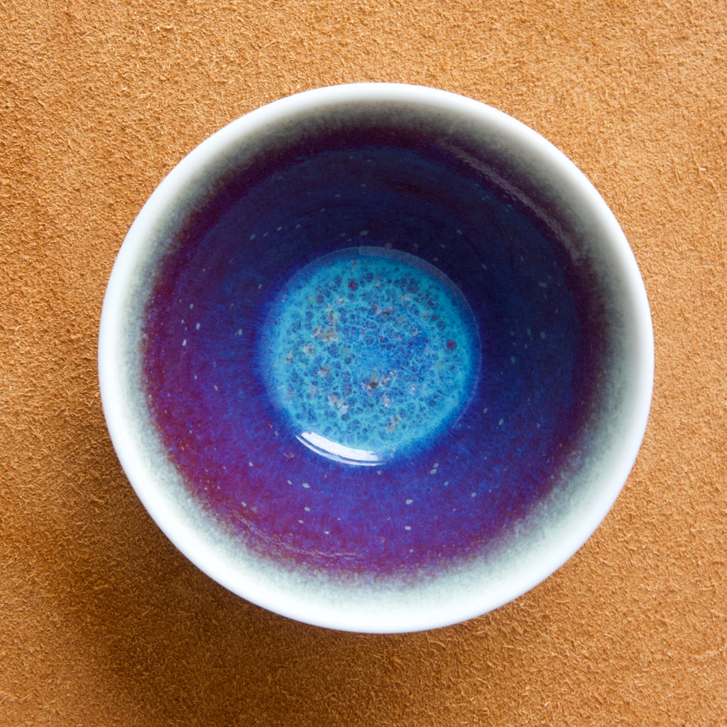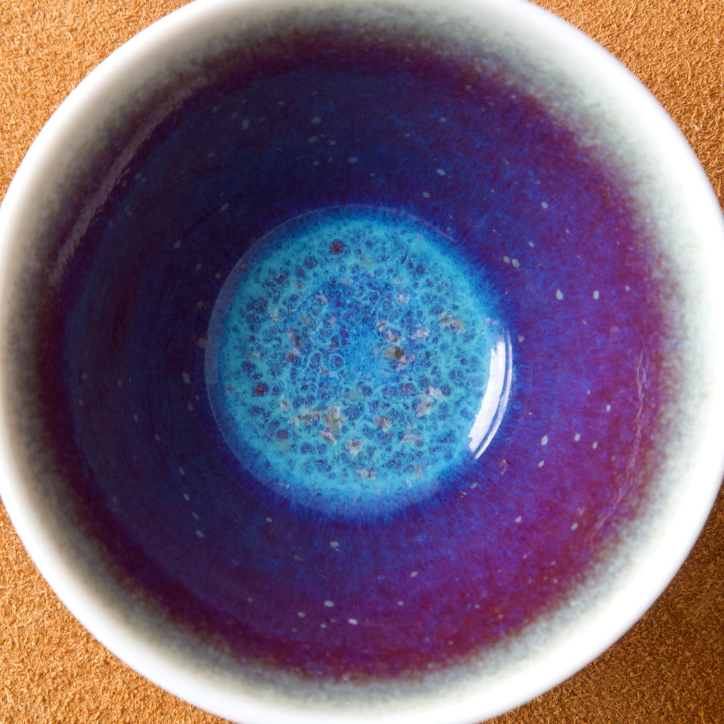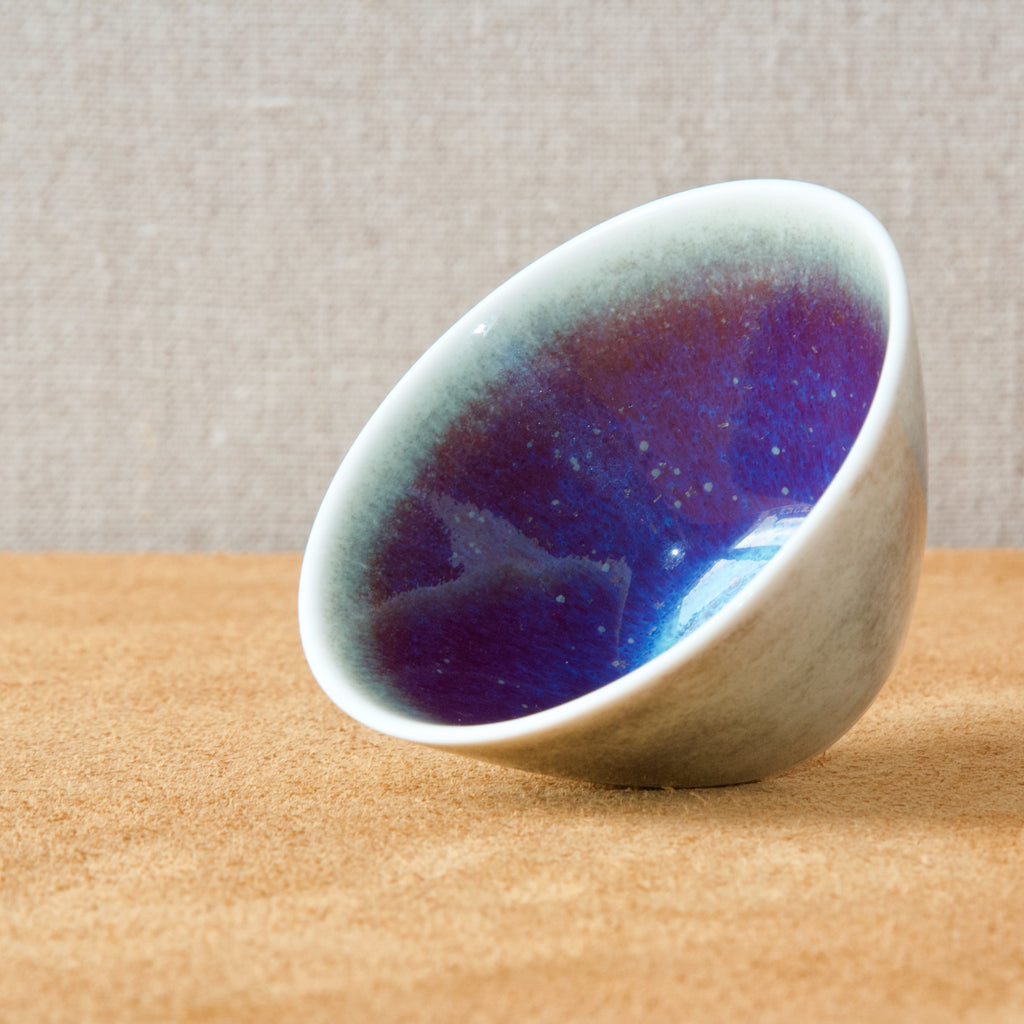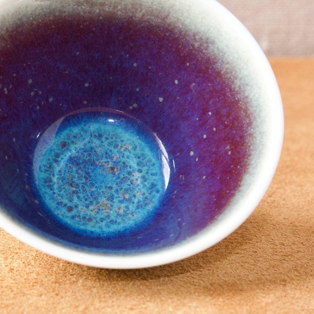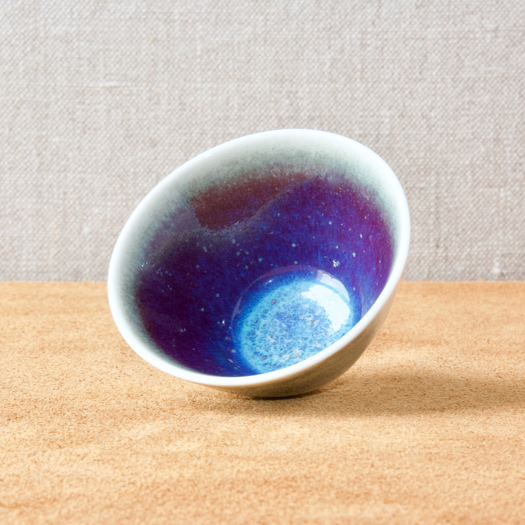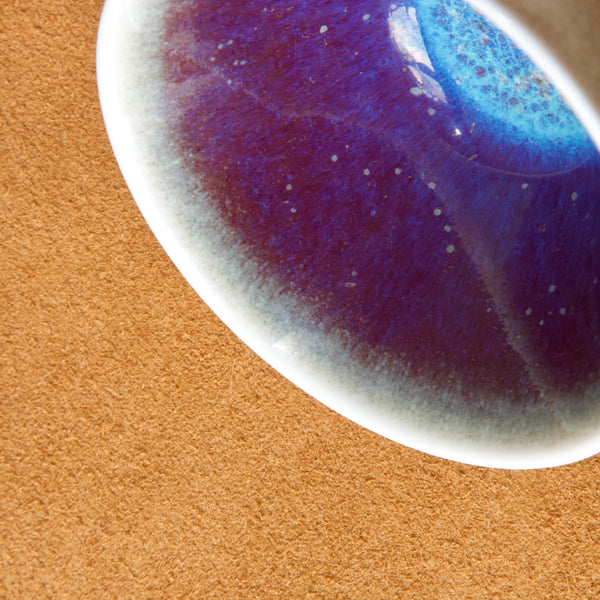 This attractive bowl features a refined smoked white glaze to the outside, and an interior of vibrant purple with clouds of bright blue & cobalt. The spectacular effect and colouration is reminiscent of a nebula or distant galaxy.