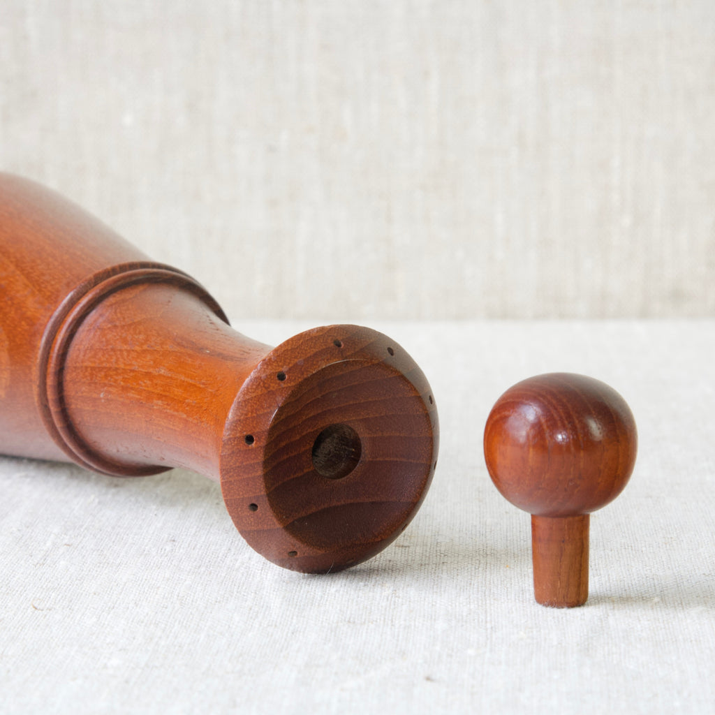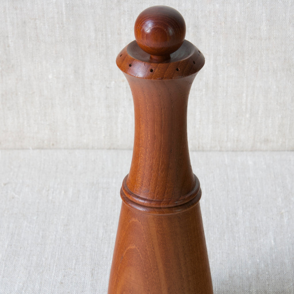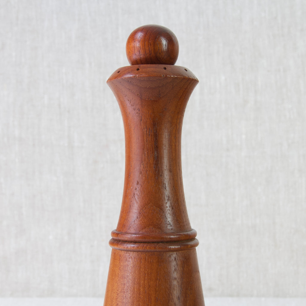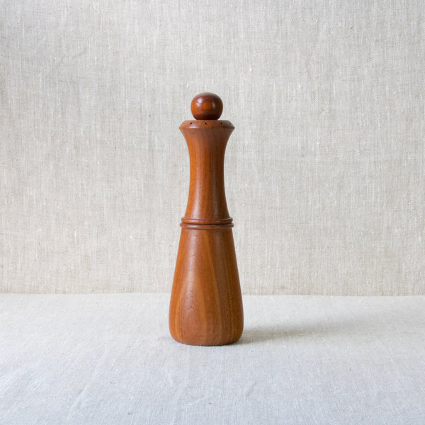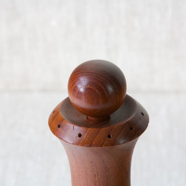A carved solid teak salt and pepper mill, reminiscent of a traditional oil carafe with a round ball stopper, designed by Jens Quistgaard for Dansk. Quistgaard designed his eminently collectable series of combination salt shaker pepper mills between the late 1950's and early 1960's.