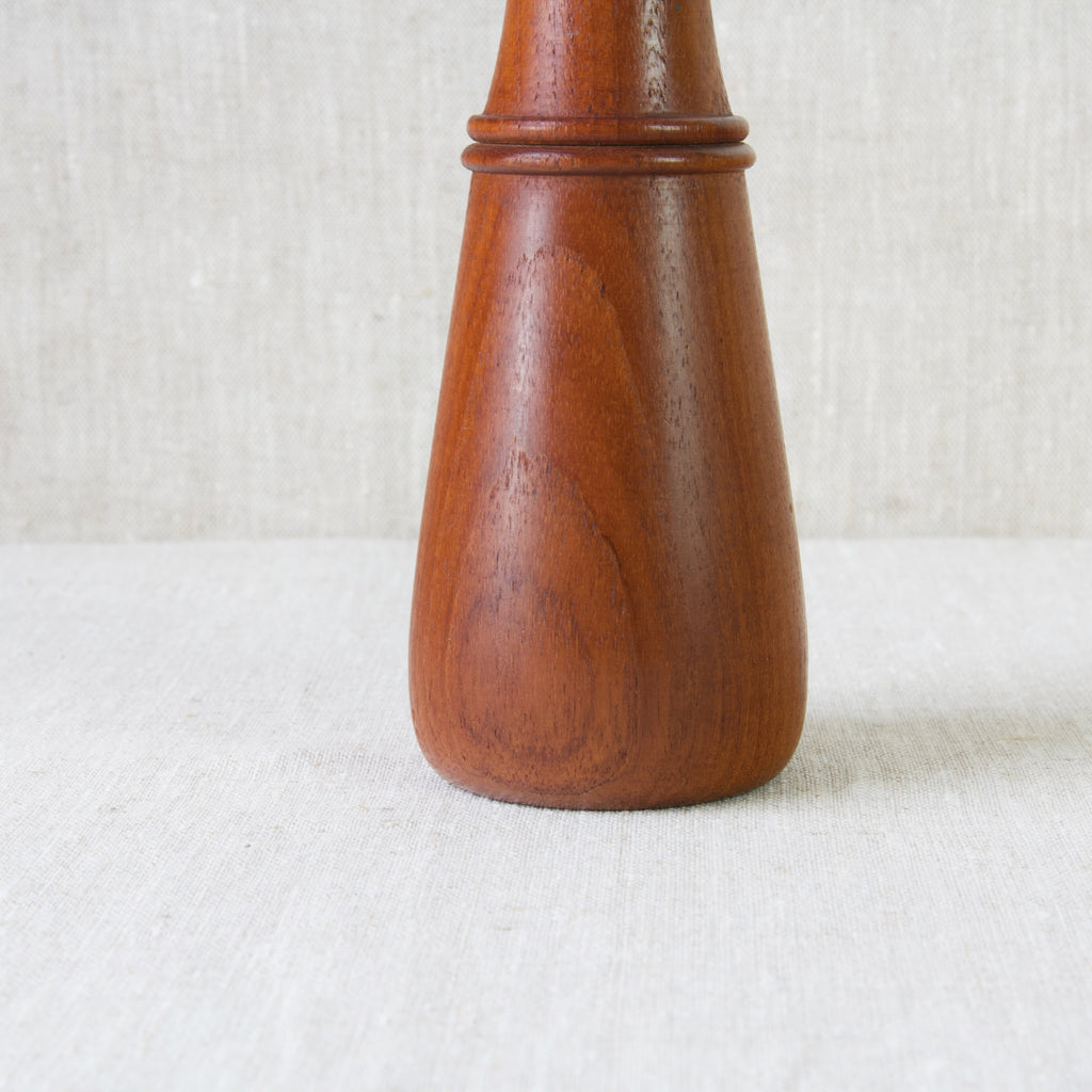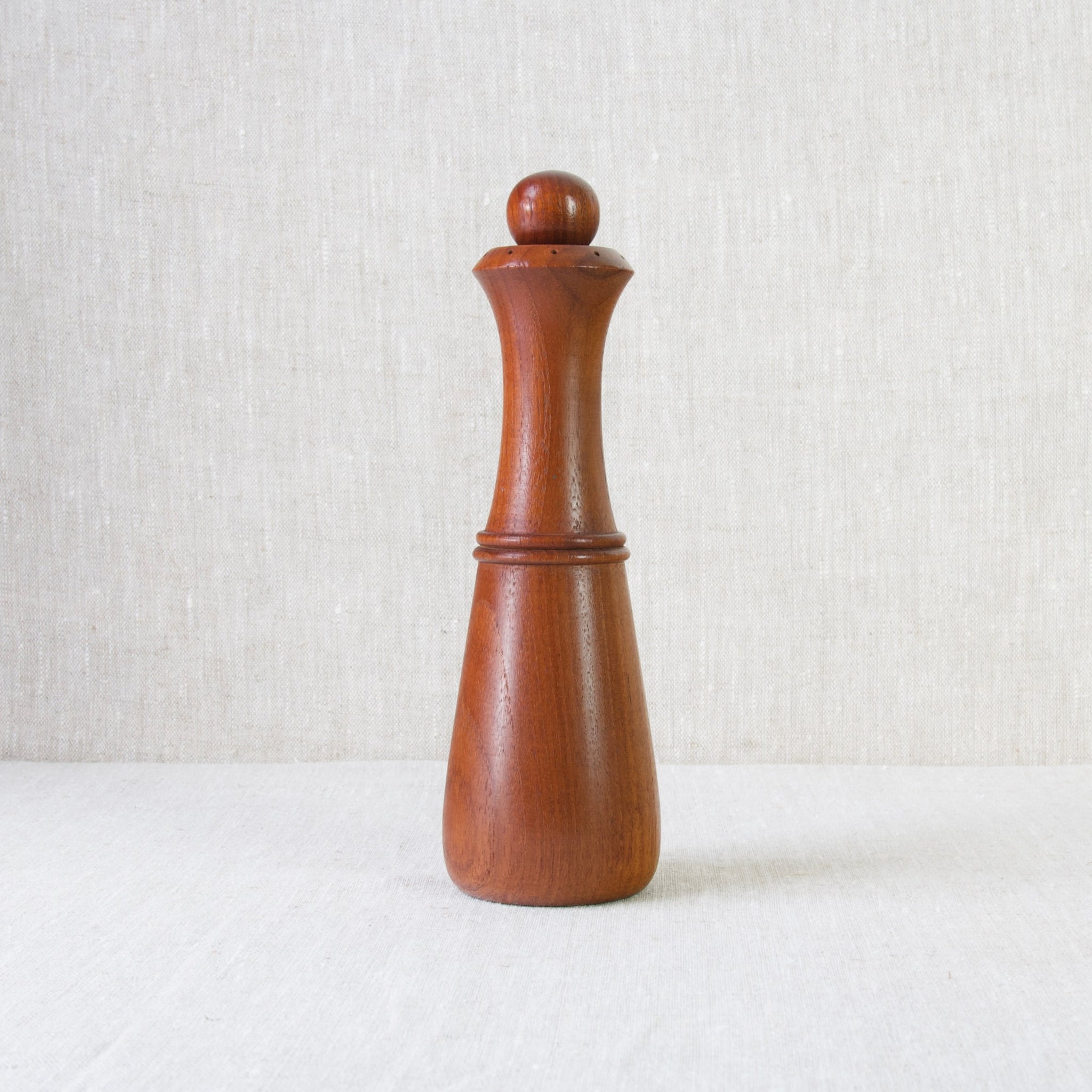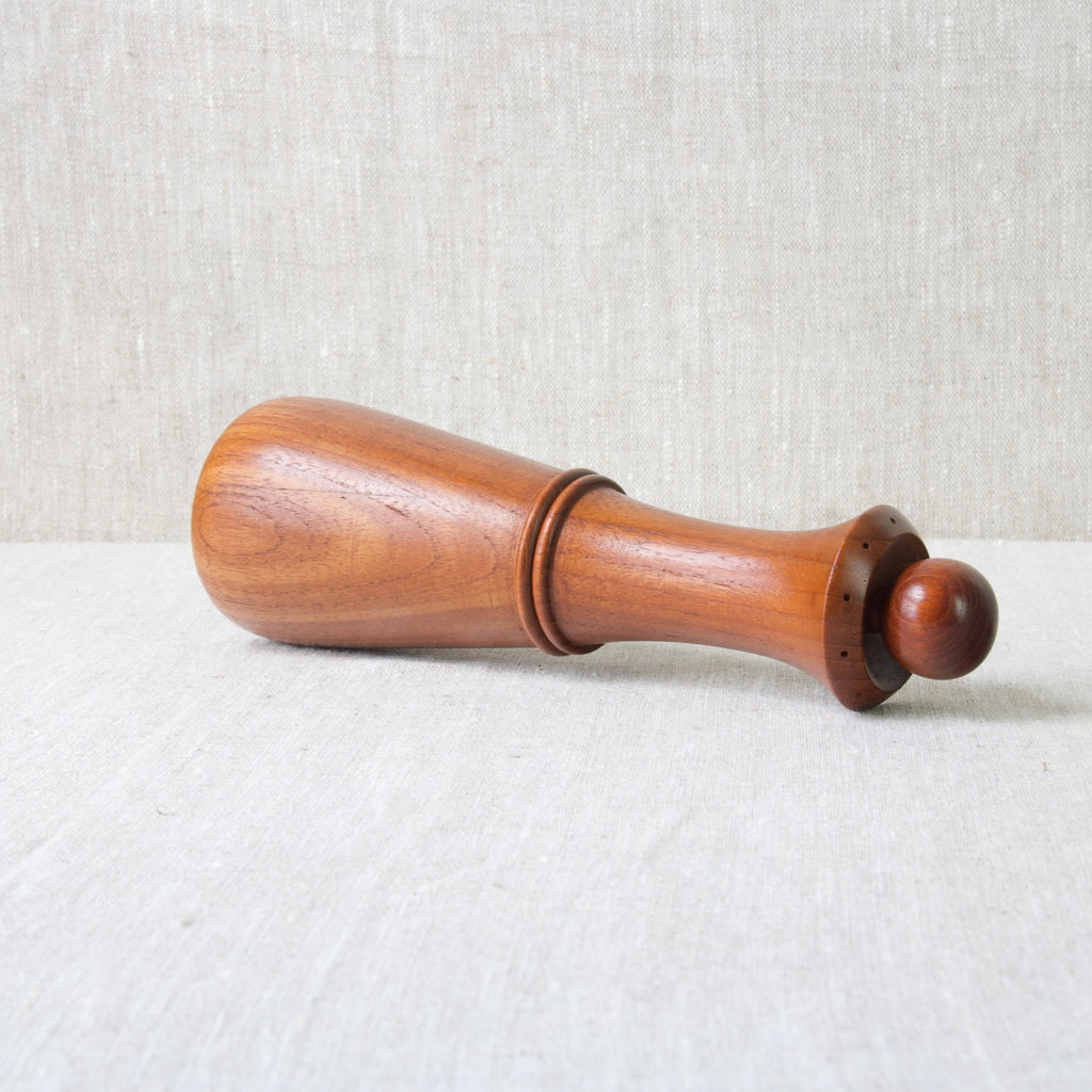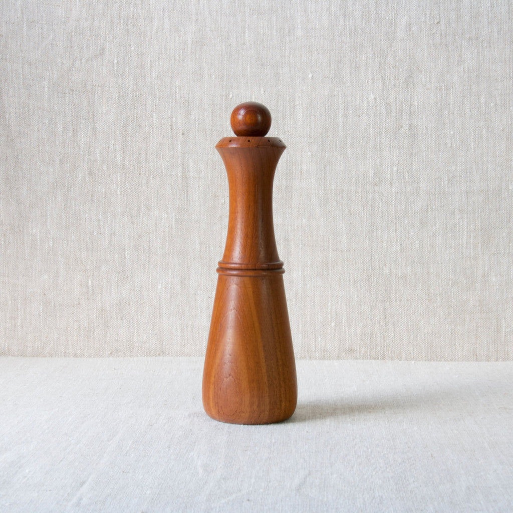 A carved solid teak salt and pepper mill, reminiscent of a traditional oil carafe with a round ball stopper, designed by Jens Quistgaard for Dansk. Quistgaard designed his eminently collectable series of combination salt shaker pepper mills between the late 1950's and early 1960's.