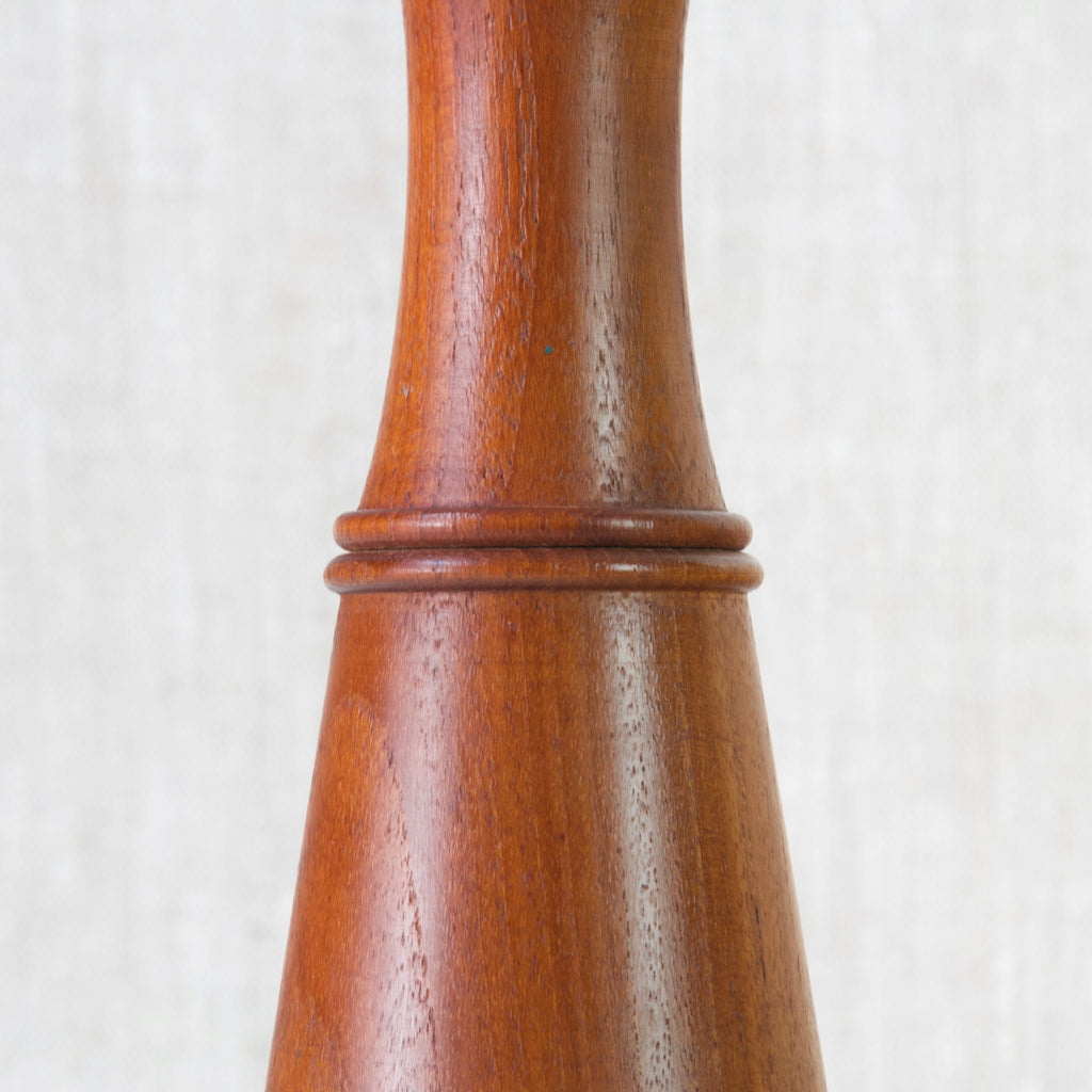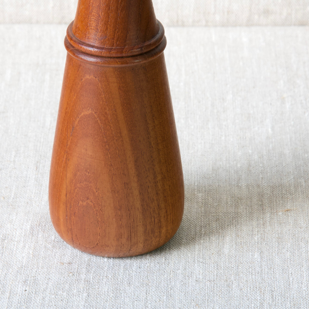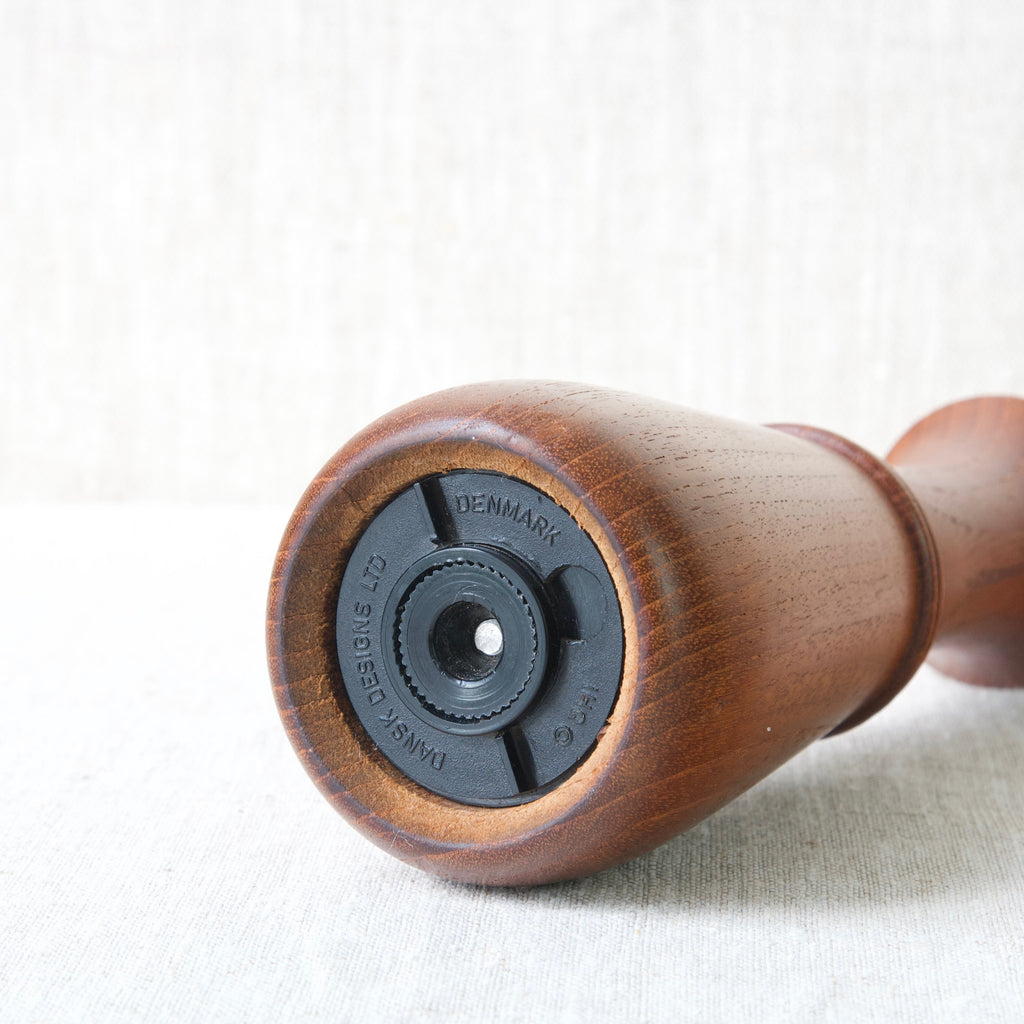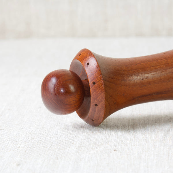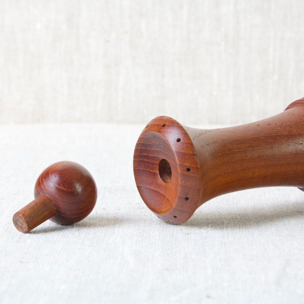 A carved solid teak salt and pepper mill, reminiscent of a traditional oil carafe with a round ball stopper, designed by Jens Quistgaard for Dansk. Quistgaard designed his eminently collectable series of combination salt shaker pepper mills between the late 1950's and early 1960's.