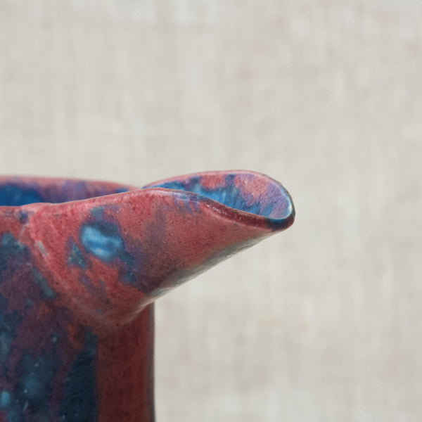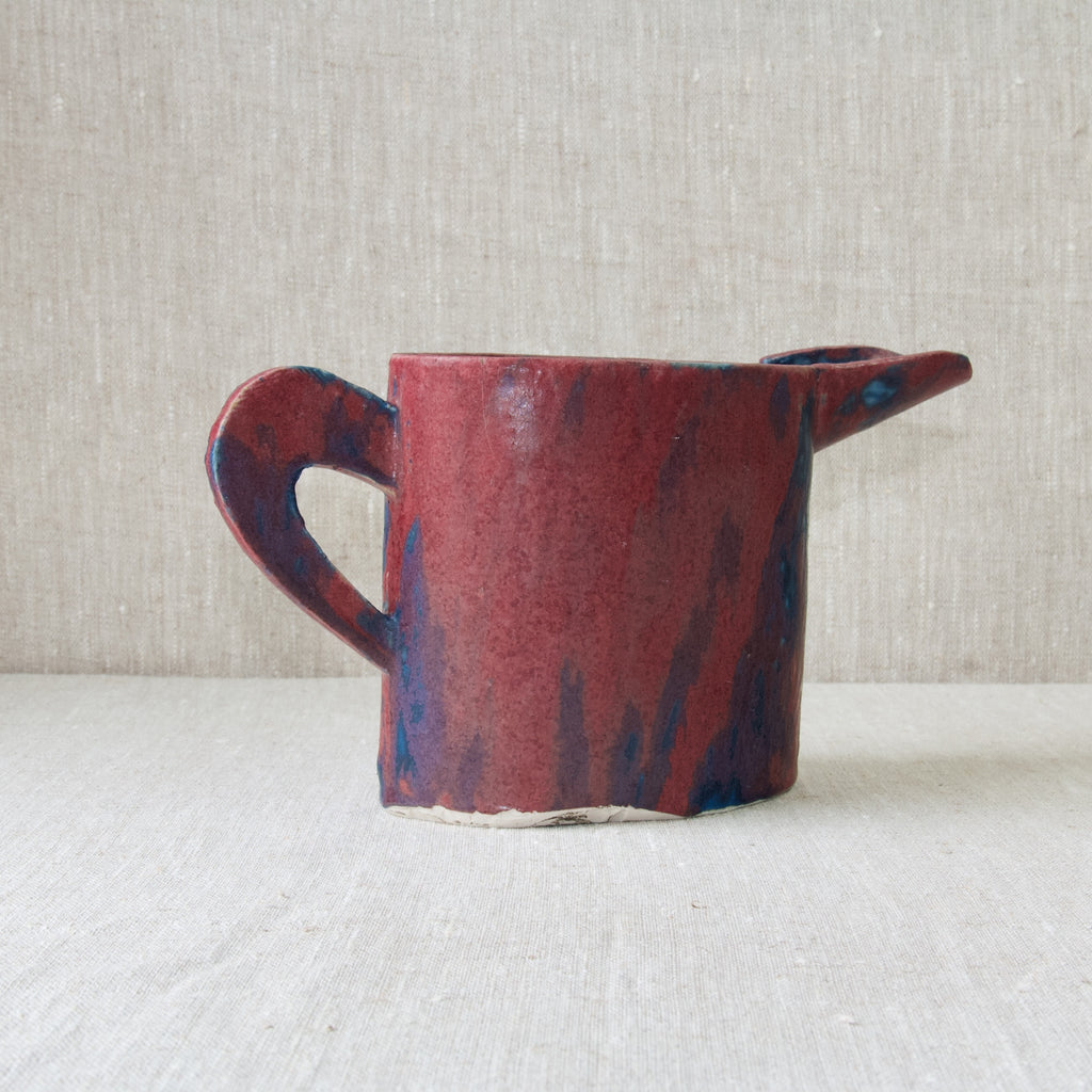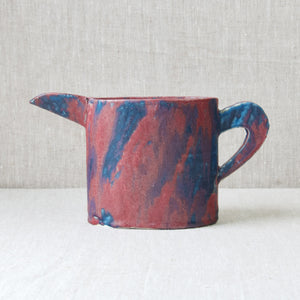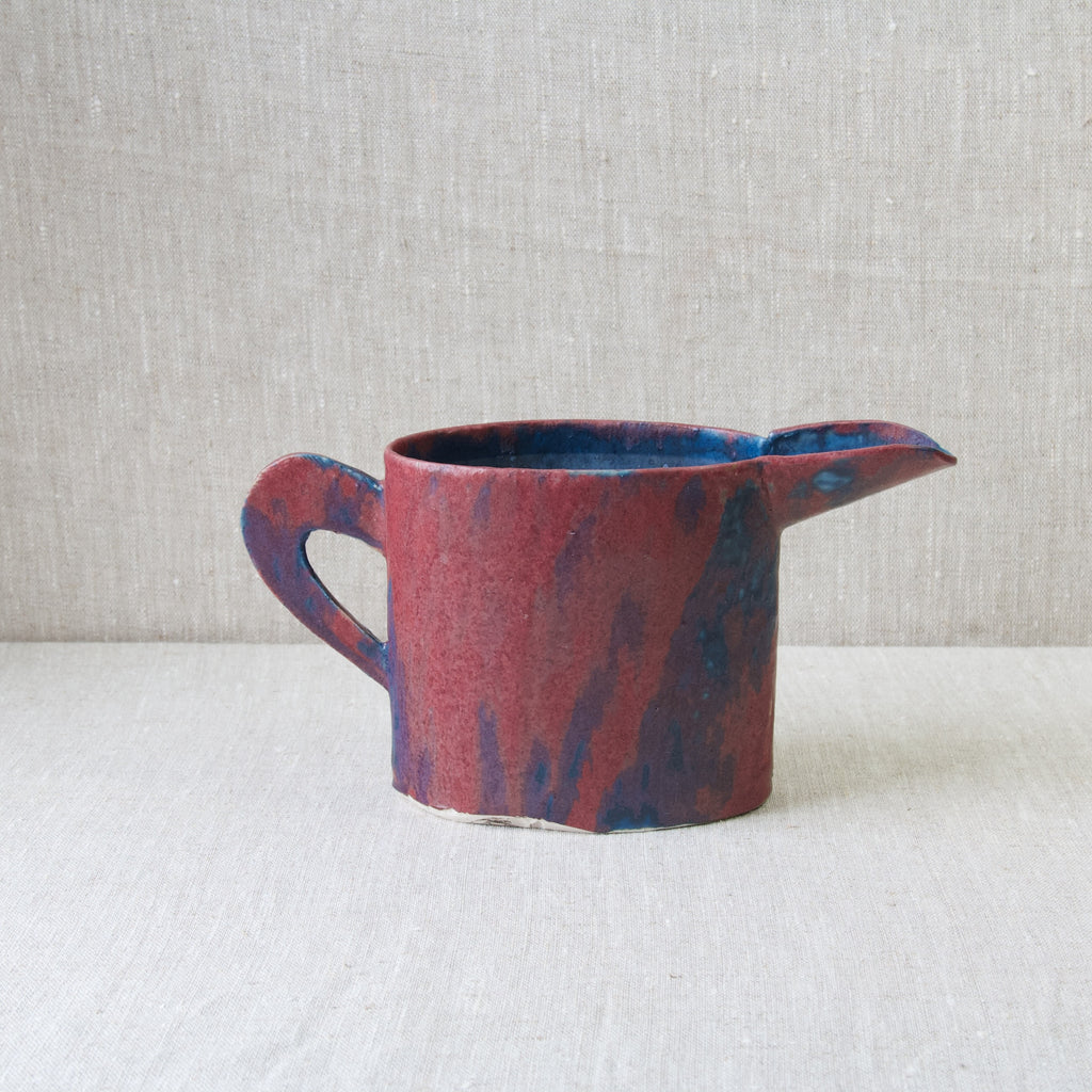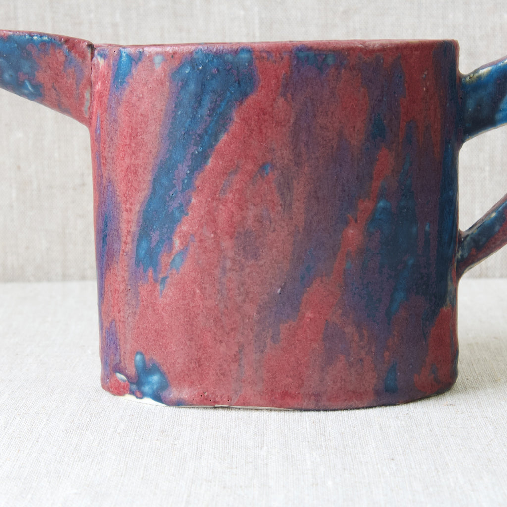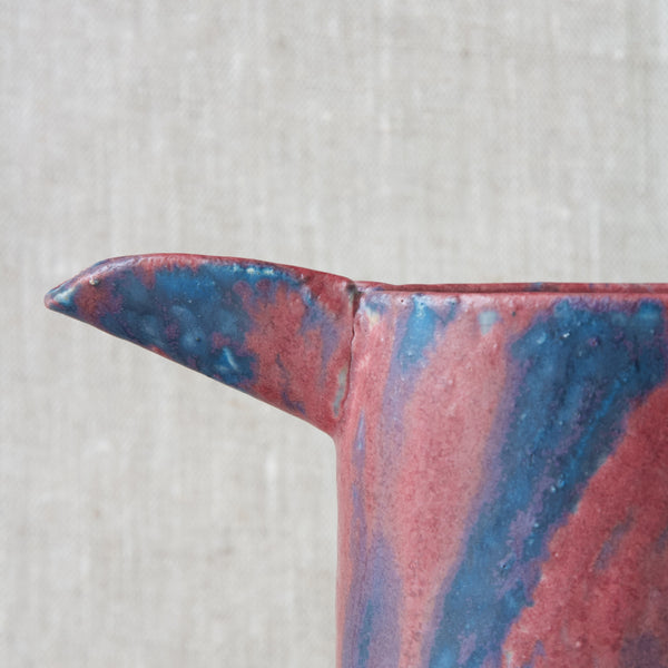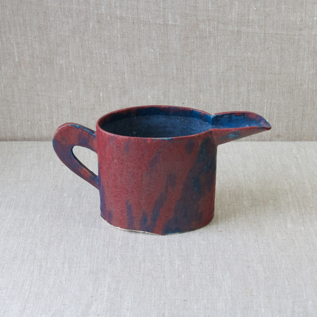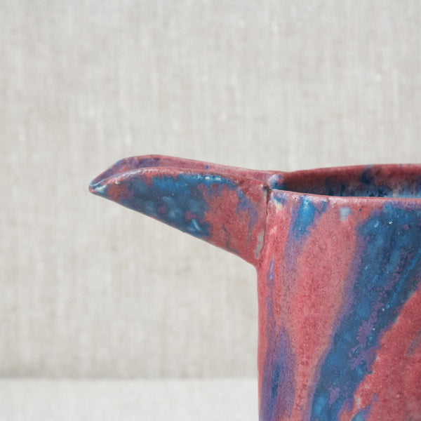 Contrasting the clean, neat and functional form is the jug's glaze. Richly applied in layers, it is mildly textured, and dramatic containing colours of reds, blues, deep pinks and bright splashes or purple.