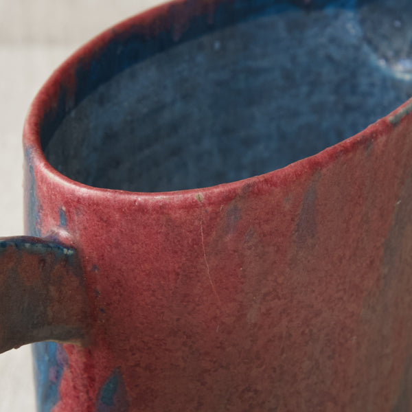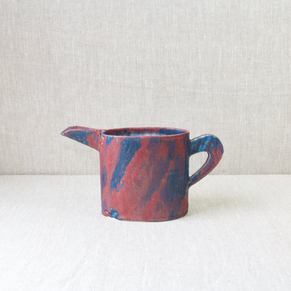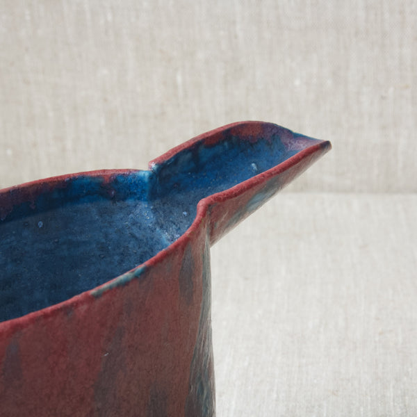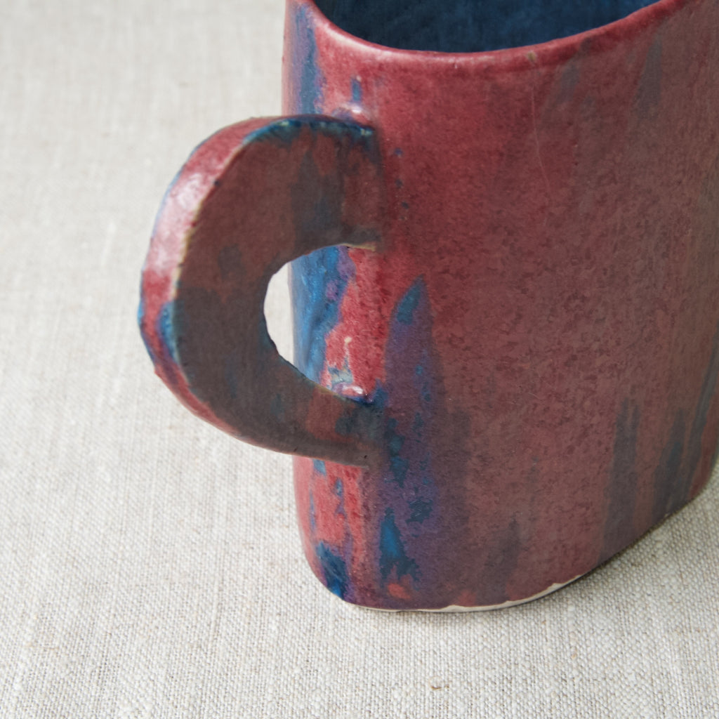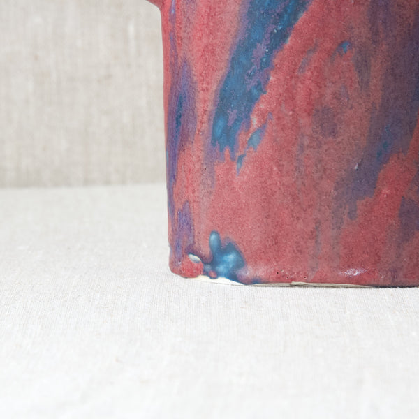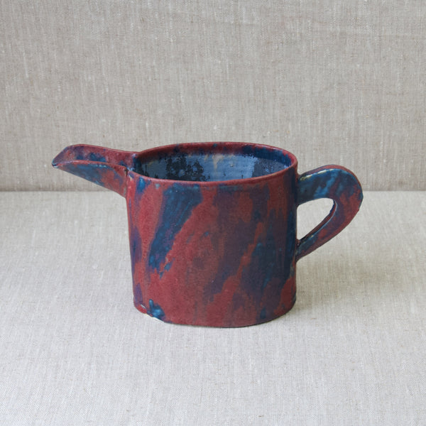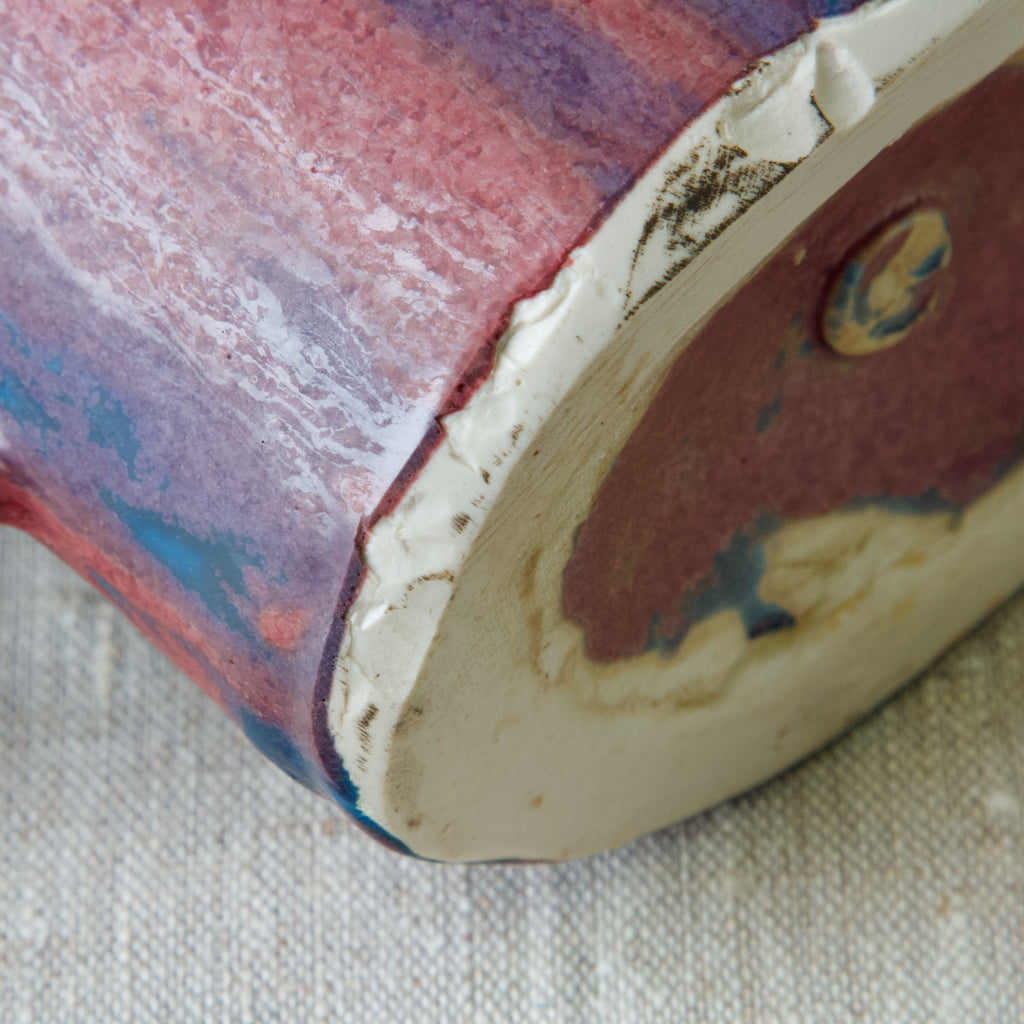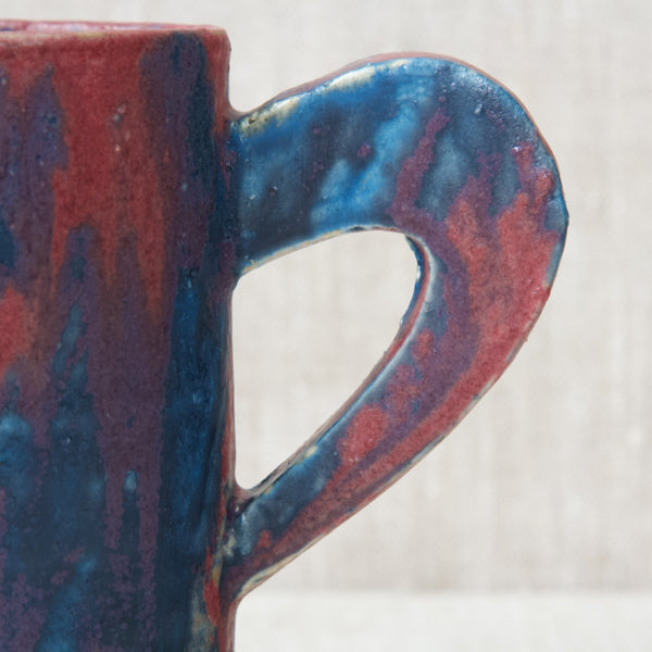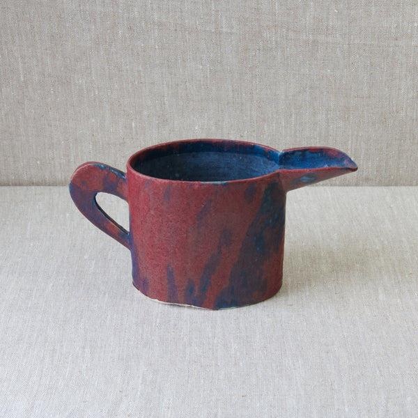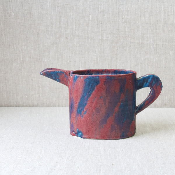 Contrasting the clean, neat and functional form is the jug's glaze. Richly applied in layers, it is mildly textured, and dramatic containing colours of reds, blues, deep pinks and bright splashes or purple.