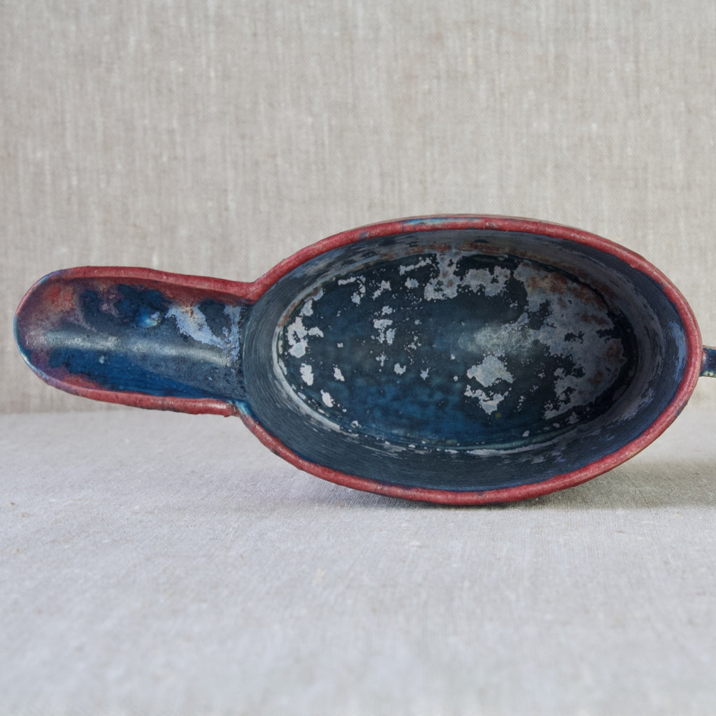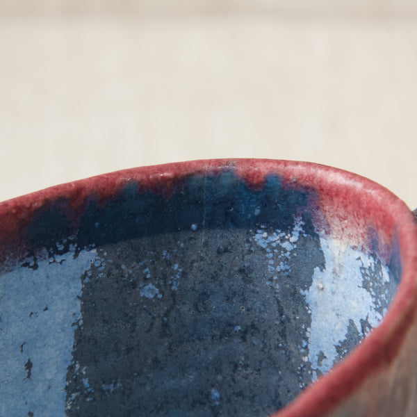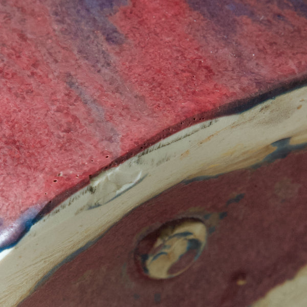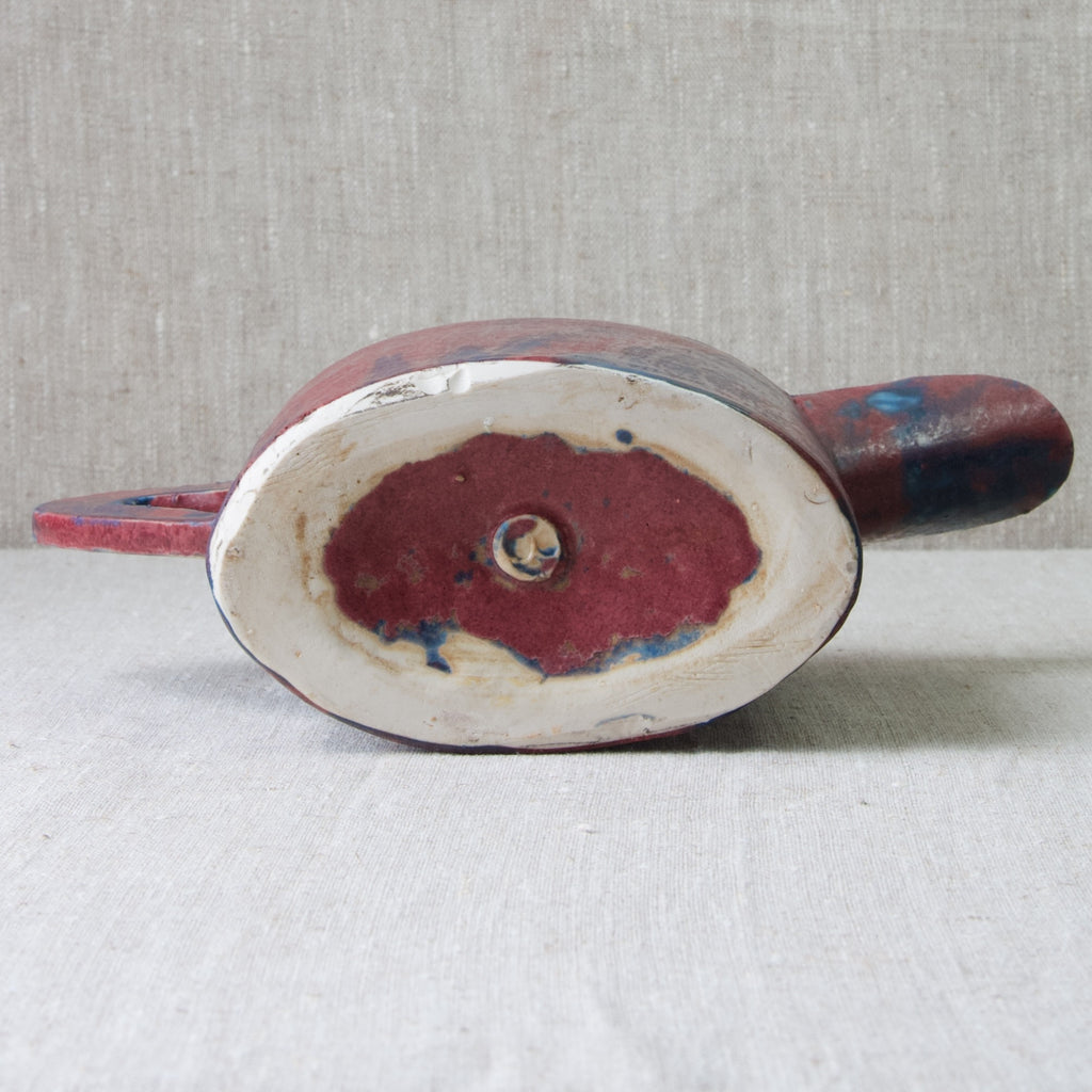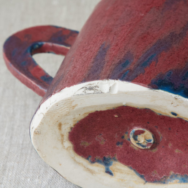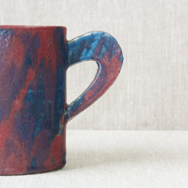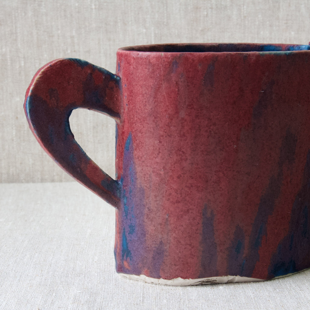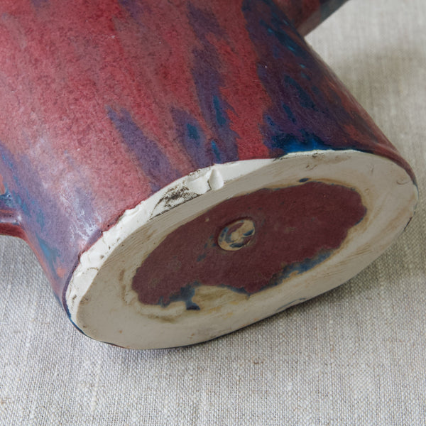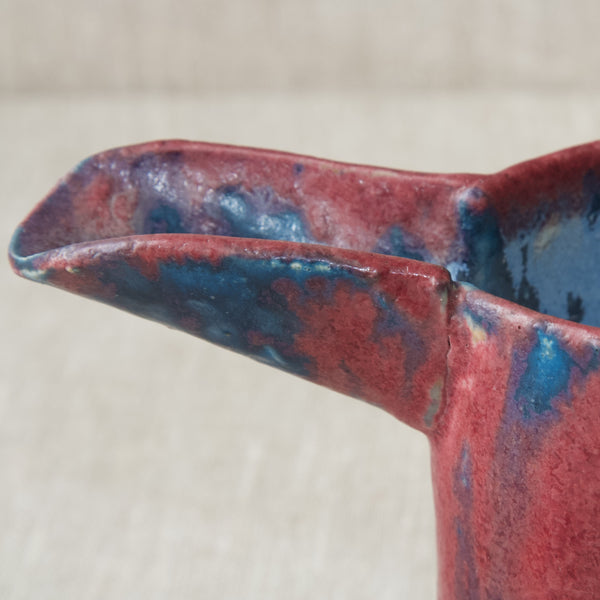Contrasting the clean, neat and functional form is the jug's glaze. Richly applied in layers, it is mildly textured, and dramatic containing colours of reds, blues, deep pinks and bright splashes or purple.