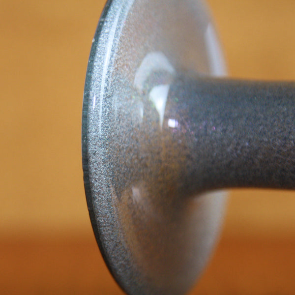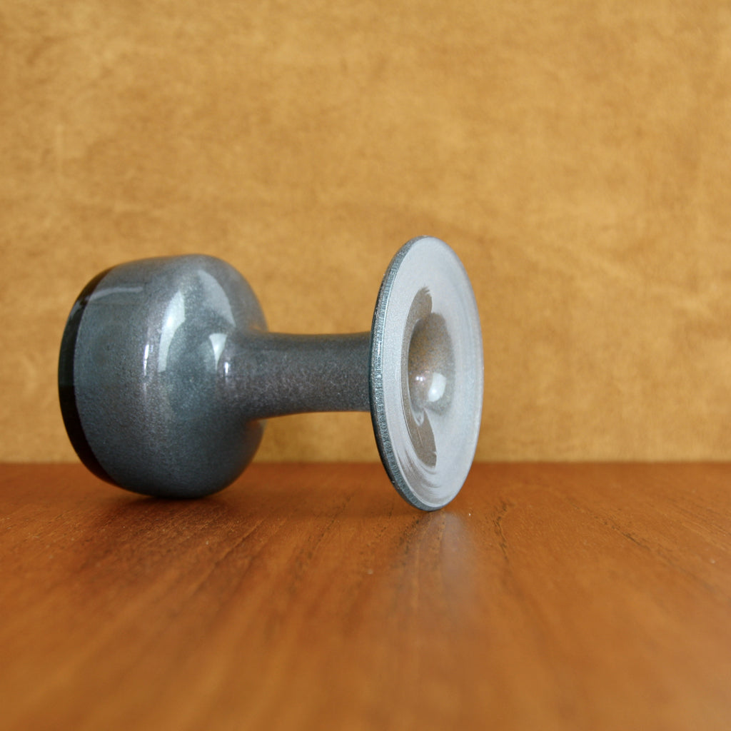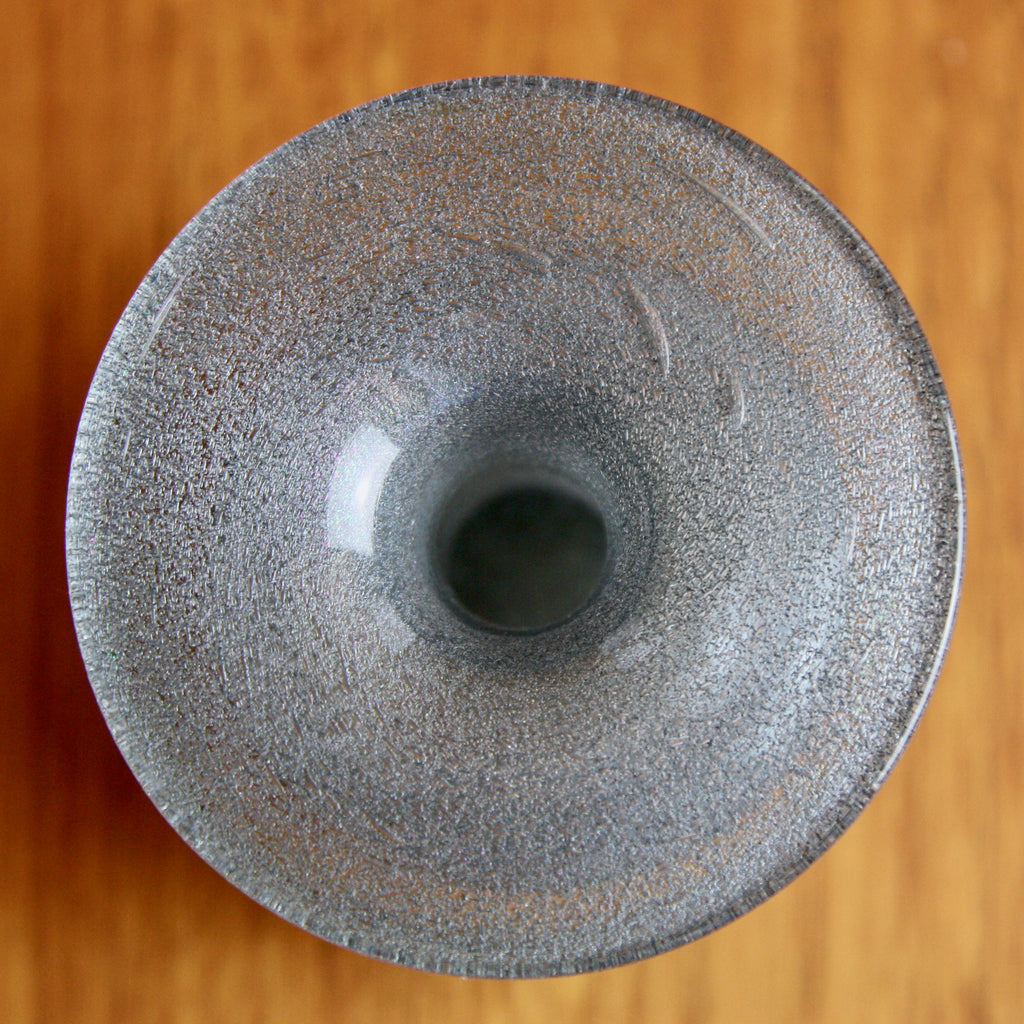 This vase is part of an experimental series in which silicon carbide was added to the furnace, creating a shimmering iridescence within the blue-grey glass.
