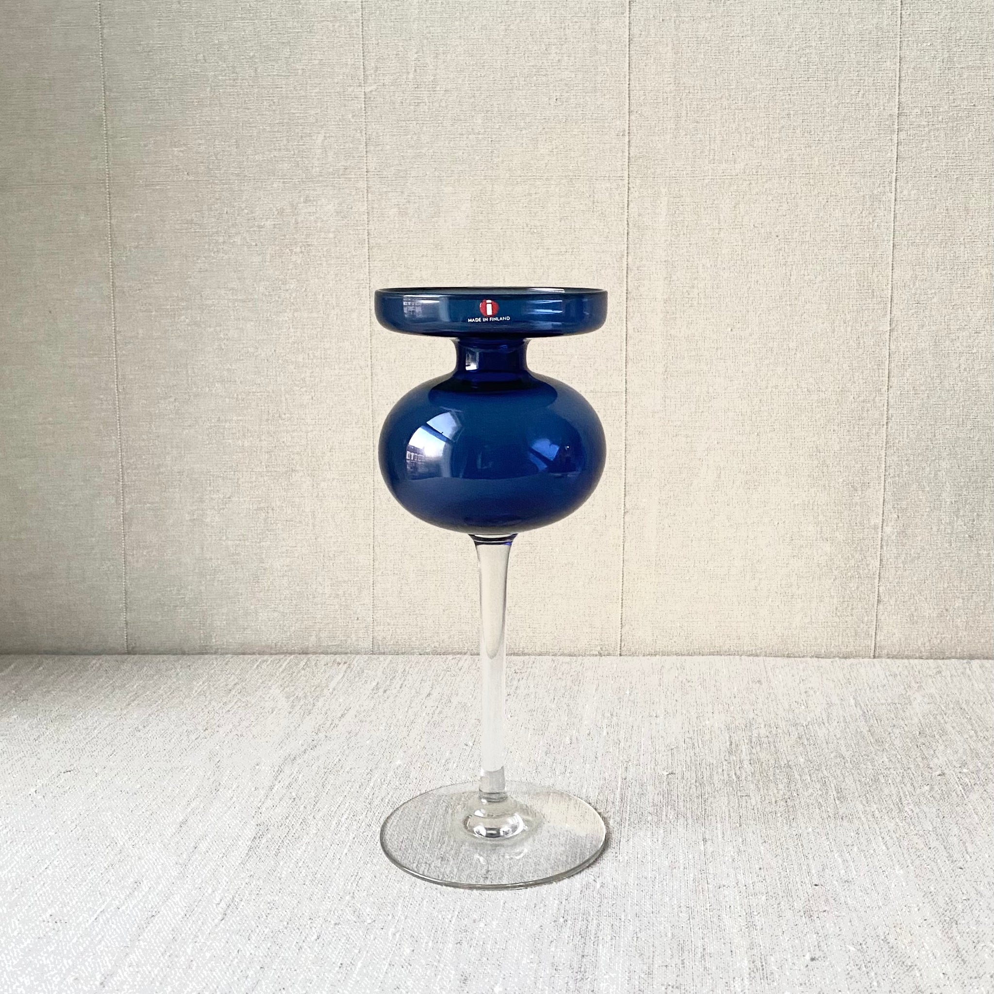 A blue glass stemmed candle holder, designed in 1965 by Erkki Vesanto. This item was handmade at Iittala glassworks, Finland, between the years 1965-70.