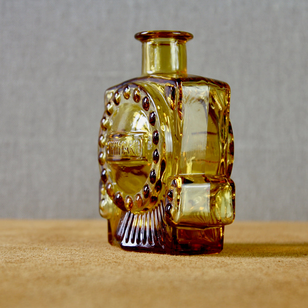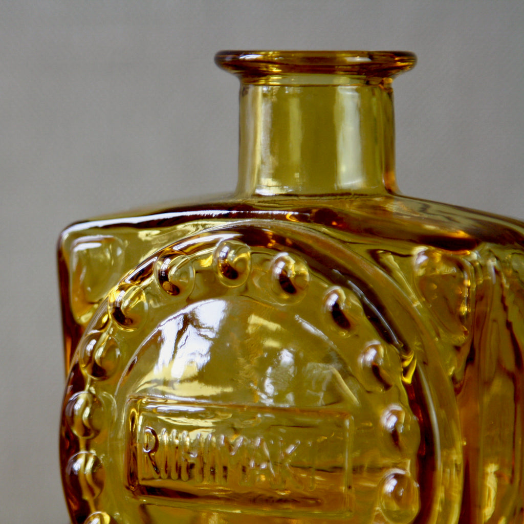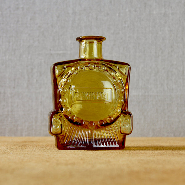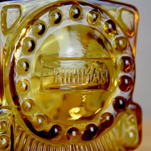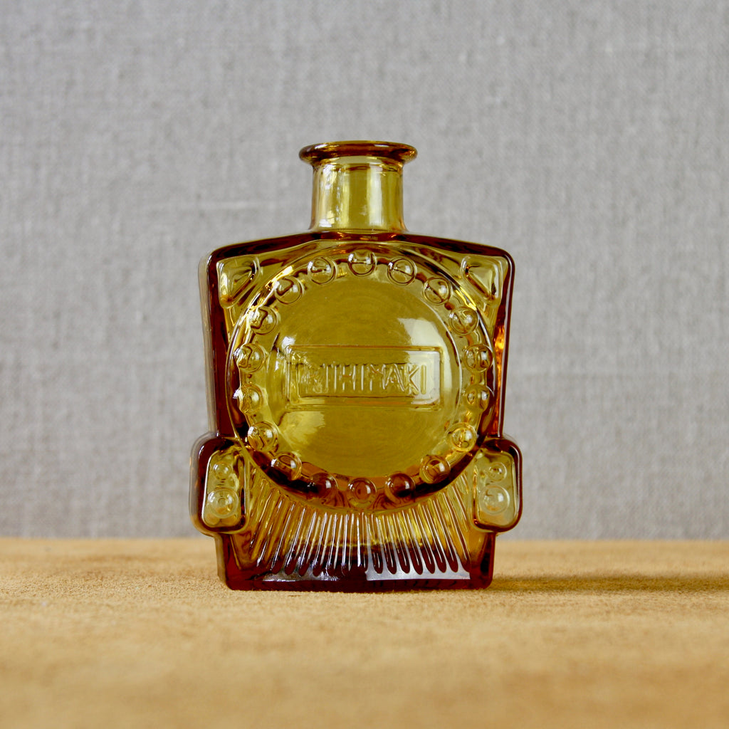 An amber 'Veturipullo' (Locomotive Bottle) by designer Erkkitapio Siiroinen, produced circa 1970 for Riihimäki glassworks.