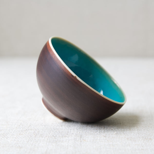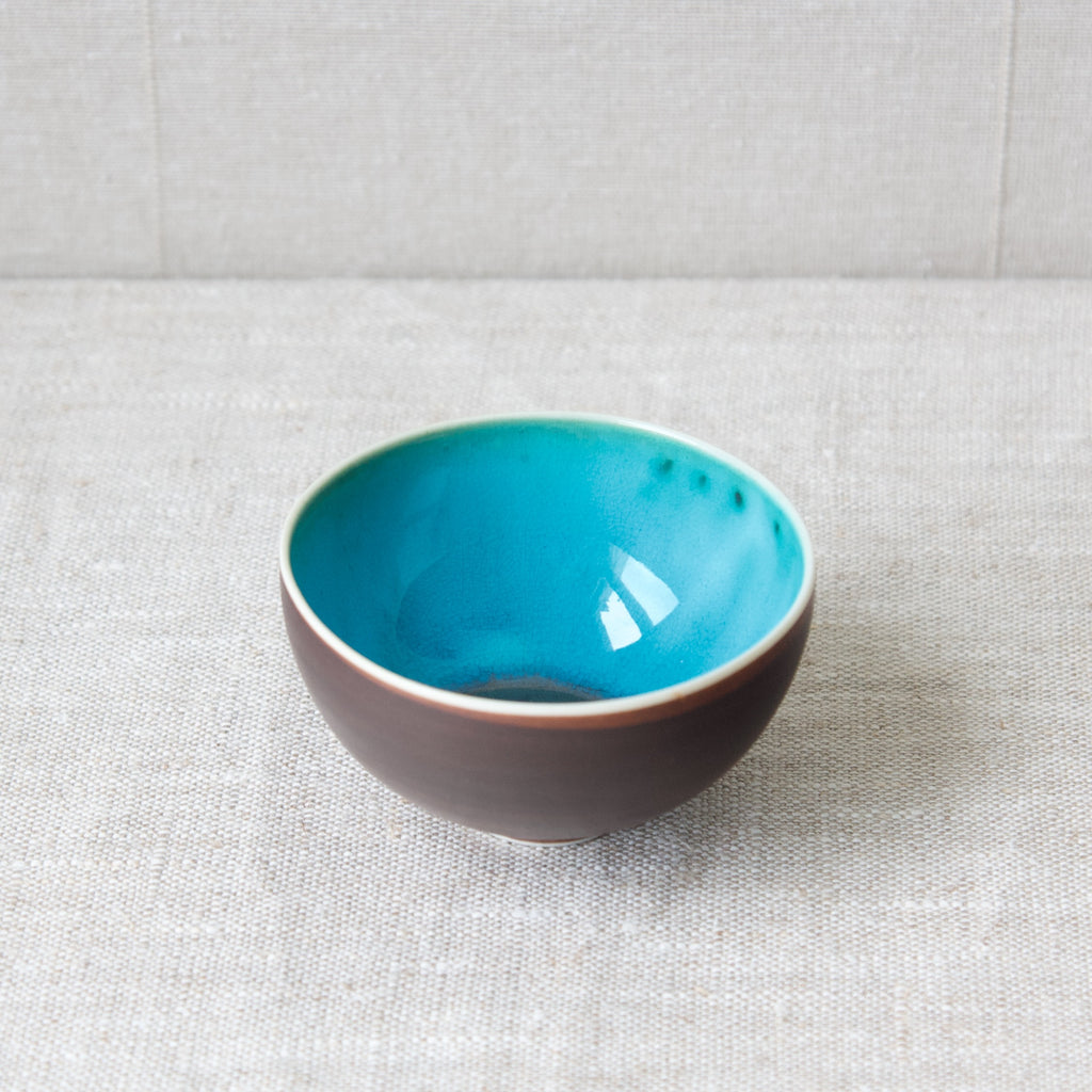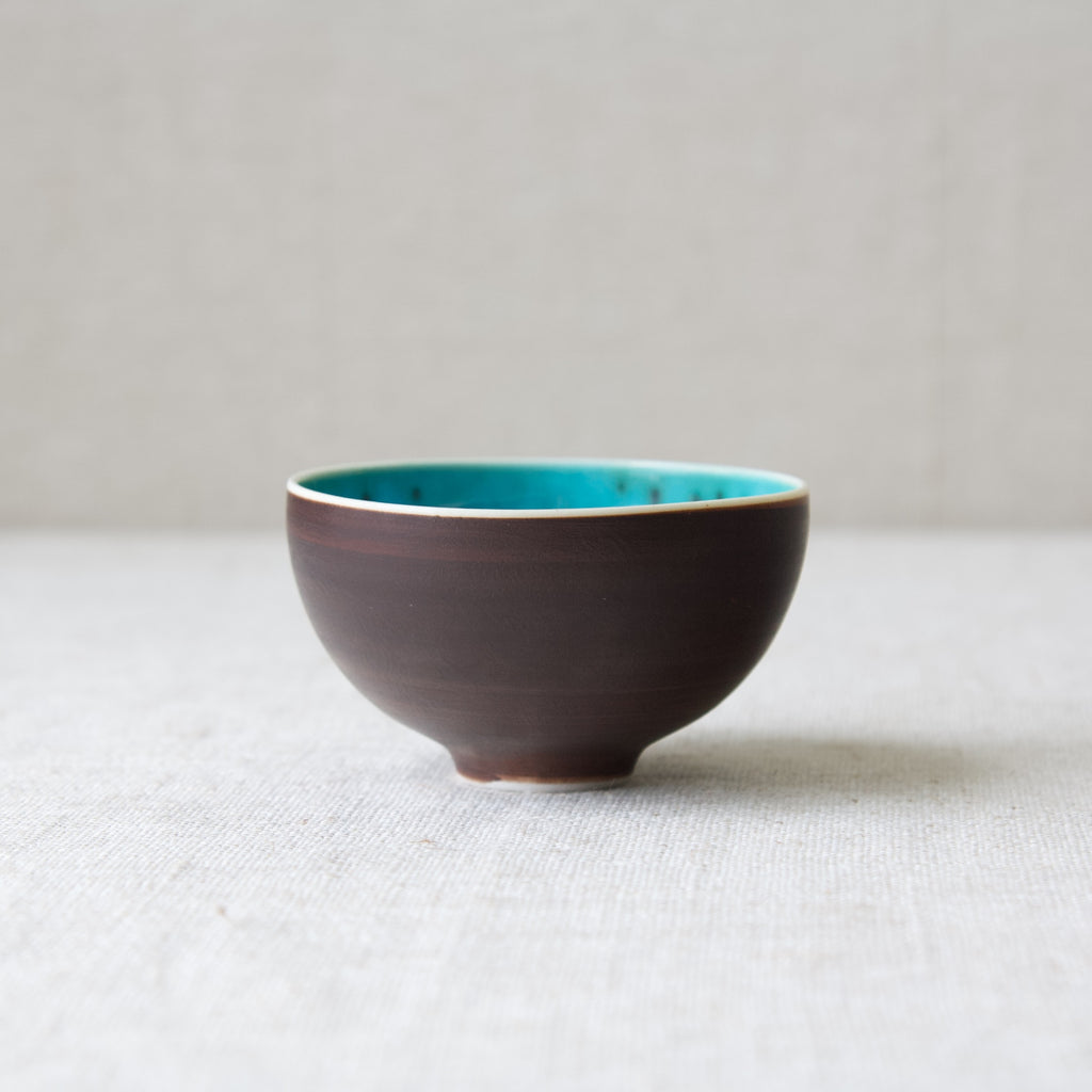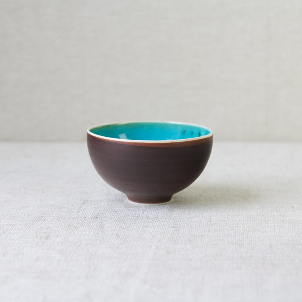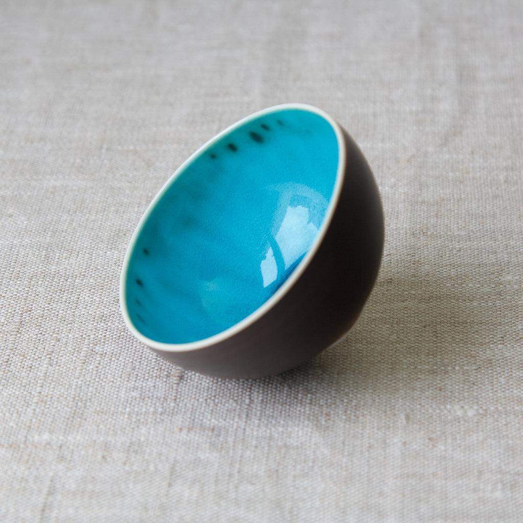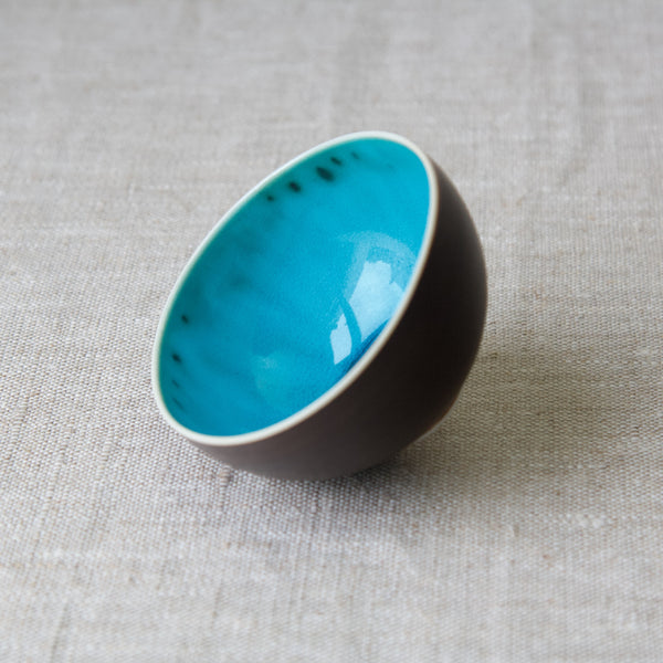 The interior of this delicate piece has been glazed with a vibrant turquoise blue. The intense colour has been achieved with a highly pigmented yet semi-transparent gloss glaze, which allows the white of the porcelain to shine through. In high contrast, a matte dark brown has been applied to the bowl's exterior. Although uniform in colour, the glaze has visible brushstrokes which contributes to the handmade character of this object. The bowl's rim is beautifully highlighted with a delicate line of bright white.