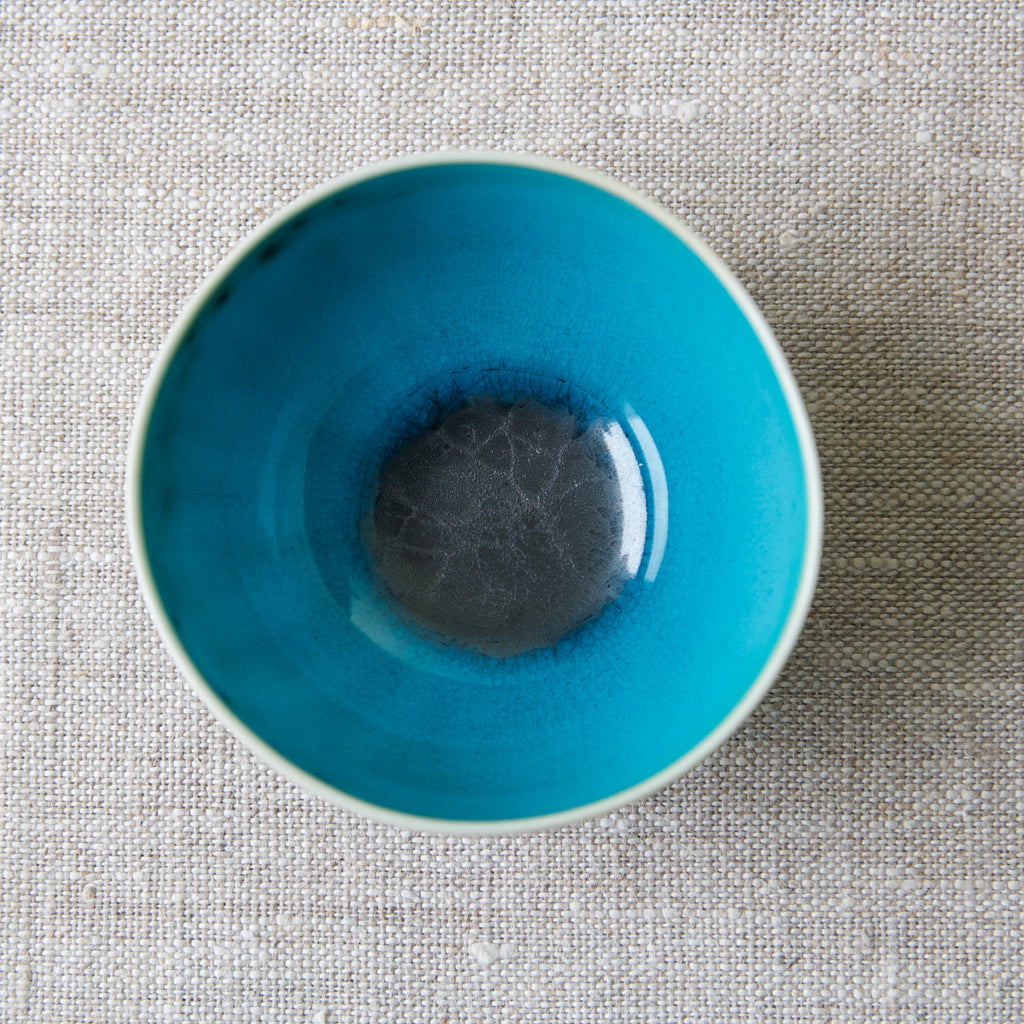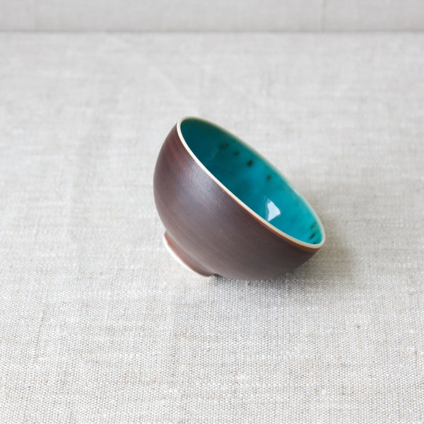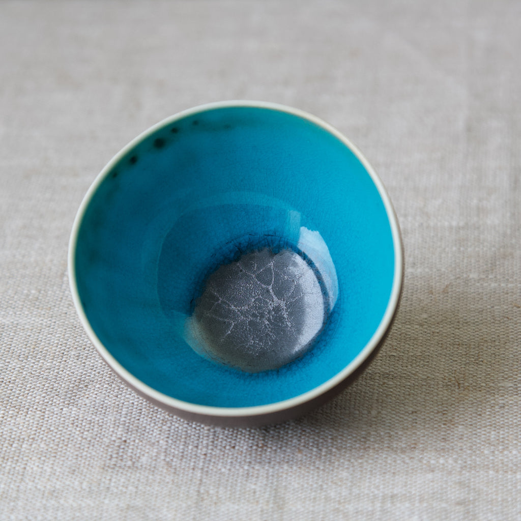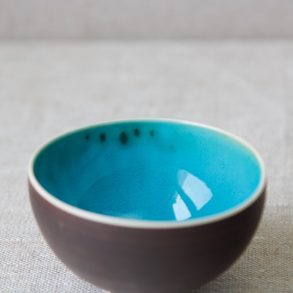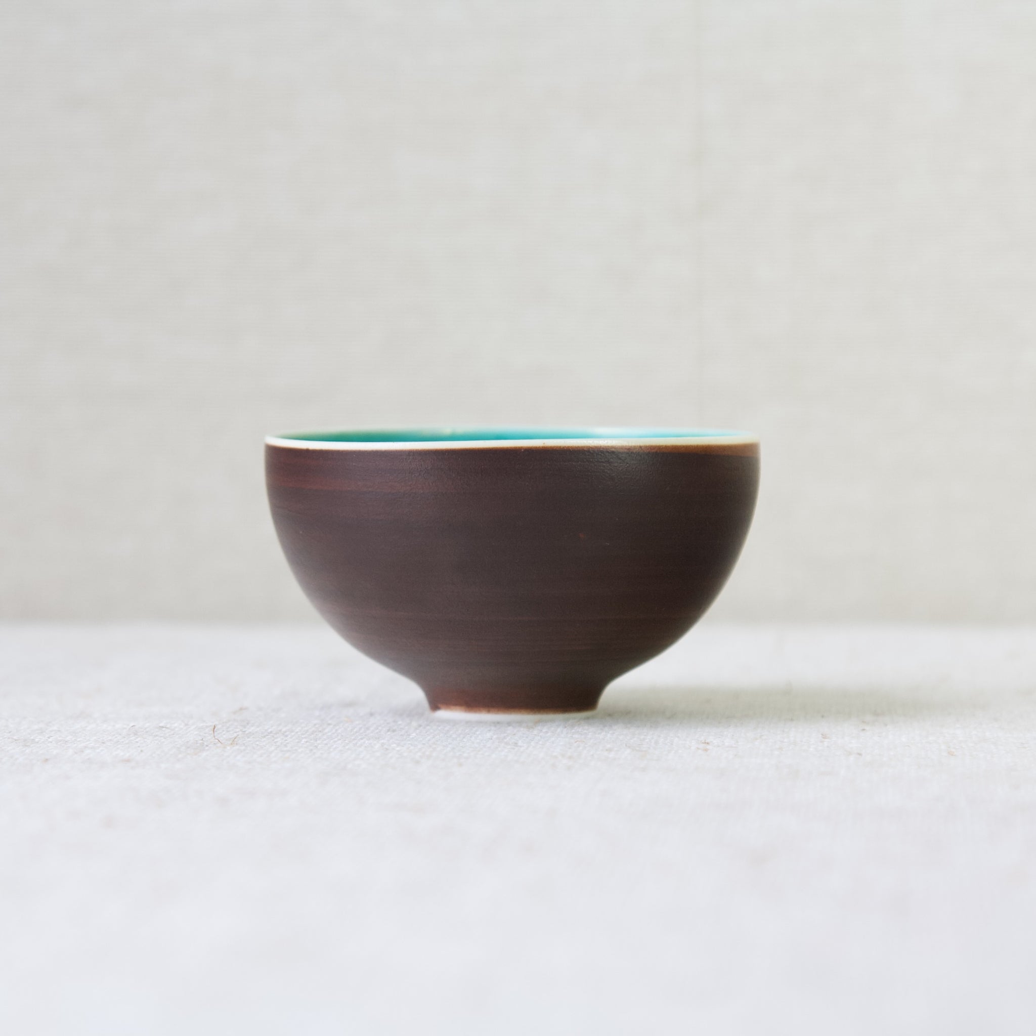 The interior of this delicate piece has been glazed with a vibrant turquoise blue. The intense colour has been achieved with a highly pigmented yet semi-transparent gloss glaze, which allows the white of the porcelain to shine through. In high contrast, a matte dark brown has been applied to the bowl's exterior. Although uniform in colour, the glaze has visible brushstrokes which contributes to the handmade character of this object. The bowl's rim is beautifully highlighted with a delicate line of bright white.