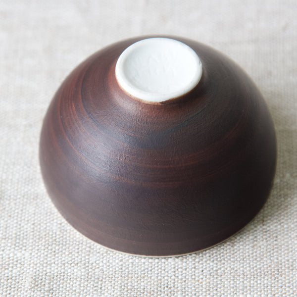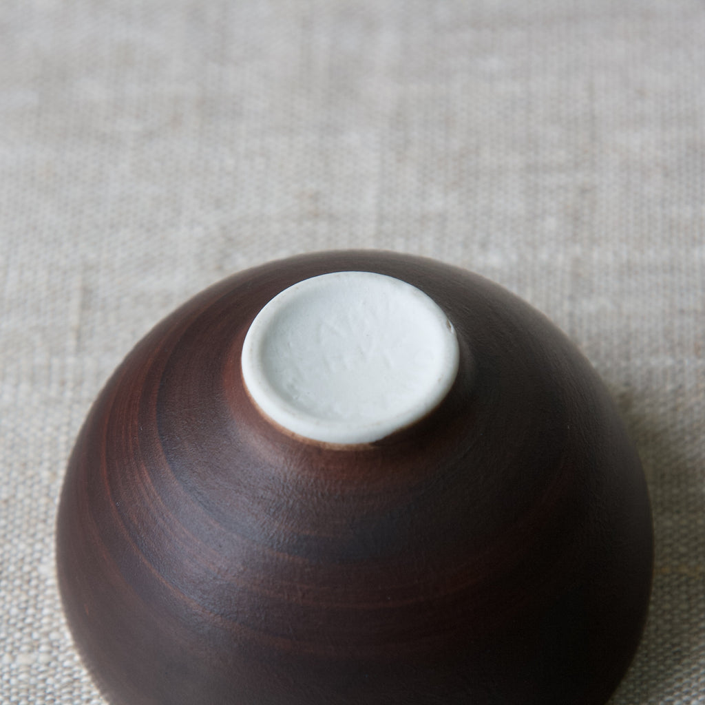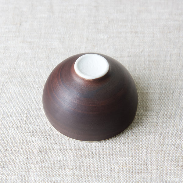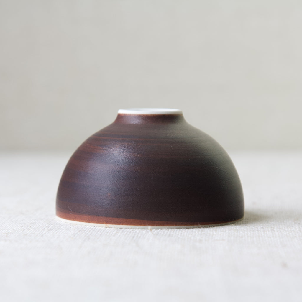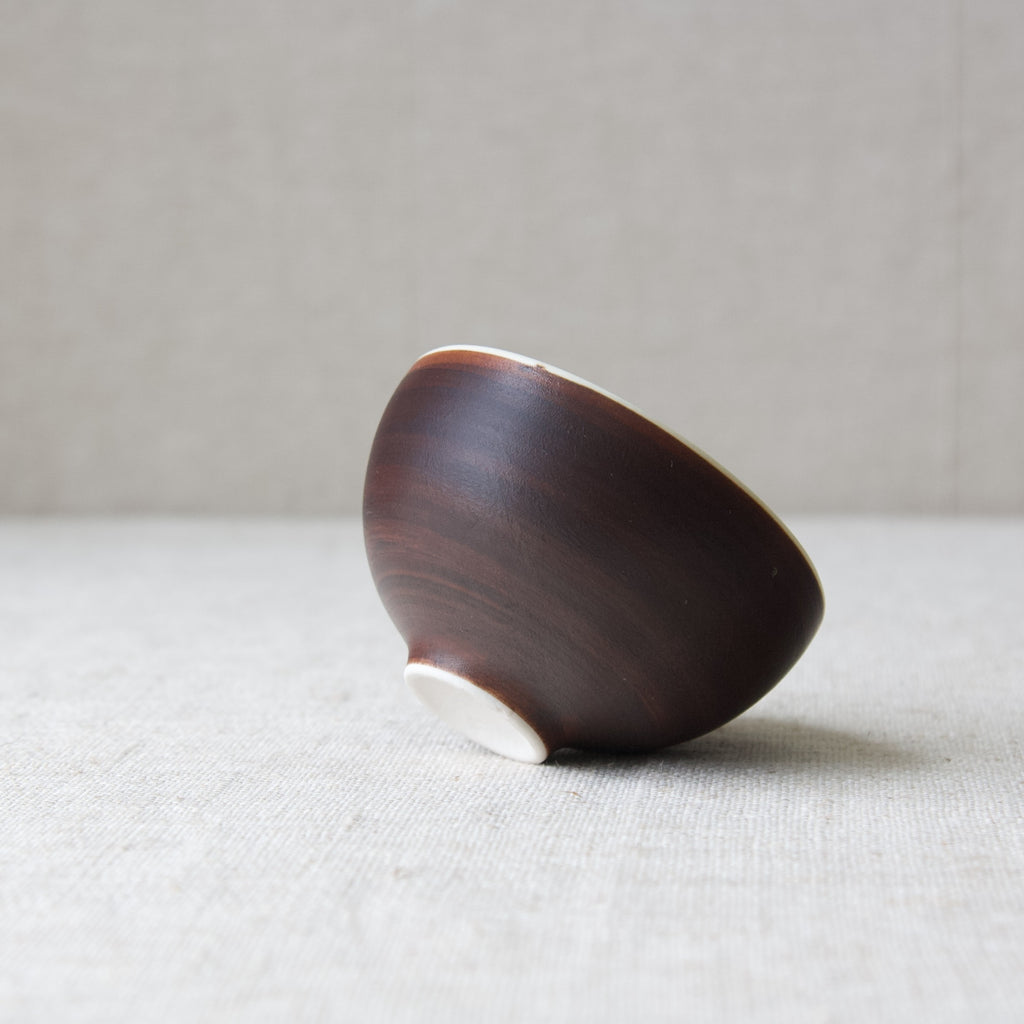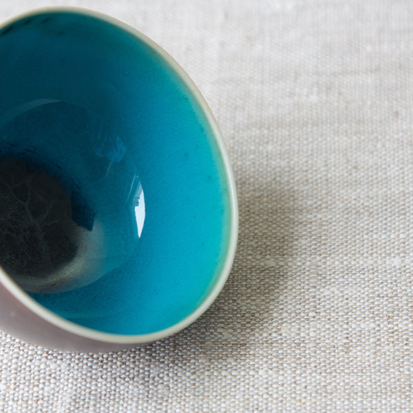 The interior of this delicate piece has been glazed with a vibrant turquoise blue. The intense colour has been achieved with a highly pigmented yet semi-transparent gloss glaze, which allows the white of the porcelain to shine through. In high contrast, a matte dark brown has been applied to the bowl's exterior. Although uniform in colour, the glaze has visible brushstrokes which contributes to the handmade character of this object. The bowl's rim is beautifully highlighted with a delicate line of bright white.