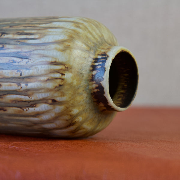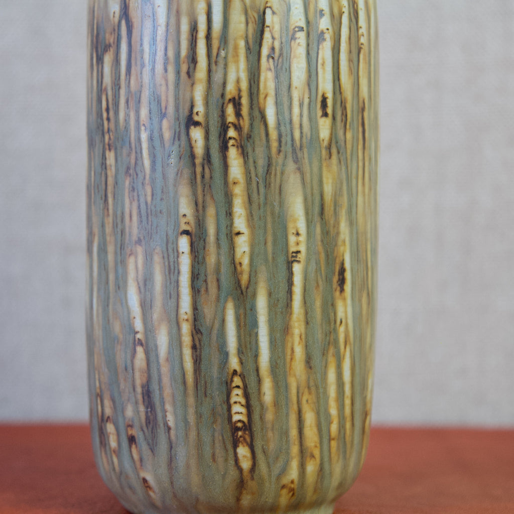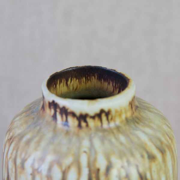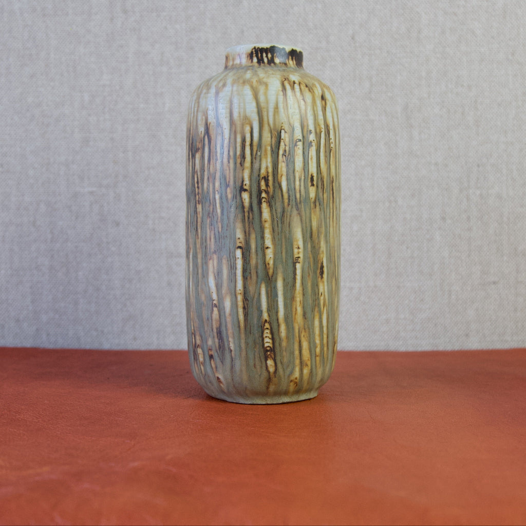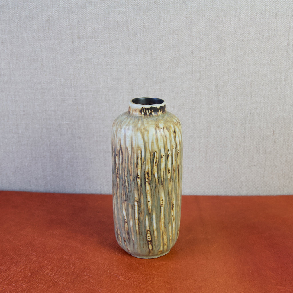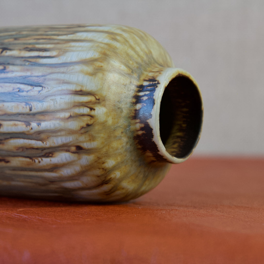 The name 'Birka' refers to the glaze on this vase. The shape, which is model number 5, was also used for the 'Alpina' (gray/blue glaze) and 'Rubus' (blue/brown glaze) series. These 3 series of glazes share the same forms and were all designed in 1965.