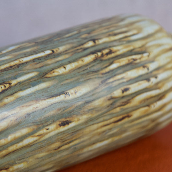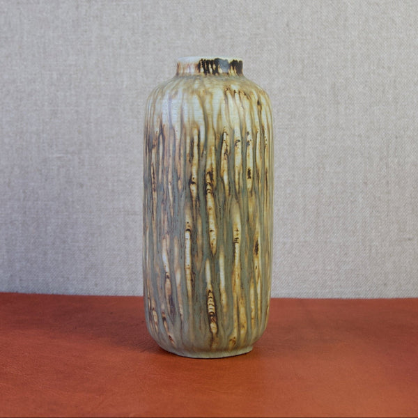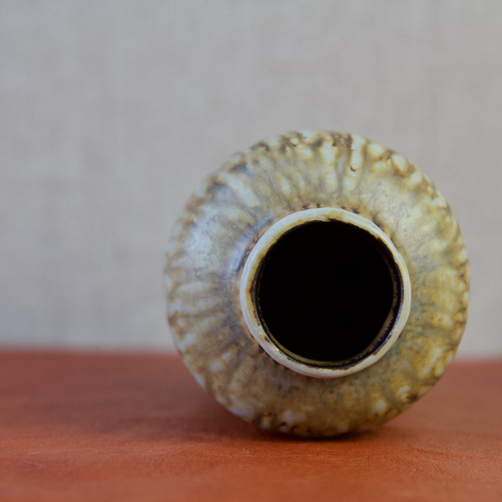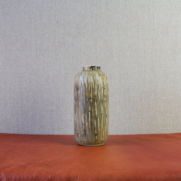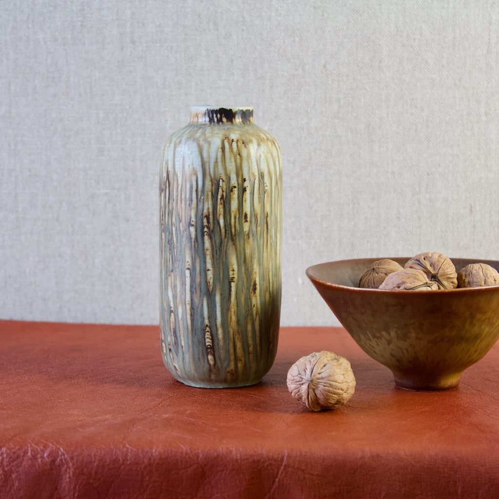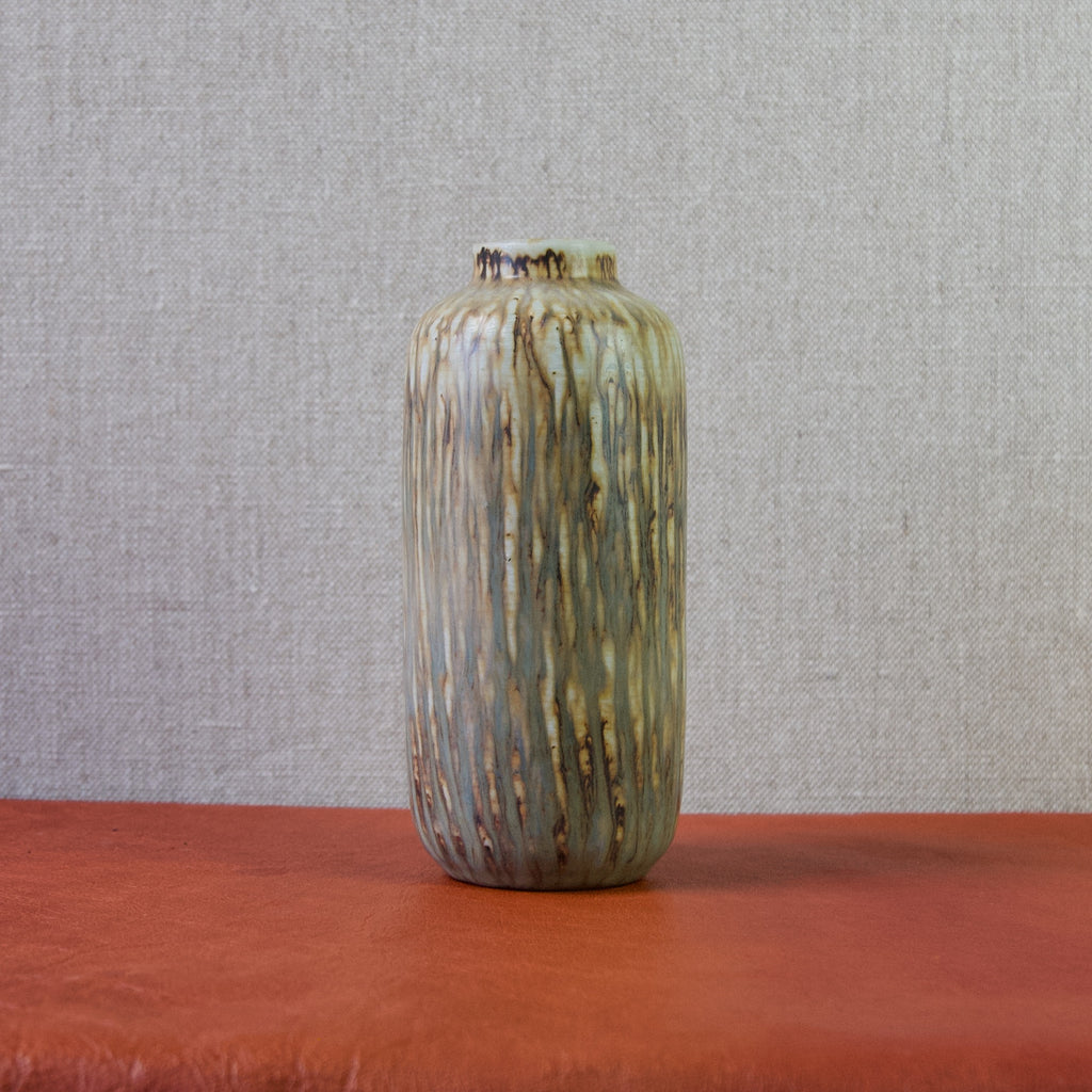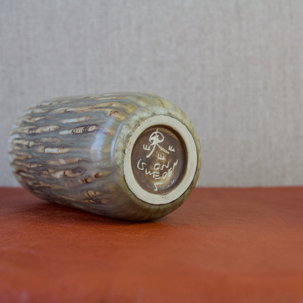 The name 'Birka' refers to the glaze on this vase. The shape, which is model number 5, was also used for the 'Alpina' (gray/blue glaze) and 'Rubus' (blue/brown glaze) series. These 3 series of glazes share the same forms and were all designed in 1965.