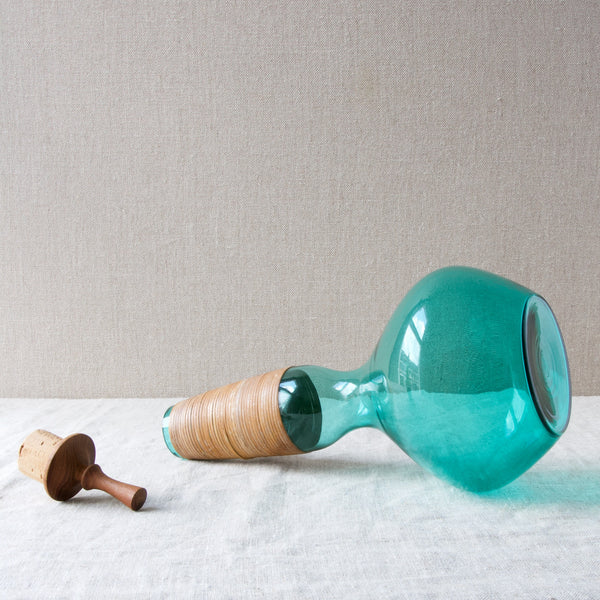 Mid Century Modern aqua green glass decanter with teak stopper and rattan grip designed by Jacob Bang for Holmegaard Kastrup