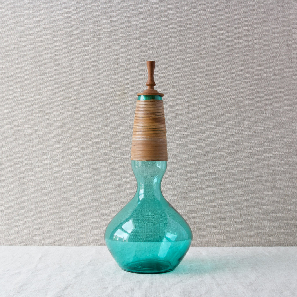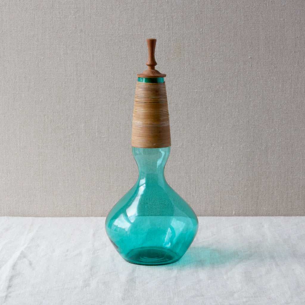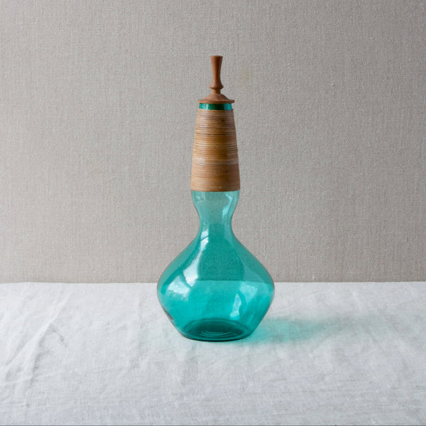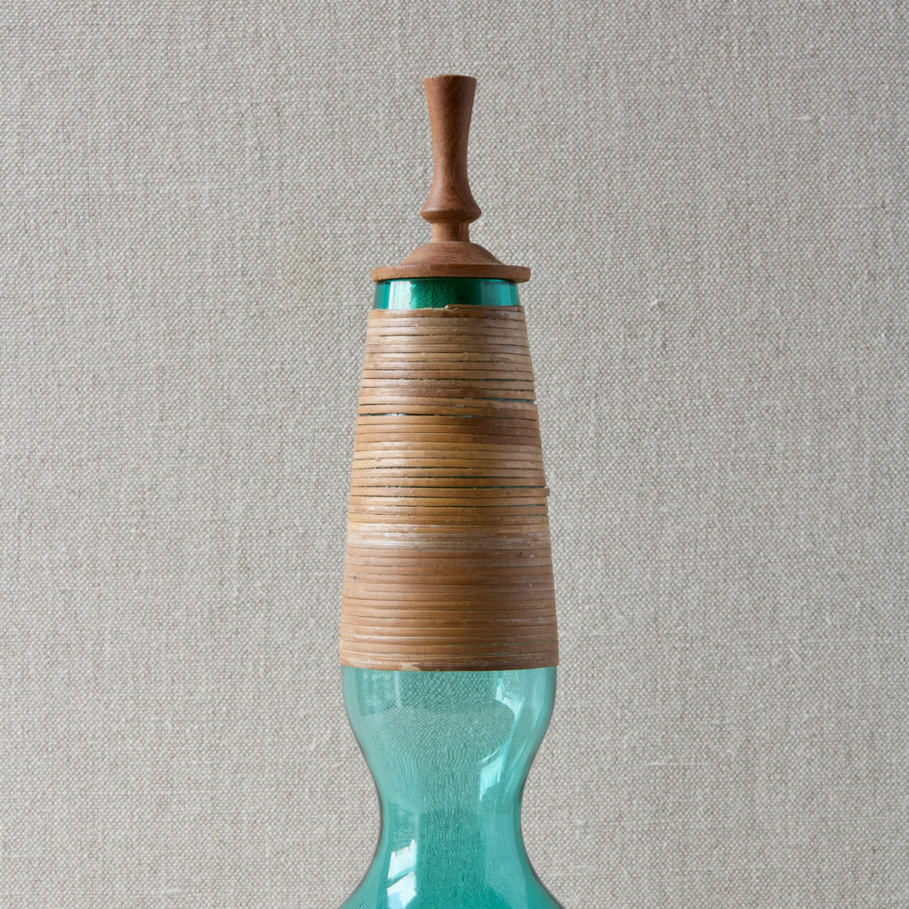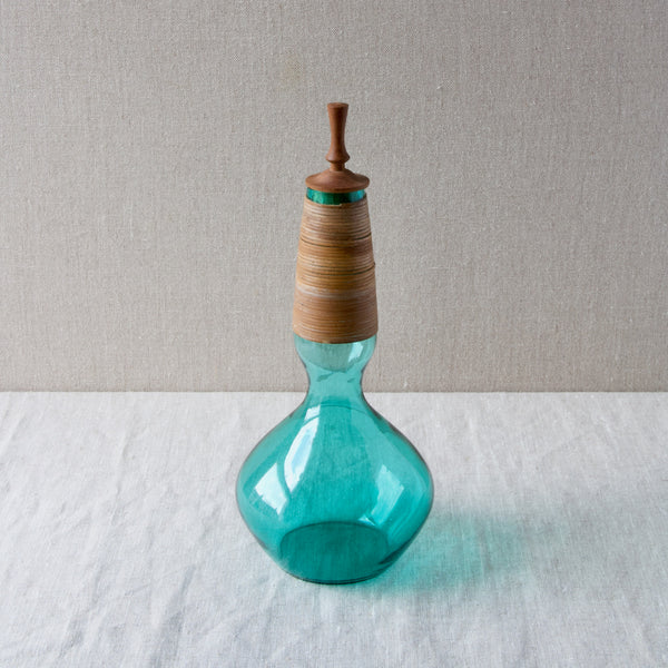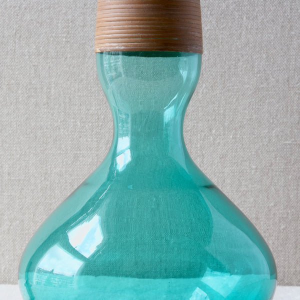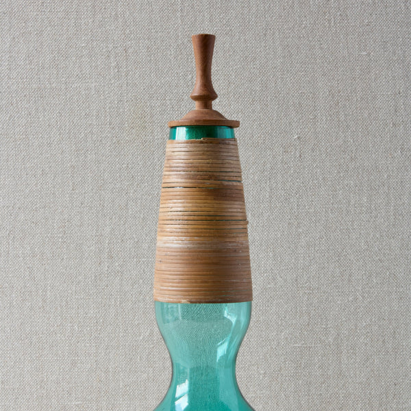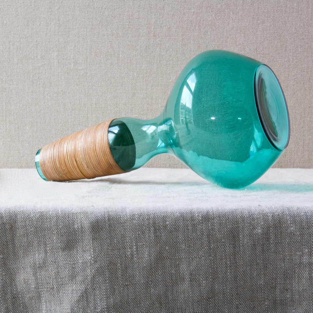 Detail of Danish rattan collar on green blue glass decanter by Jacob Bang