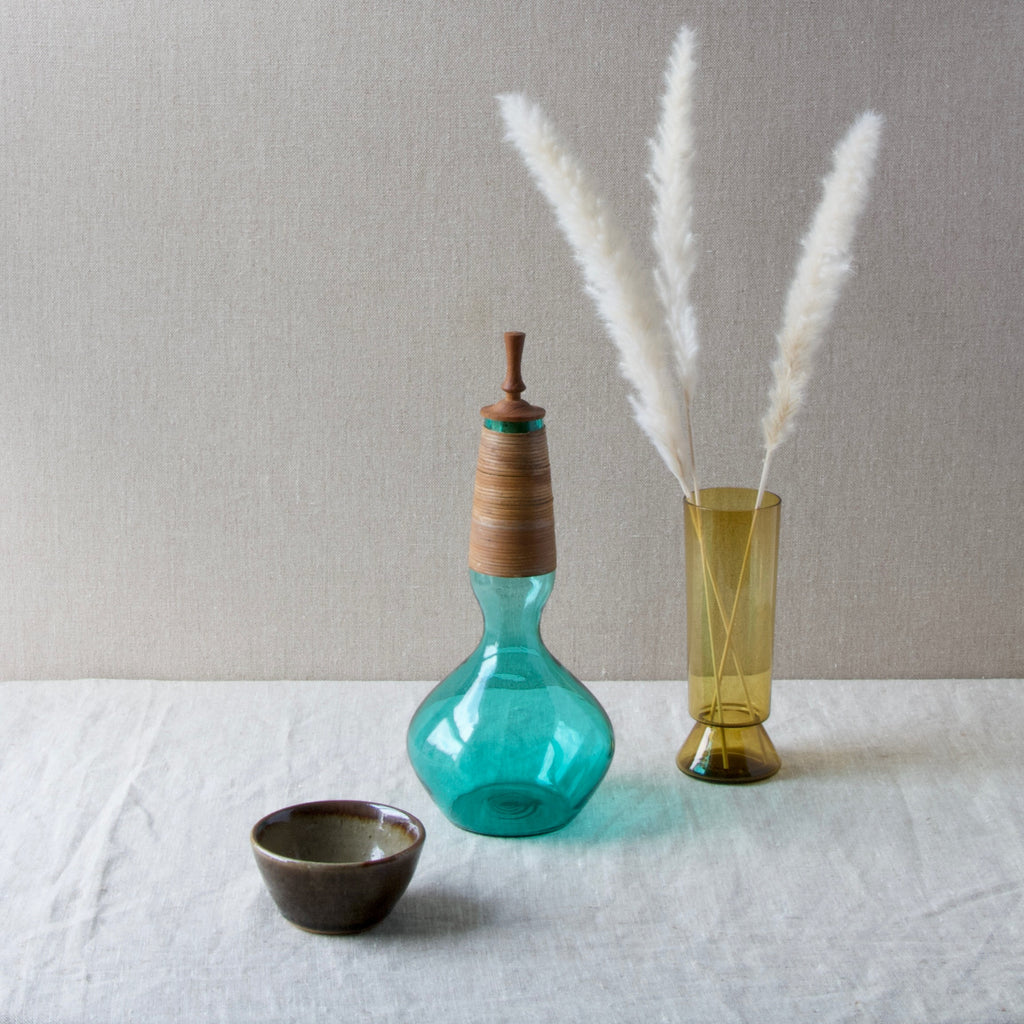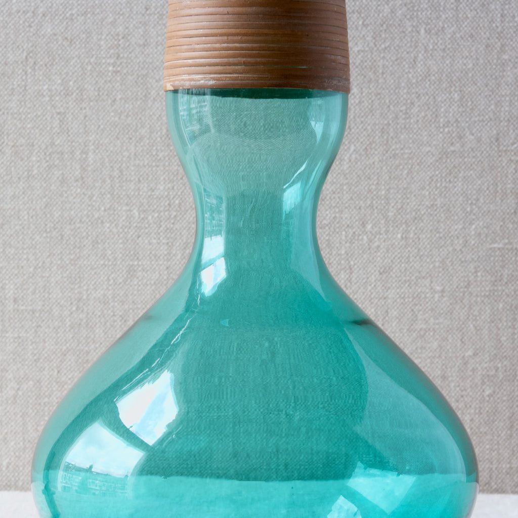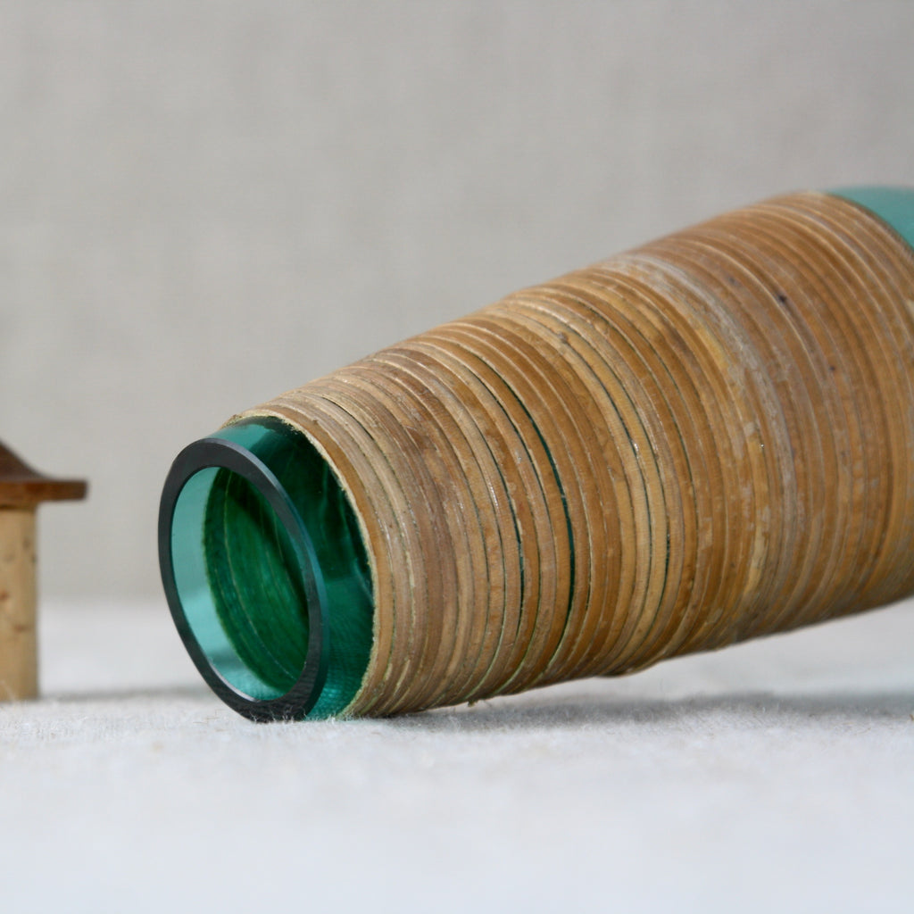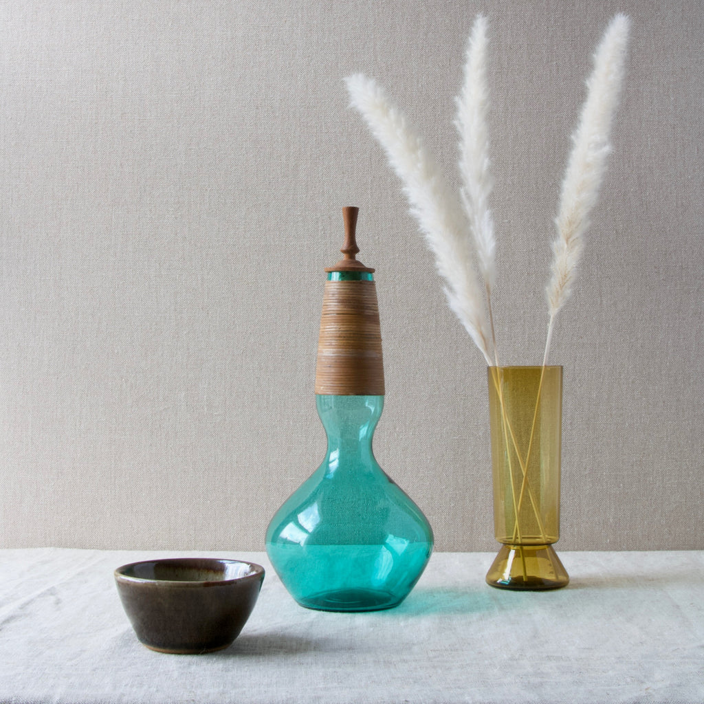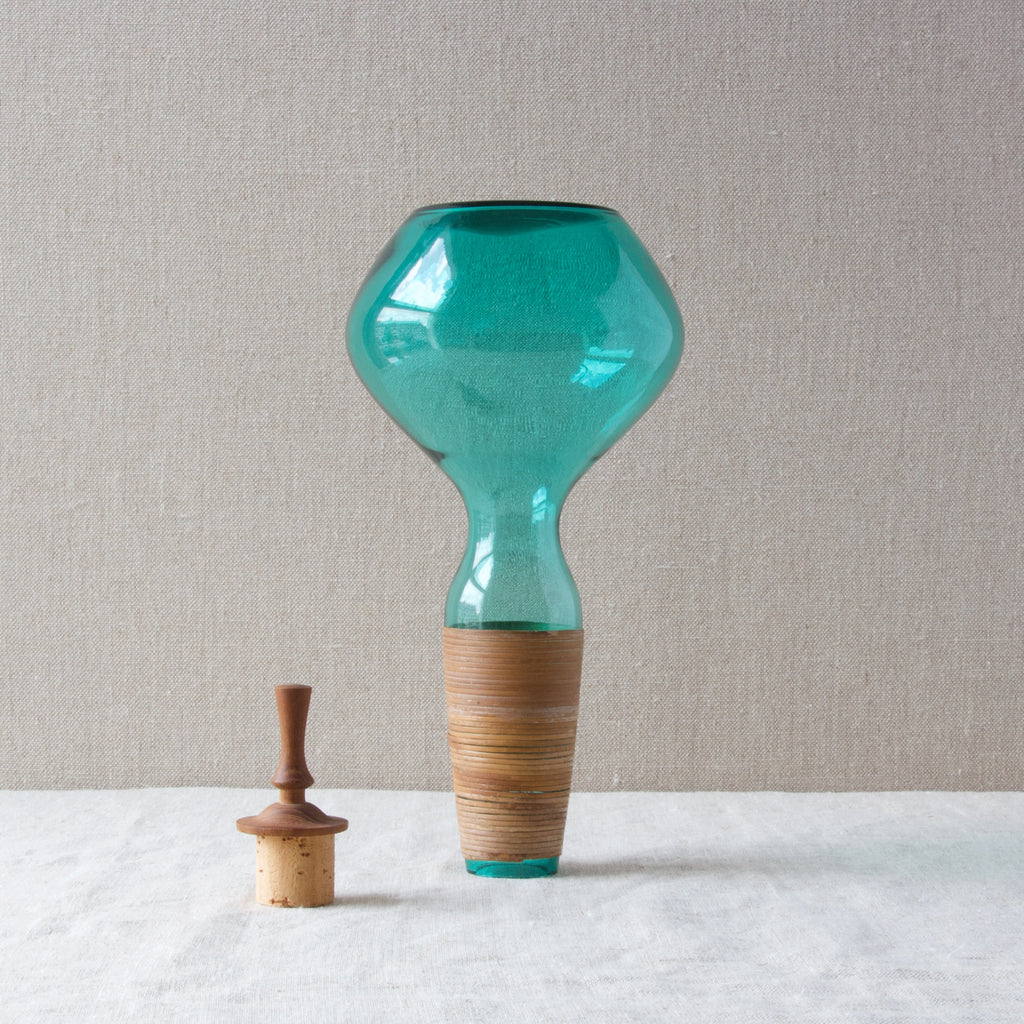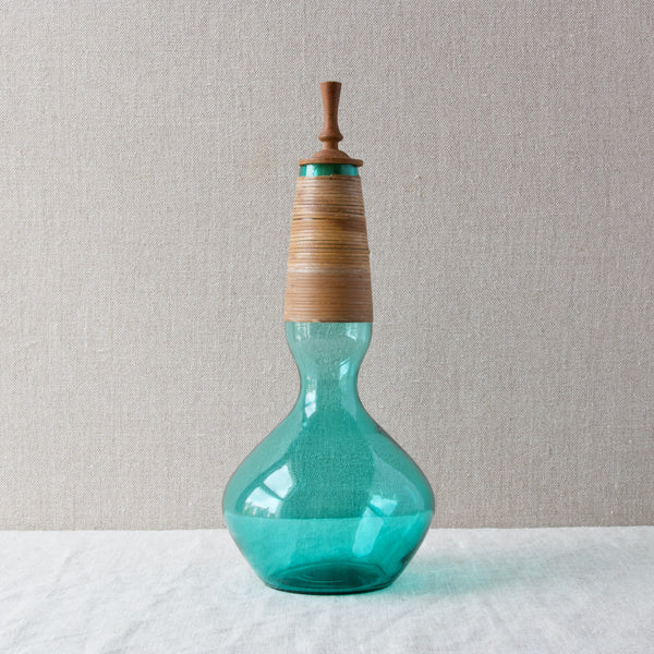 Detail of Danish rattan collar on green blue glass decanter by Jacob Bang
