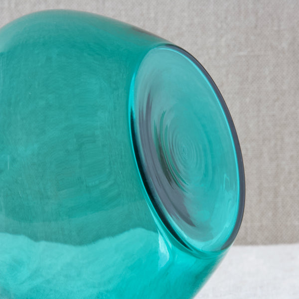 Upturned aqua green decanter by Jacob Bang for Holmegaard Kastrup with teak stopper with cork