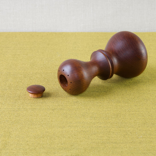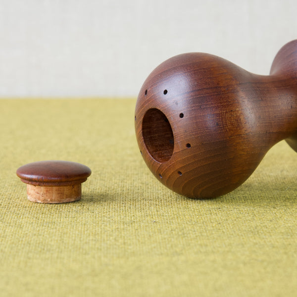 The top section, as with most of Quistgaard's mills, holds salt, where the large button-like stopper is secured by a cork. Peppercorns are stored and grinded in the lower half.
