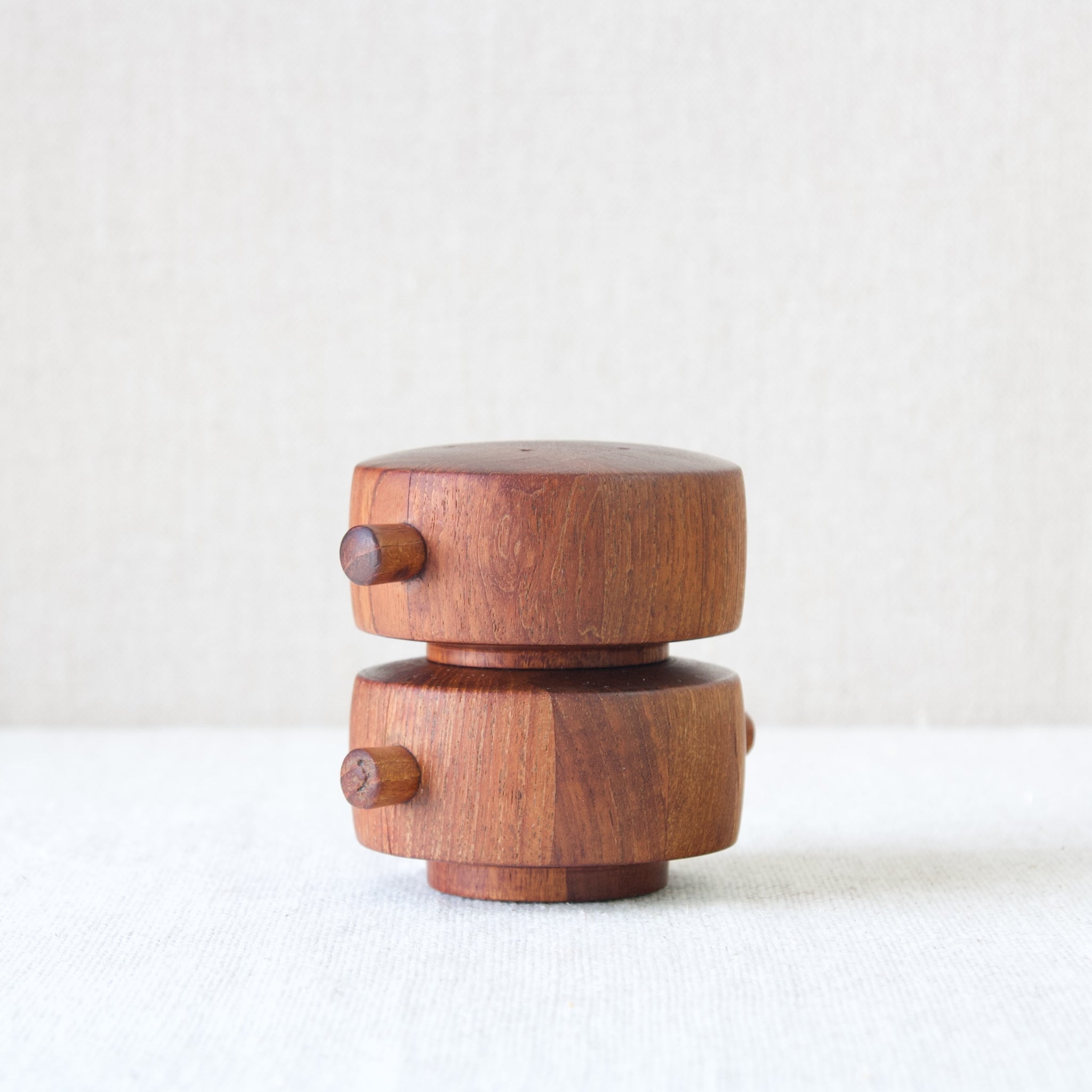 A carved staved teak salt and pepper mill, reminiscent of stacked drums or barrels, designed by Jens Quistgaard for Dansk and produced in Denmark. Quistgaard designed his eminently collectable series of combination salt shaker pepper mills between the late 1950's and early 1960's.