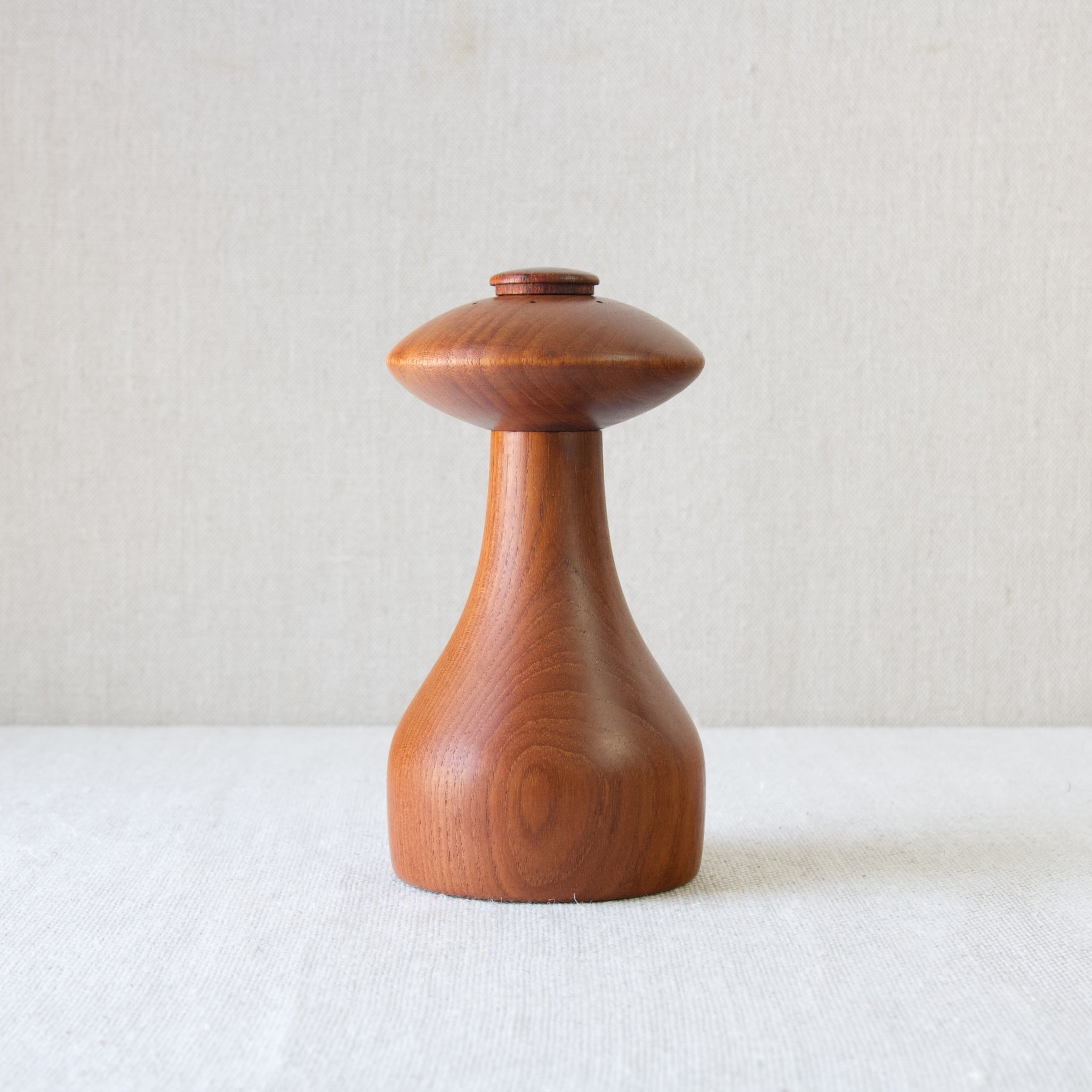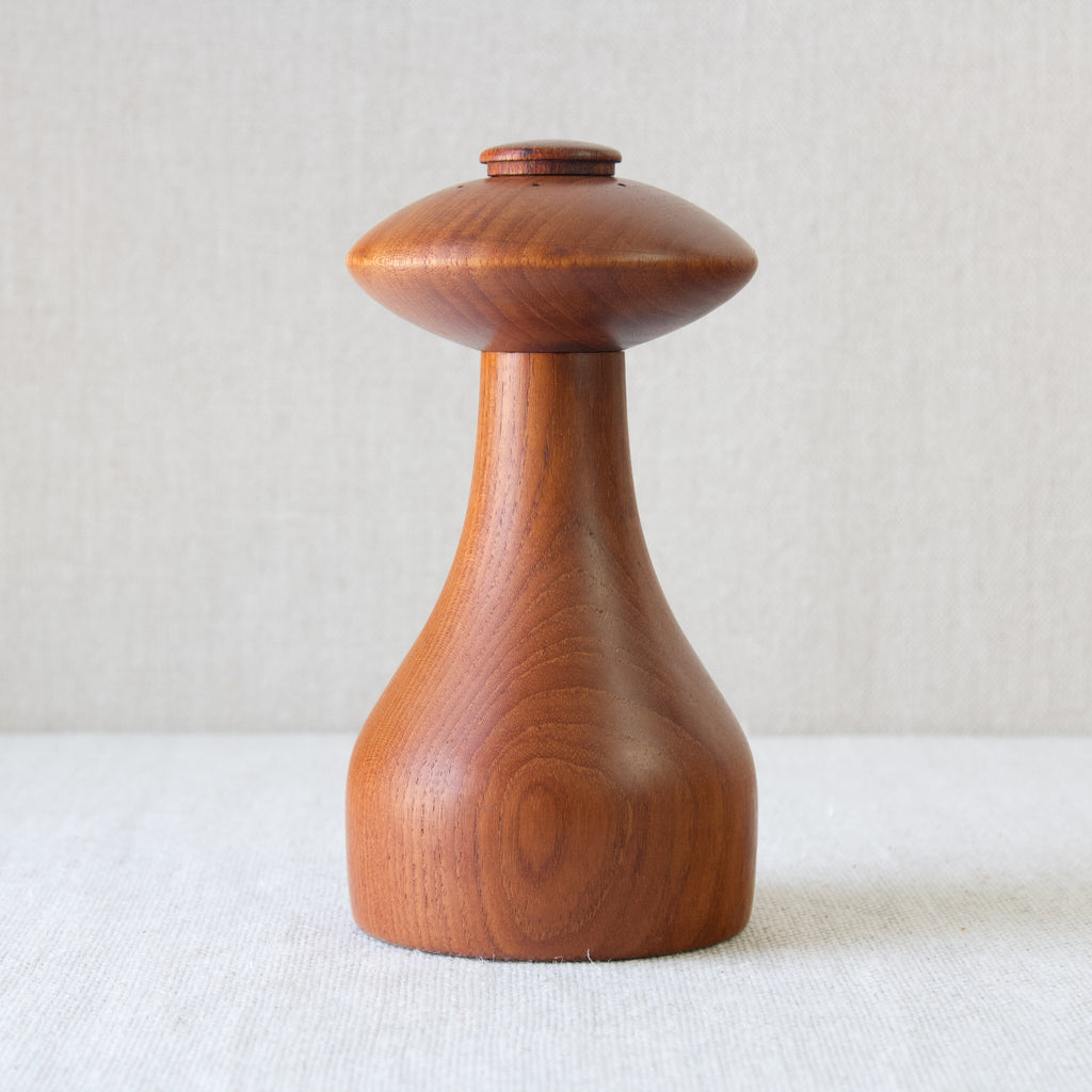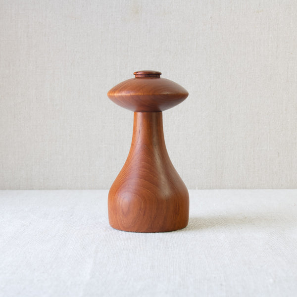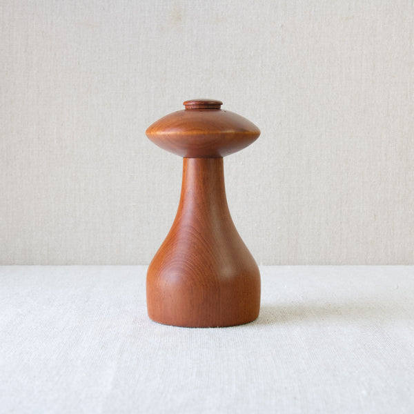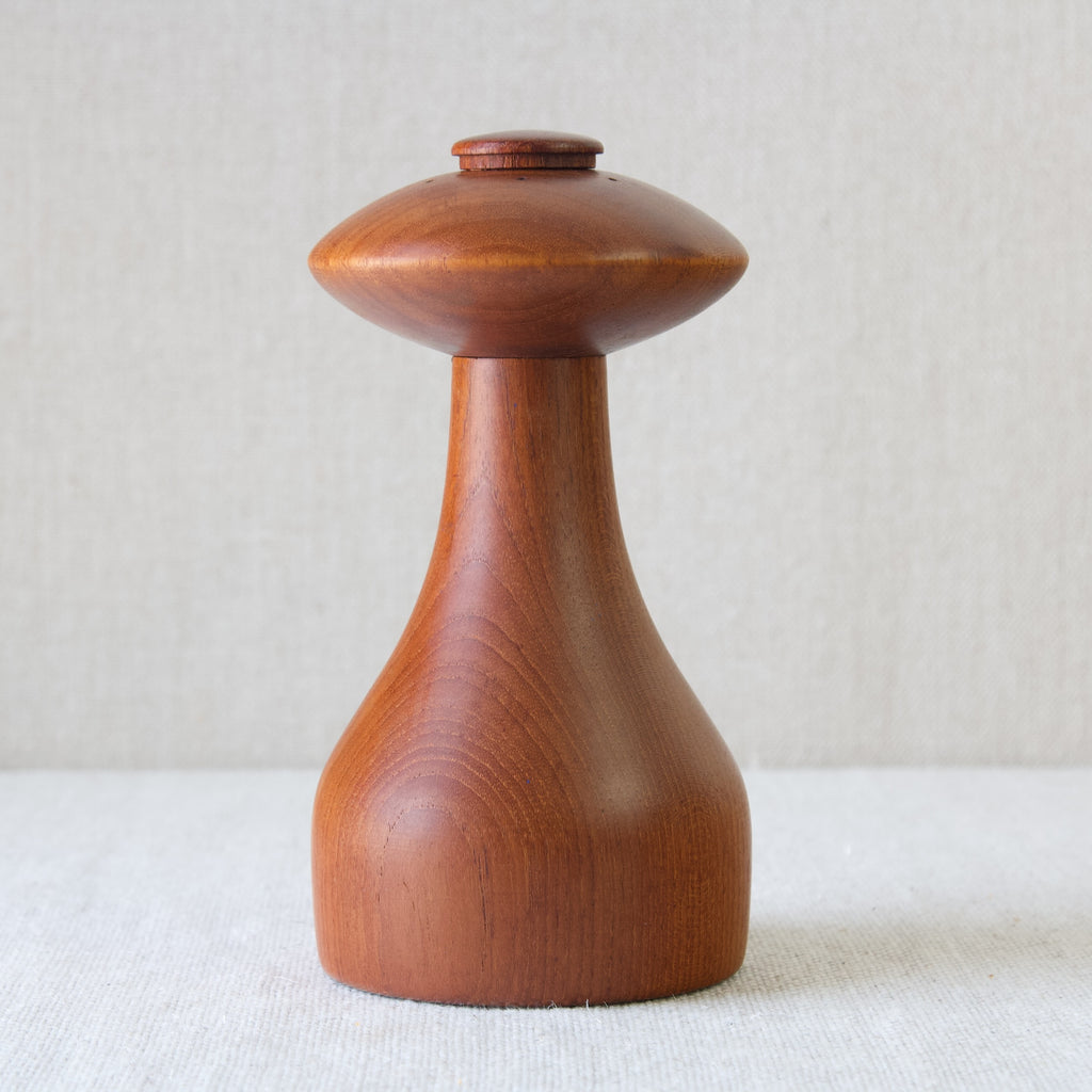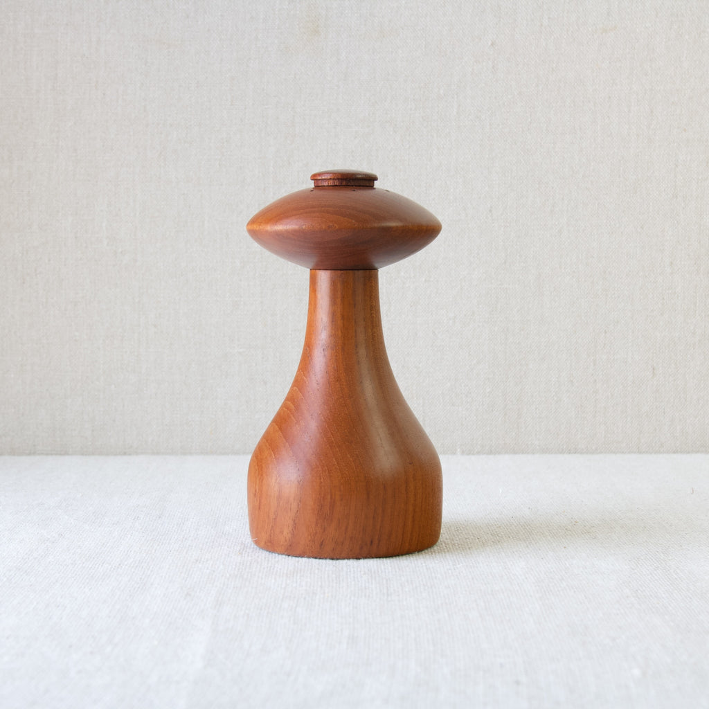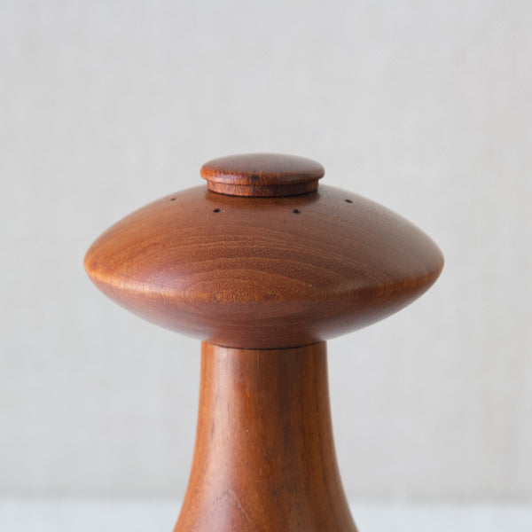 A carved solid teak salt and pepper mill, reminiscent of a mushroom or UFO, designed by Jens Quistgaard for Dansk.