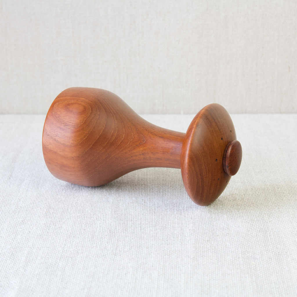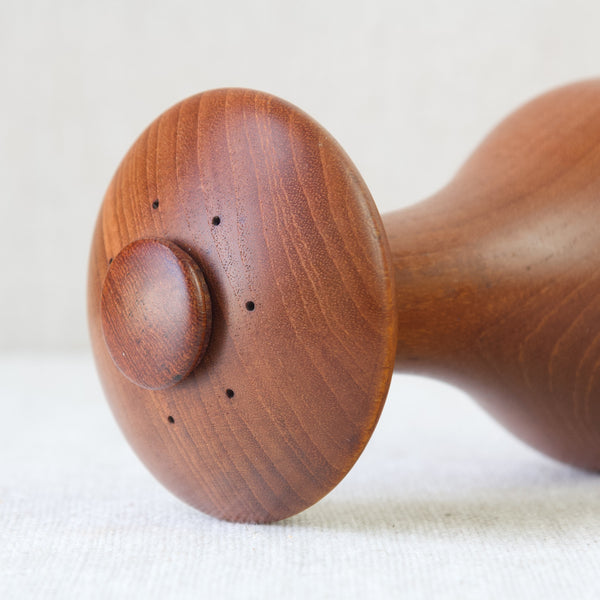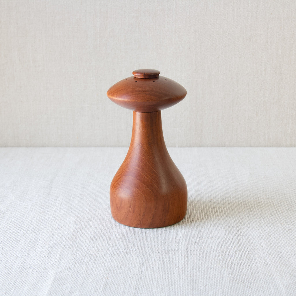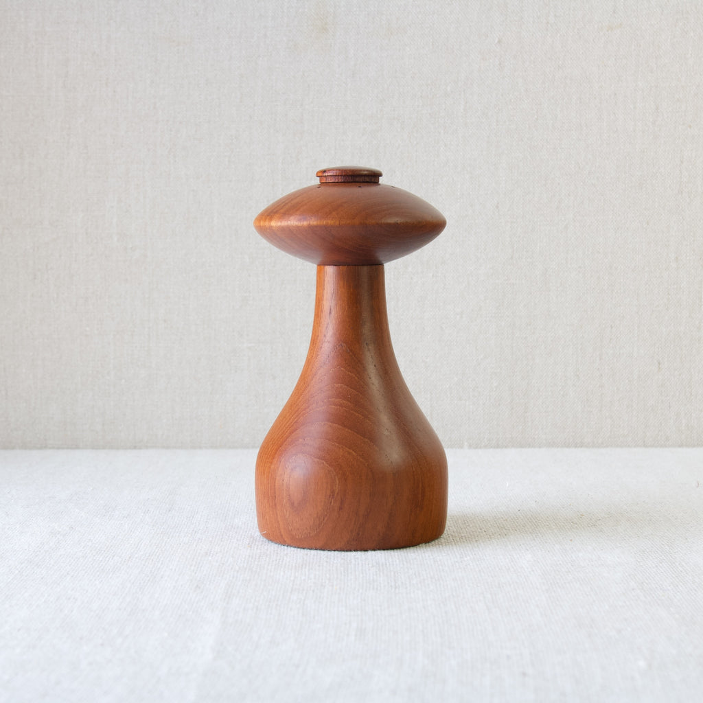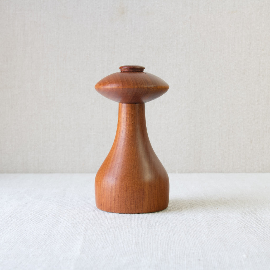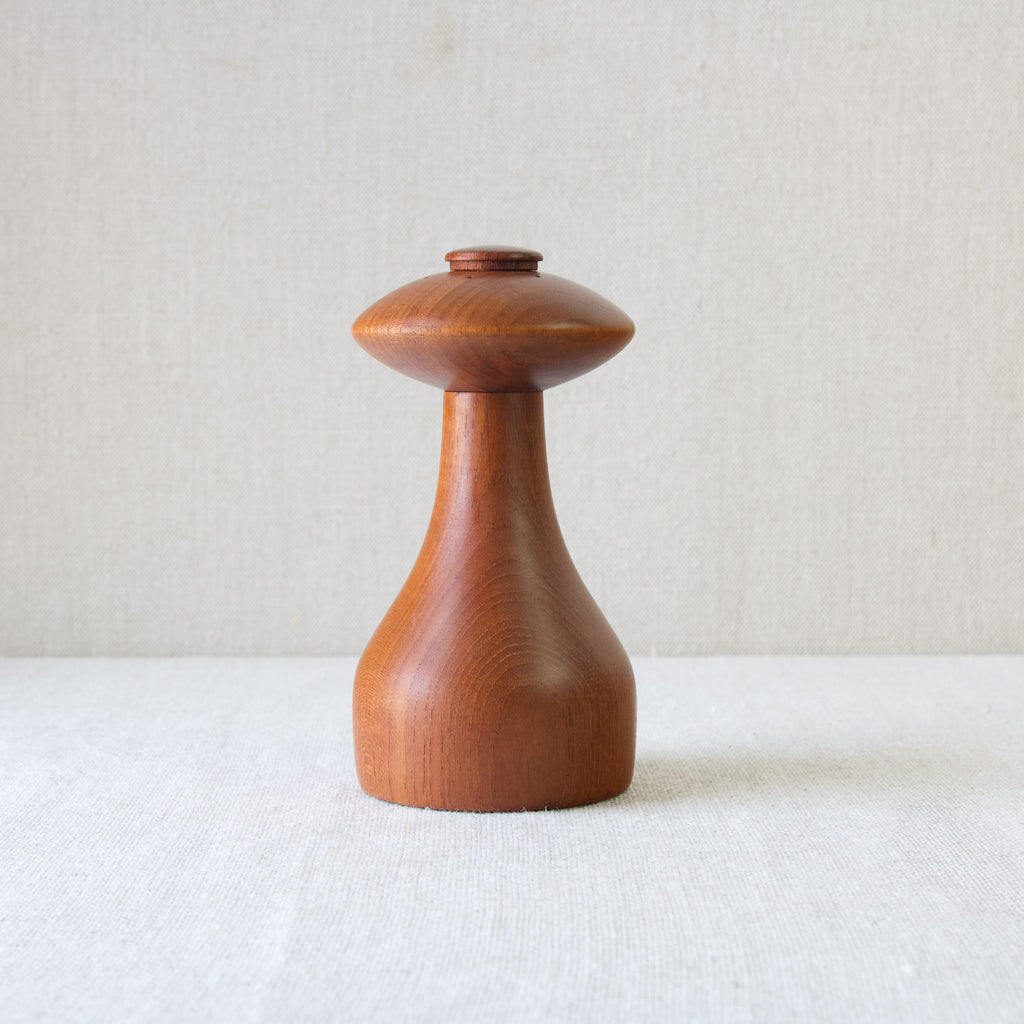 A carved solid teak salt and pepper mill, reminiscent of a mushroom or UFO, designed by Jens Quistgaard for Dansk.