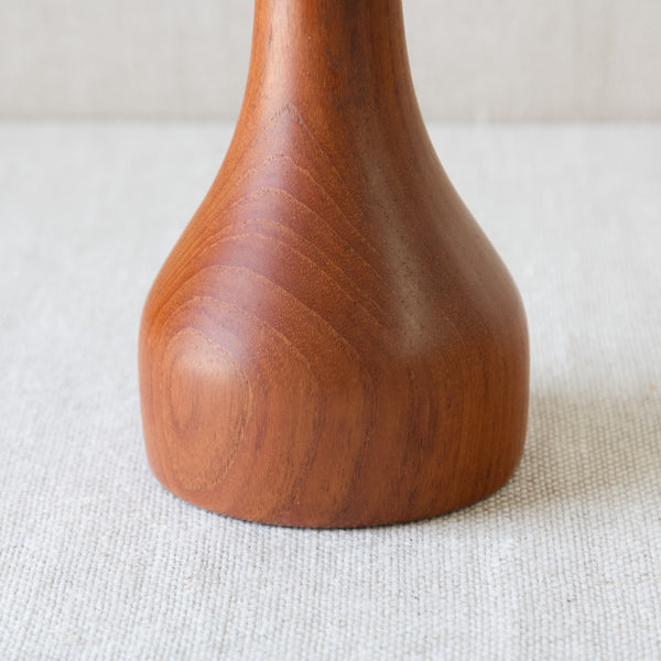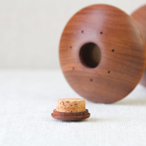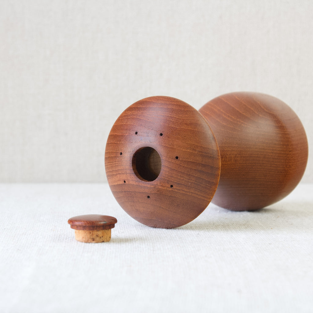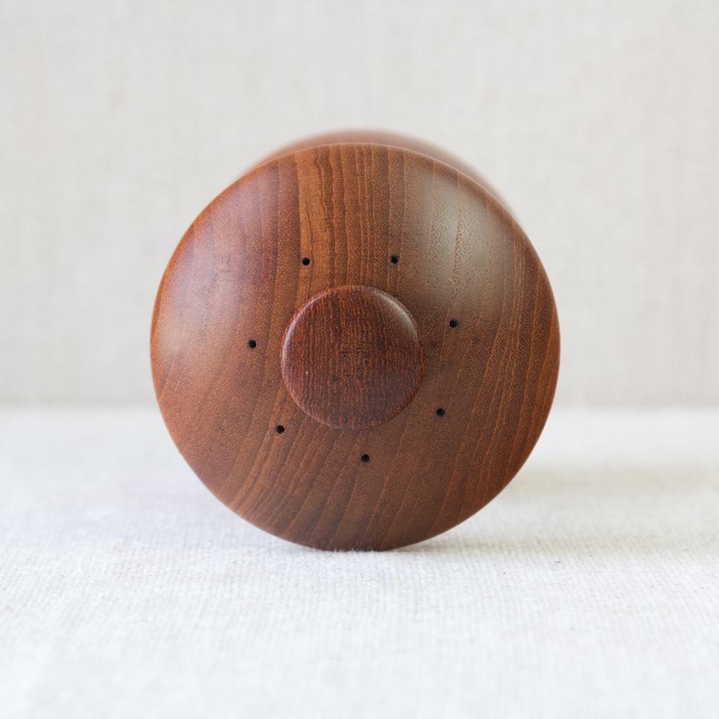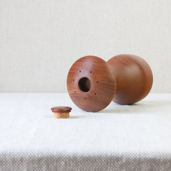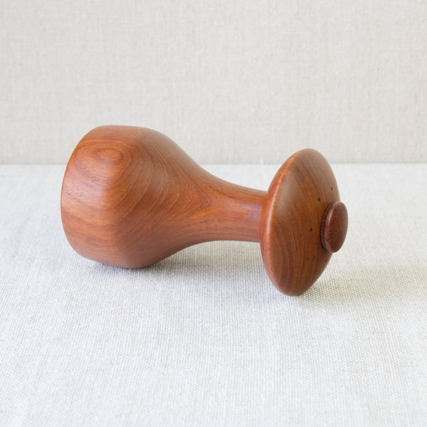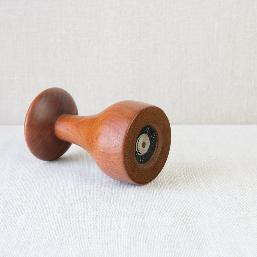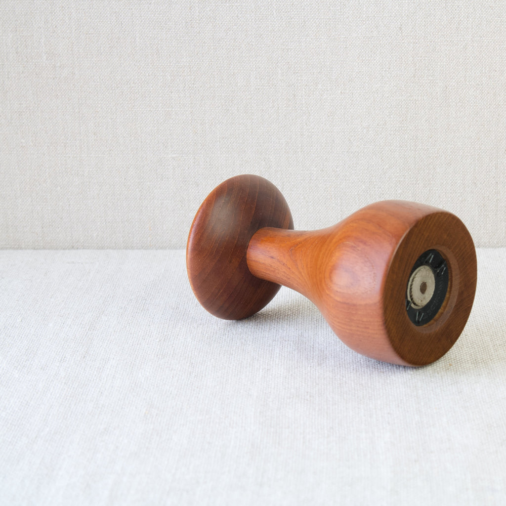 A carved solid teak salt and pepper mill, reminiscent of a mushroom or UFO, designed by Jens Quistgaard for Dansk.
