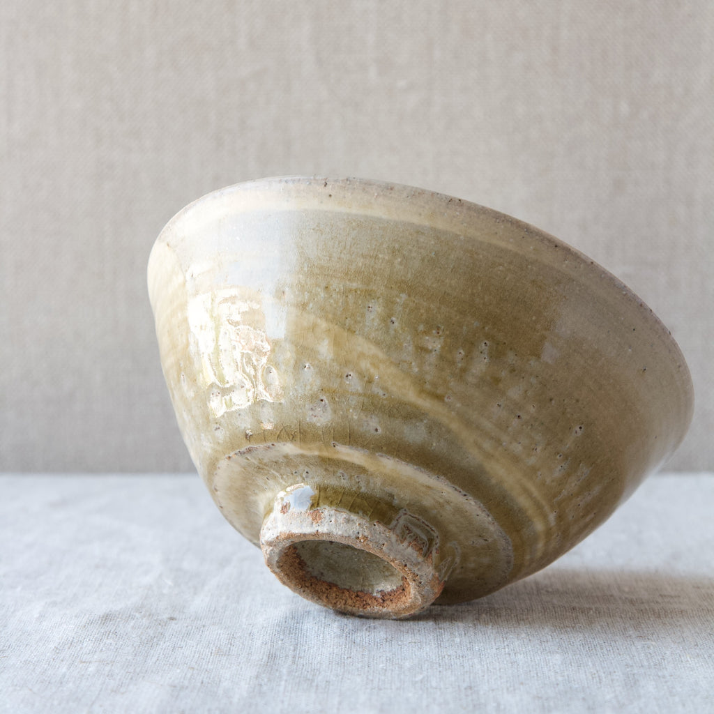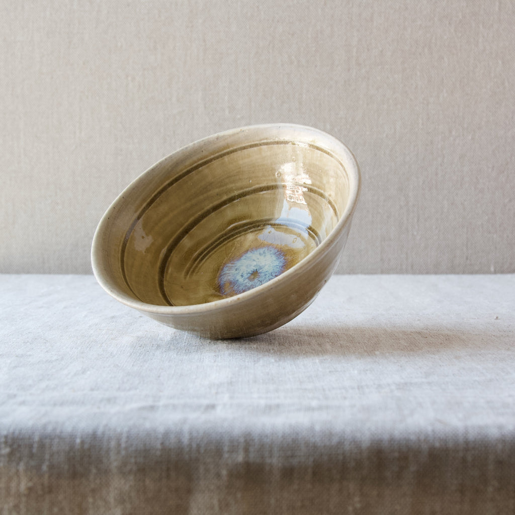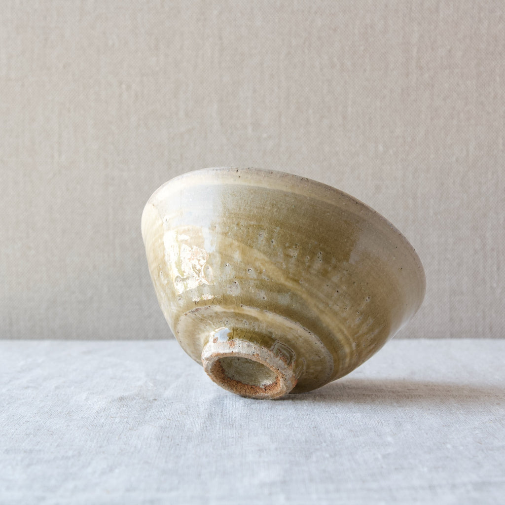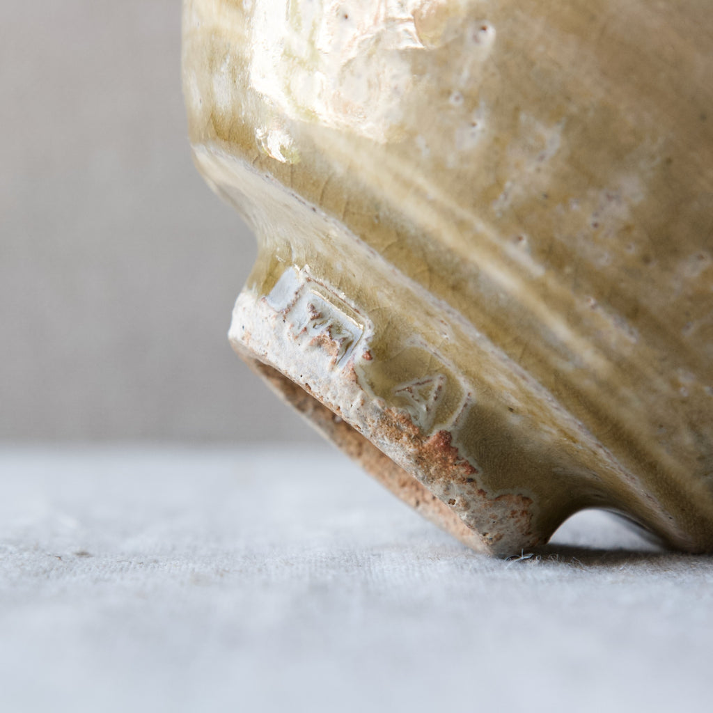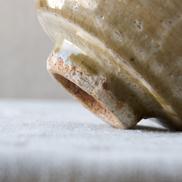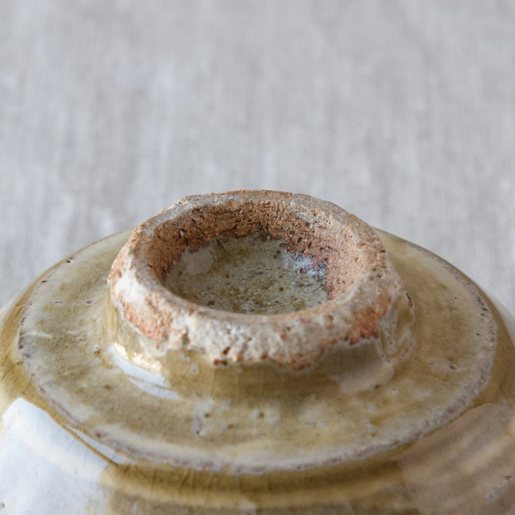 Within the channel of the spiral, the nuka glaze has been caught and created pools of glass in a warm-green colour. This ochre-sage-green has most probably been achieved by sycamore wood ash.